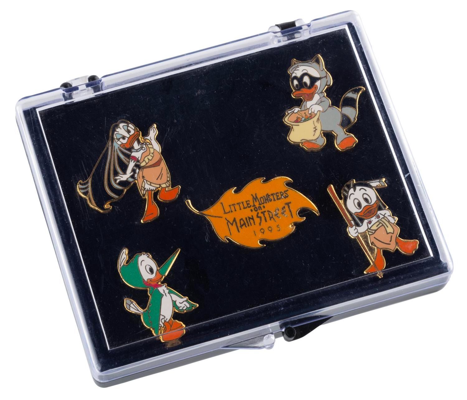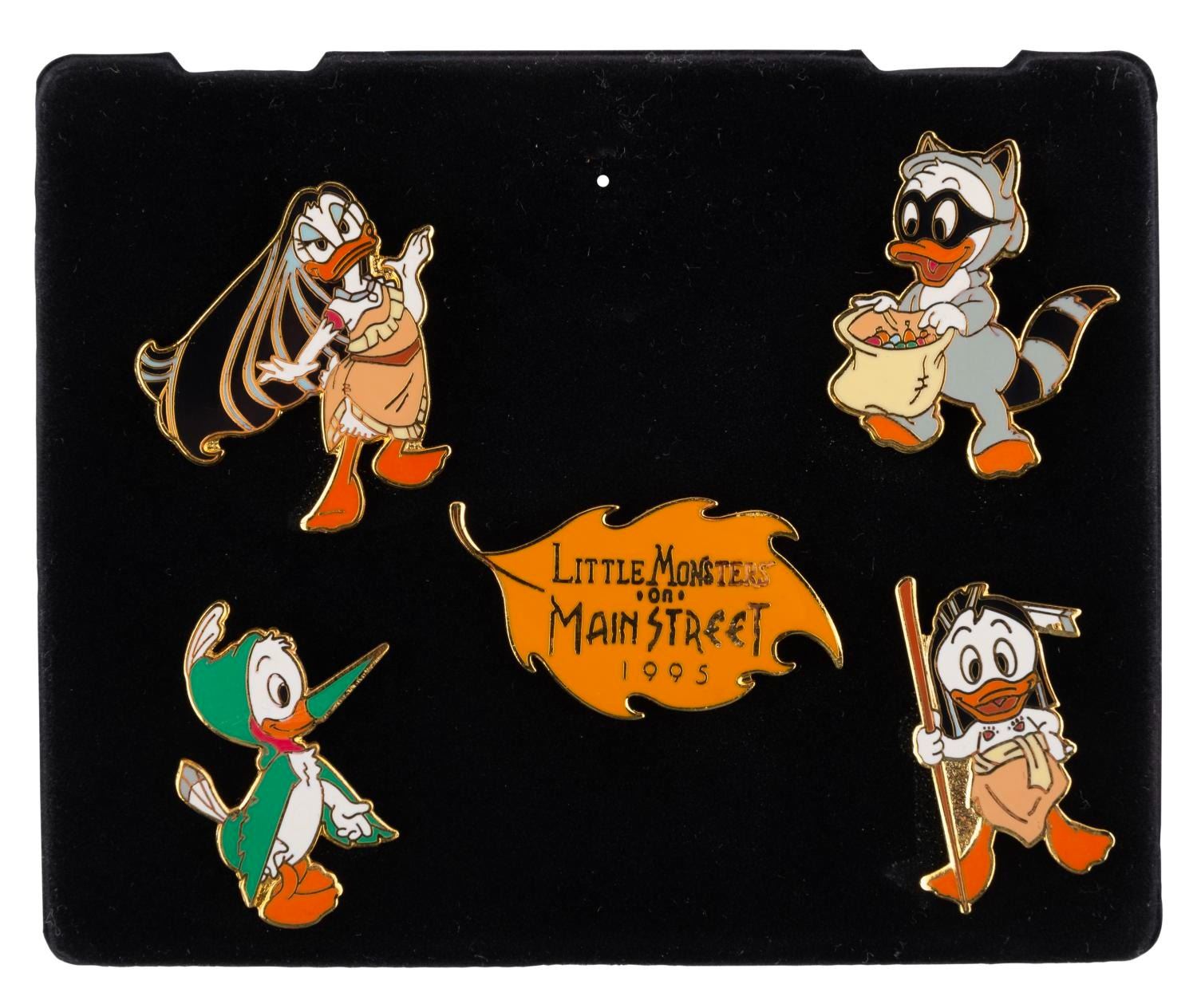 (Disneyland, 1995) A five-piece pin set from the Little Monsters on Main Street 1995 event featuring Daisy Duck, Huey, Dewey, and Louie, wearing costumes inspired by “Pocahontas.” Measuring 1.5” x 1” each, the pins are in very fine condition.