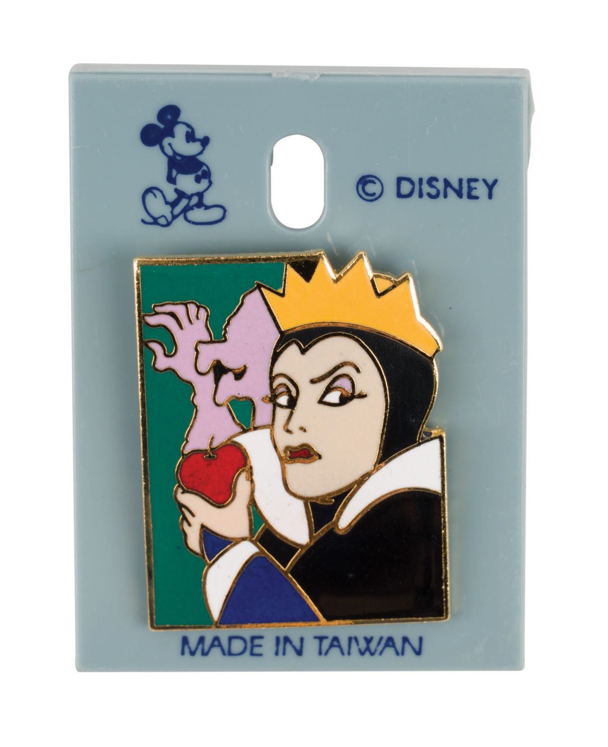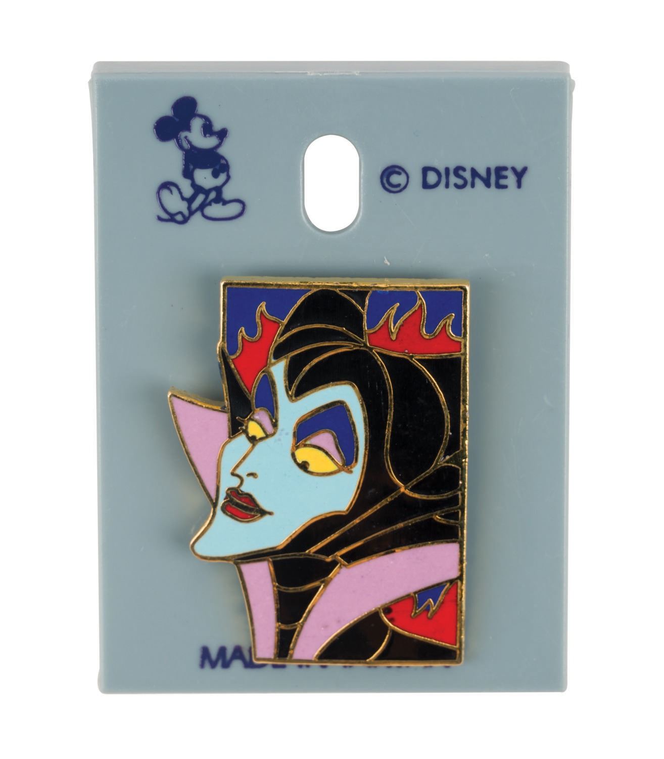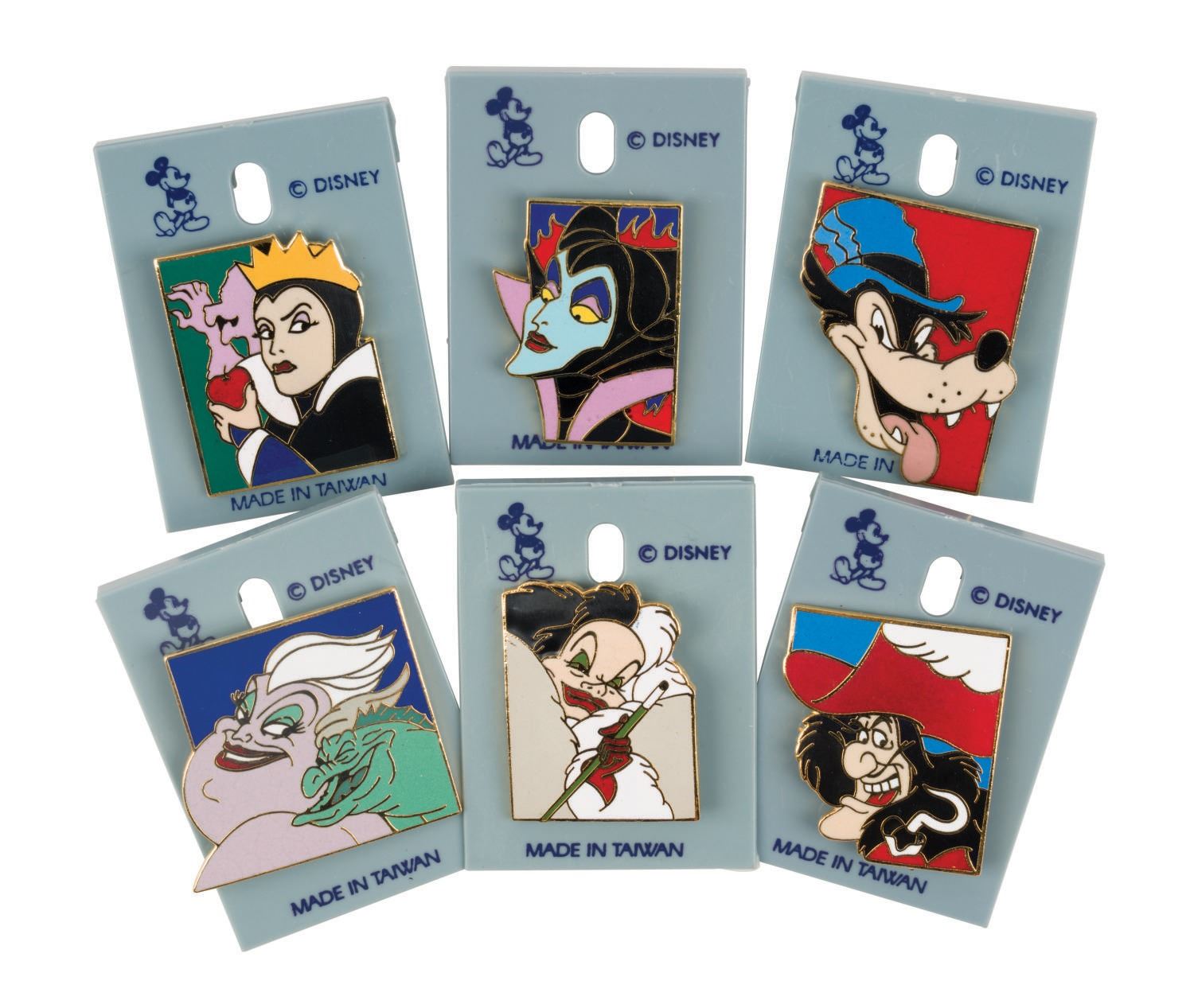 (Disney-MGM, 1990s) A set of (6) pins featuring Disney villains once available at the Villain's Shop at Disney-MGM Studios Park. Among the set are Maleficent, the Wicked Queen, Captain Hook, Cruella de Vil, Ursula, and the Big Bad Wolf on their original cards. Measuring approximately 1.25"x1.5" to 1"x1.25", the pins are in overall fine condition.