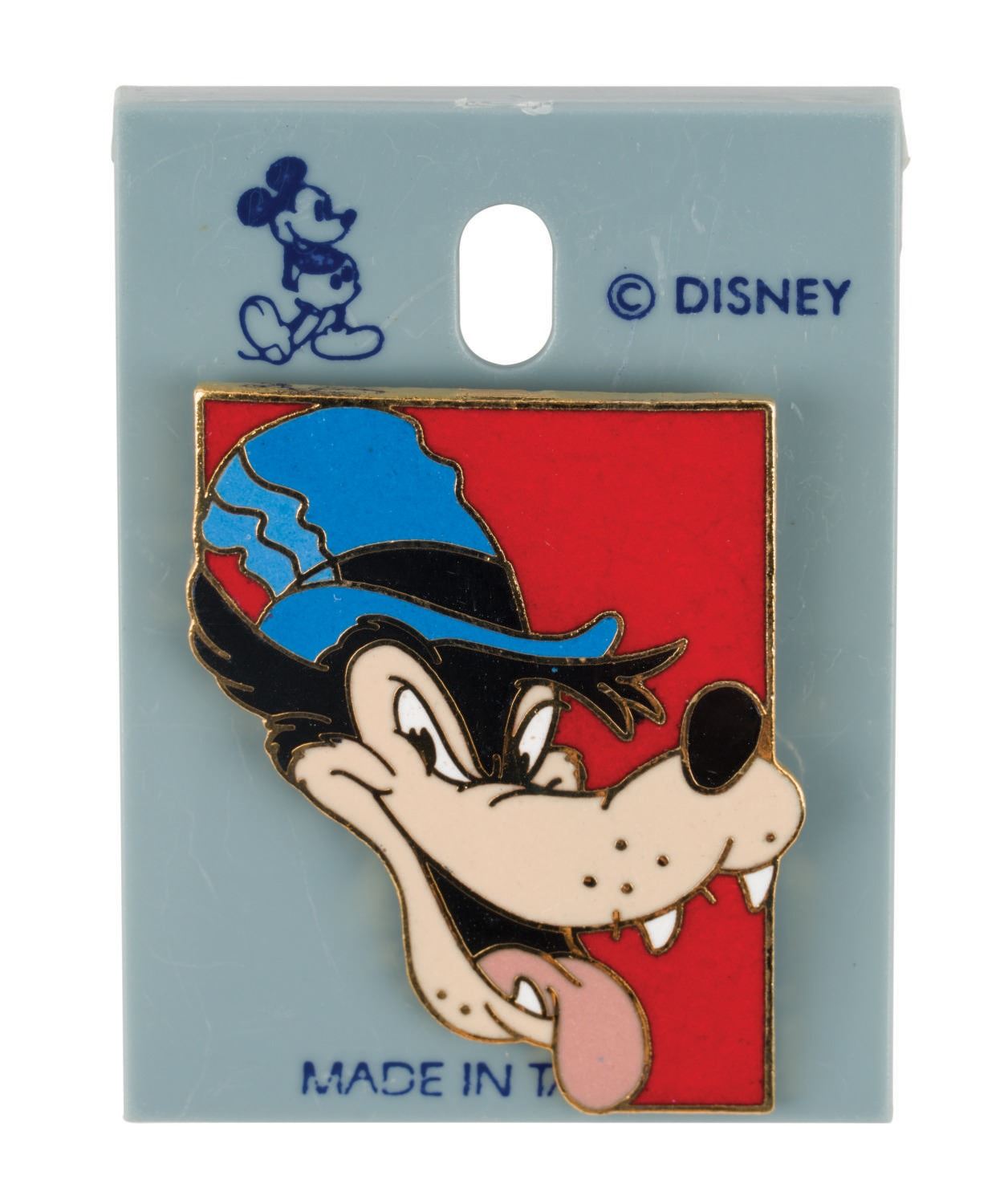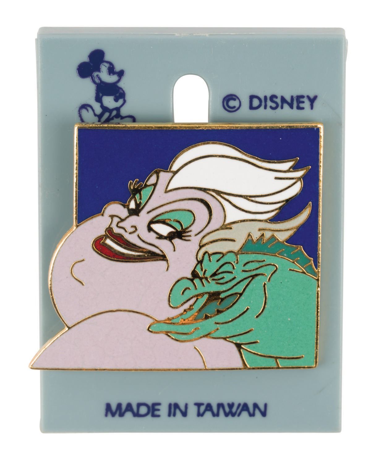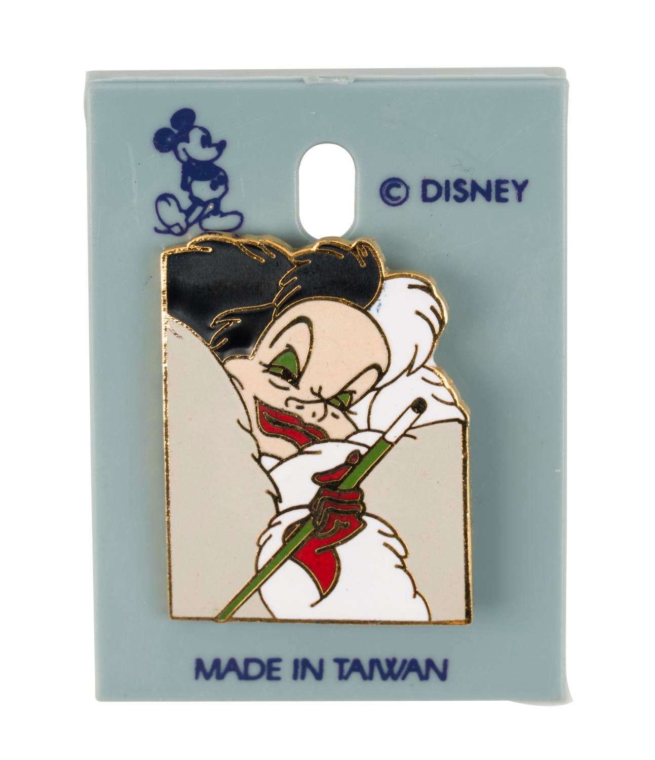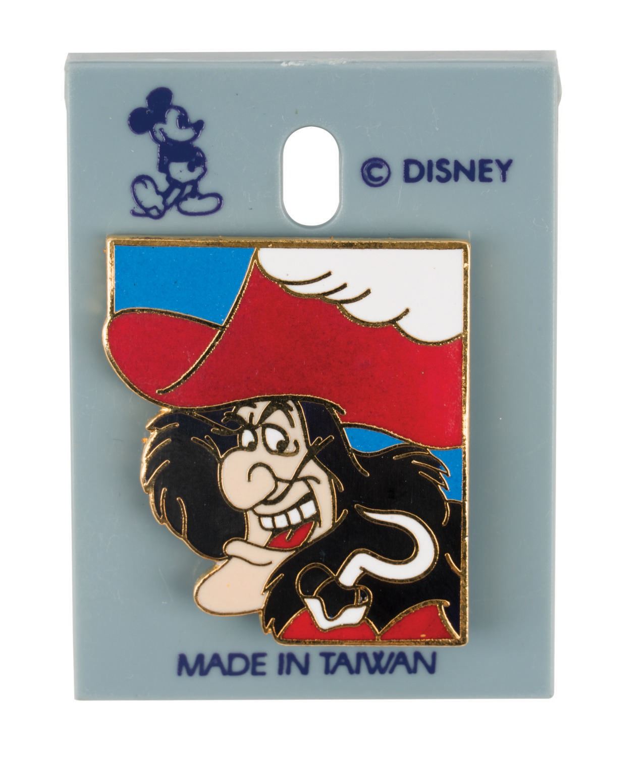 (Disney-MGM, 1990s) A set of (6) pins featuring Disney villains once available at the Villain's Shop at Disney-MGM Studios Park. Among the set are Maleficent, the Wicked Queen, Captain Hook, Cruella de Vil, Ursula, and the Big Bad Wolf on their original cards. Measuring approximately 1.25"x1.5" to 1"x1.25", the pins are in overall fine condition.