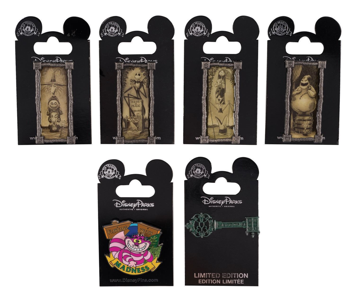 (Disney Parks, 2017) A lot of (6) pins inspired by The Haunted Mansion and Alice in Wonderland. The lot contains (4) pins inspired by stretching portraits of The Haunted Mansion Holiday overlay, one haunted Mansion key, and the Cheshire Cat from Alice in Wonderland. The Mansion pins measure from 2.25"x1" to 2"x.5", while the Cheshire Cat pin is 1.5" in diameter, each pin in fine condition.