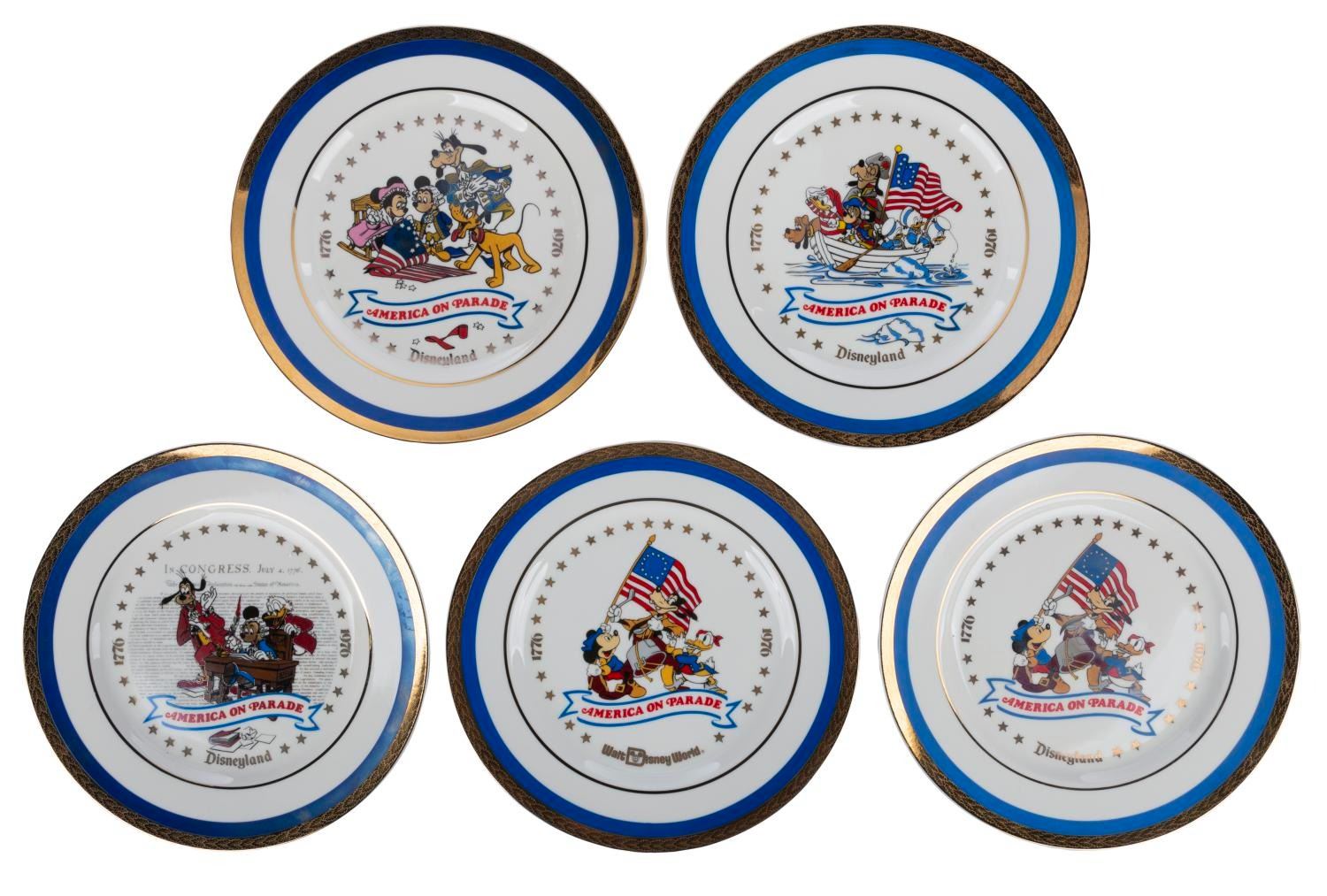 (Disneyland/Walt Disney World, 1975-76) A limited edition set of five decorative plates manufactured by Viletta from the America on Parade bicentennial celebration. This set features the "Fab Five" paying homage to several historical American moments including, the signing of the Declaration of Independence, Washington crossing the Delaware, the Spirit of '76, and Betsy Ross sewing the original American flag. Measuring 11" in diameter each, the plates are in very good condition with some discoloration due to age.