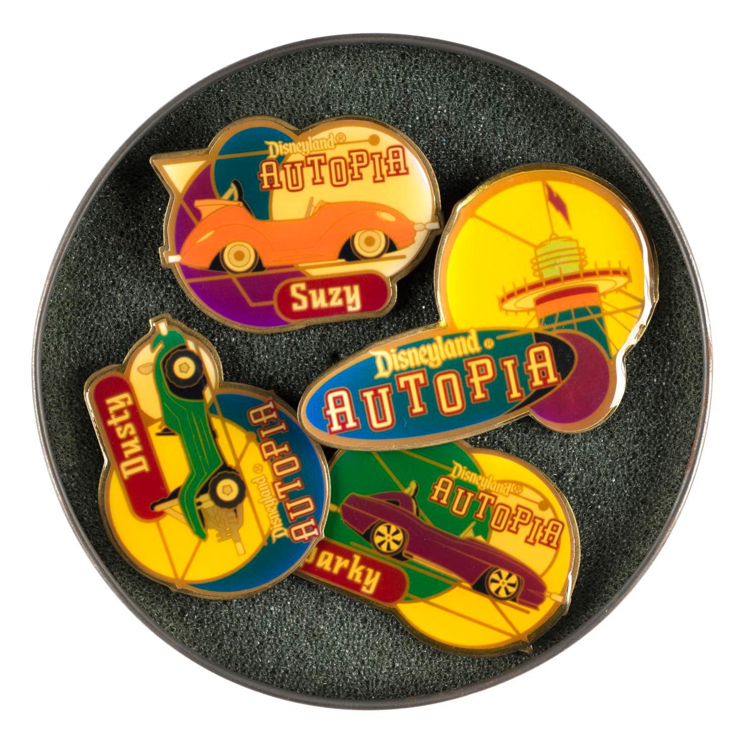 (Disneyland, 2000) A set of Autopia Pins created for the grand reopening of the attraction paired with a cast member sneak peek button. All pieces are in fine unused condition.