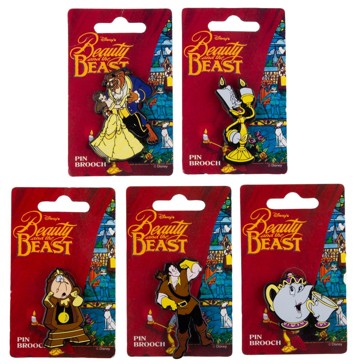 (Disney, 1990s) A set of five "Beauty and the Beast" pin brooches made in the United Kingdom. Included are the Beast with Belle, Gaston, Cogsworth, Mrs. Potts, and Lumiere. Measuring up to 2" x 1.75", the pins are in fine condition on the original cards.