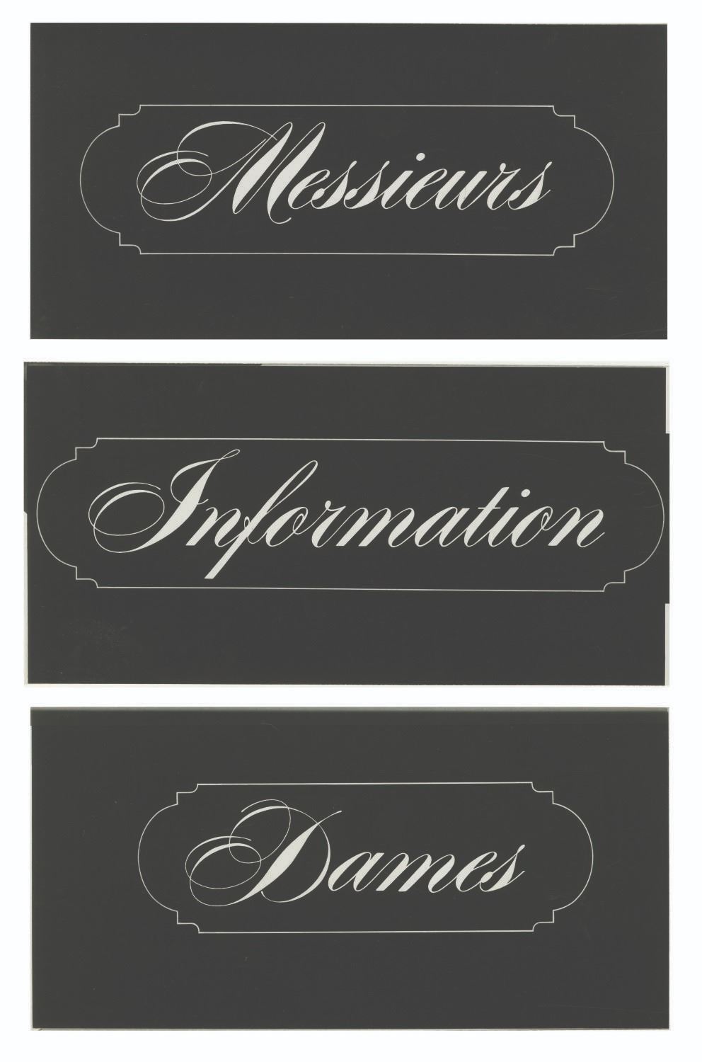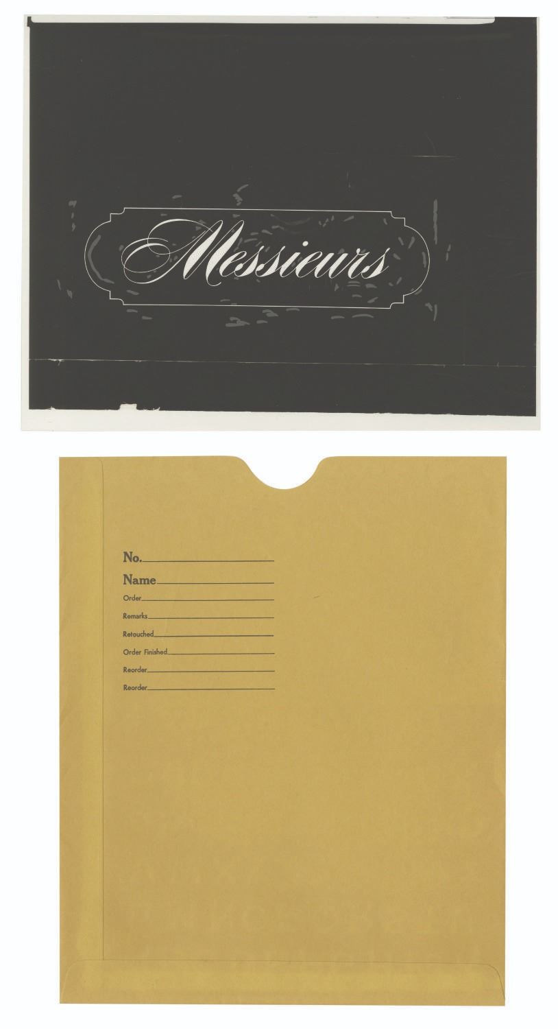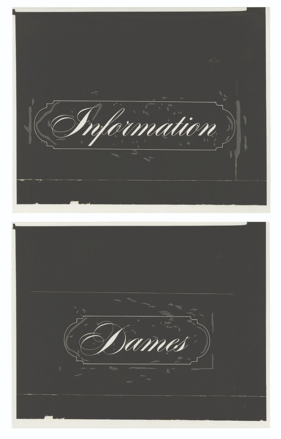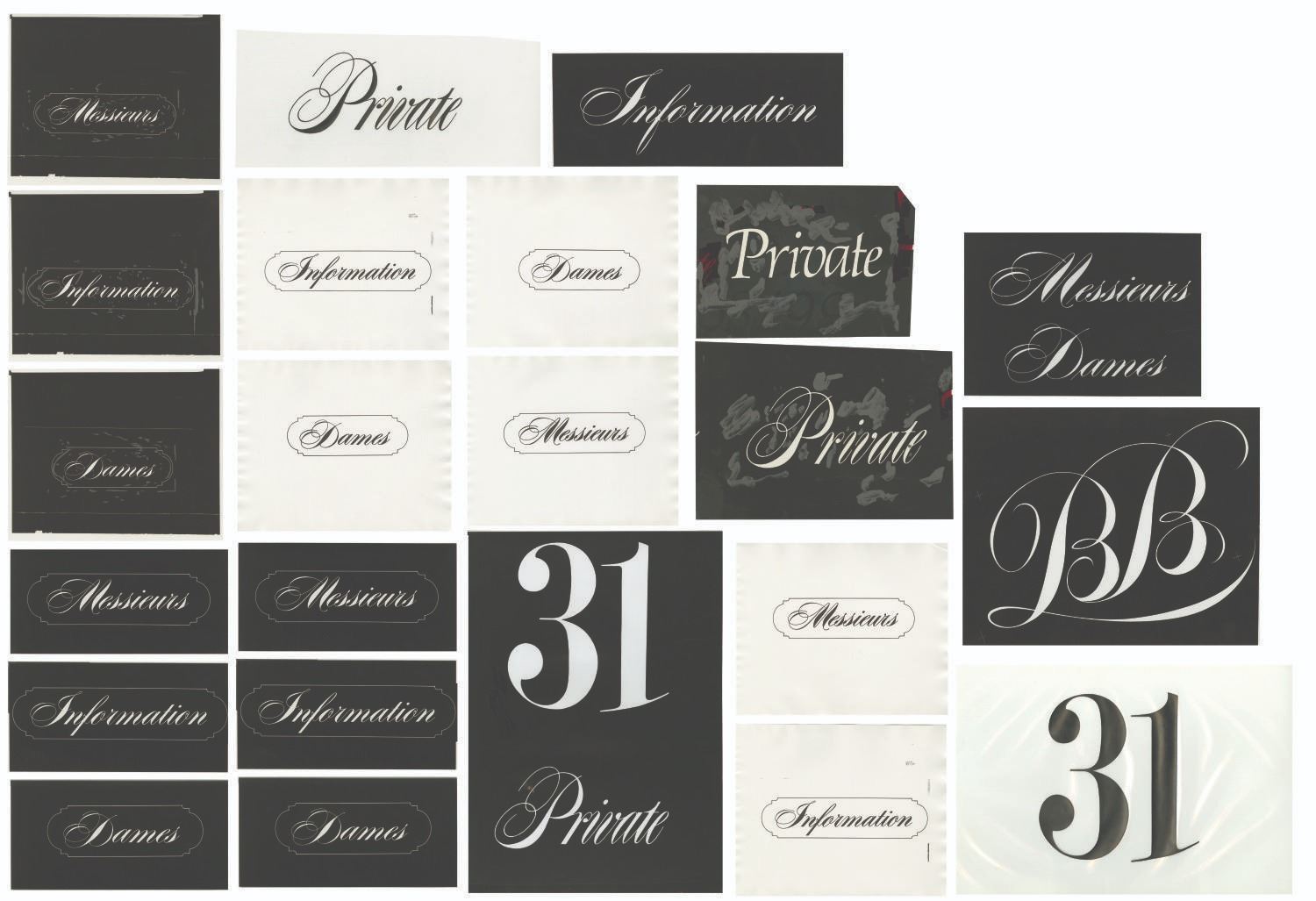 (Disneyland, 1967) A rare collection of original production artwork used in the creation of printed signage for the Blue Bayou restaurant in Disneyland. The set contains two hand-painted transparencies reading "31" and "Private." The artwork also includes five photo cel negatives that were used to clean up the imagery for printing, featuring the words "Messieurs," "Dames," "Information," and "Private." Also included are photographic sample prints with negative and positive imagery of the text, including an additional Blue Bayou "BB" logo image. The unique set offers a very rare look into the creation of signage for this iconic Disneyland restaurant. Measuring between 5" x 10" and 16.75" x 12", the production art is in very good condition with light wear from use including edge wear and rippling to some of the sheets.