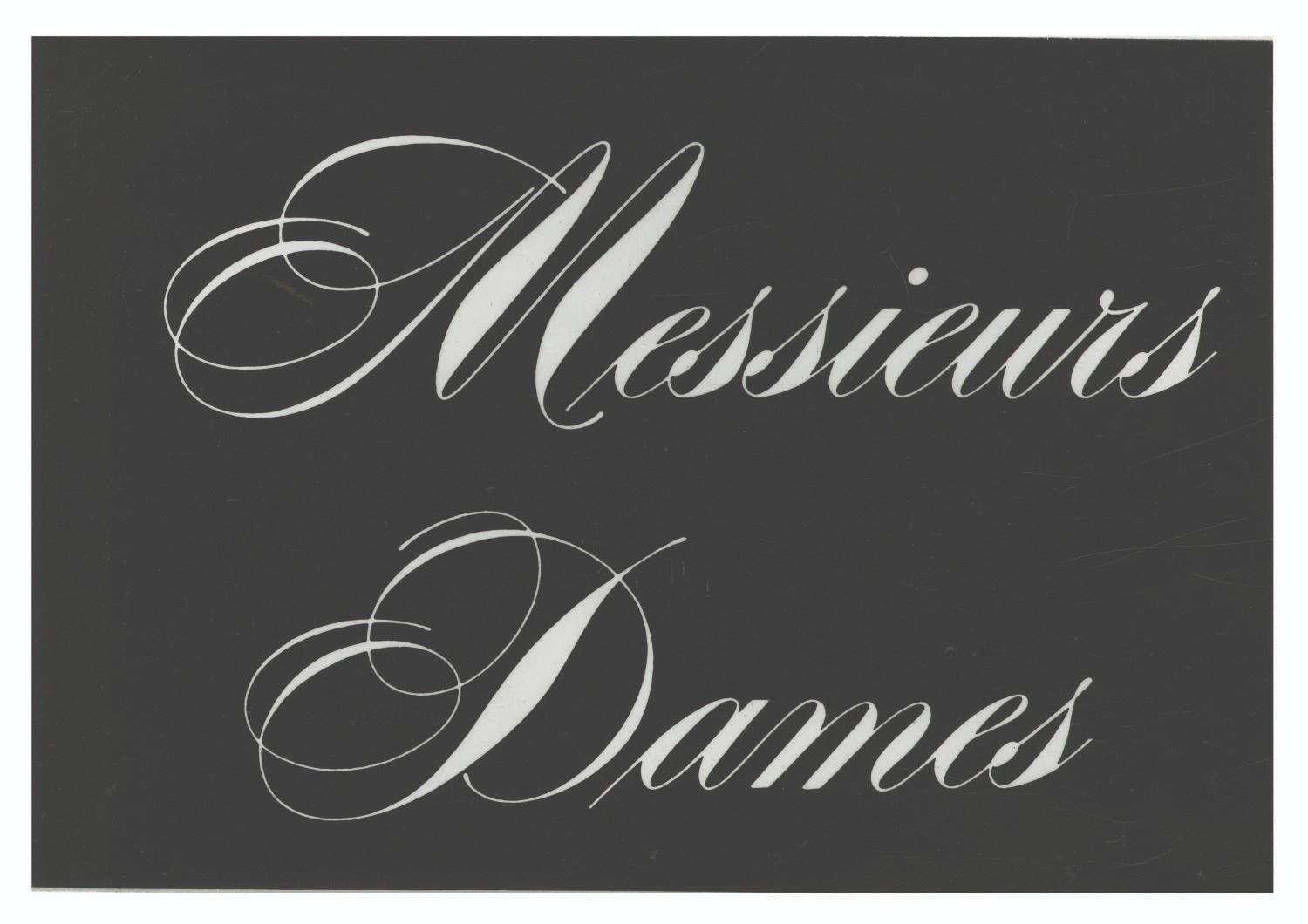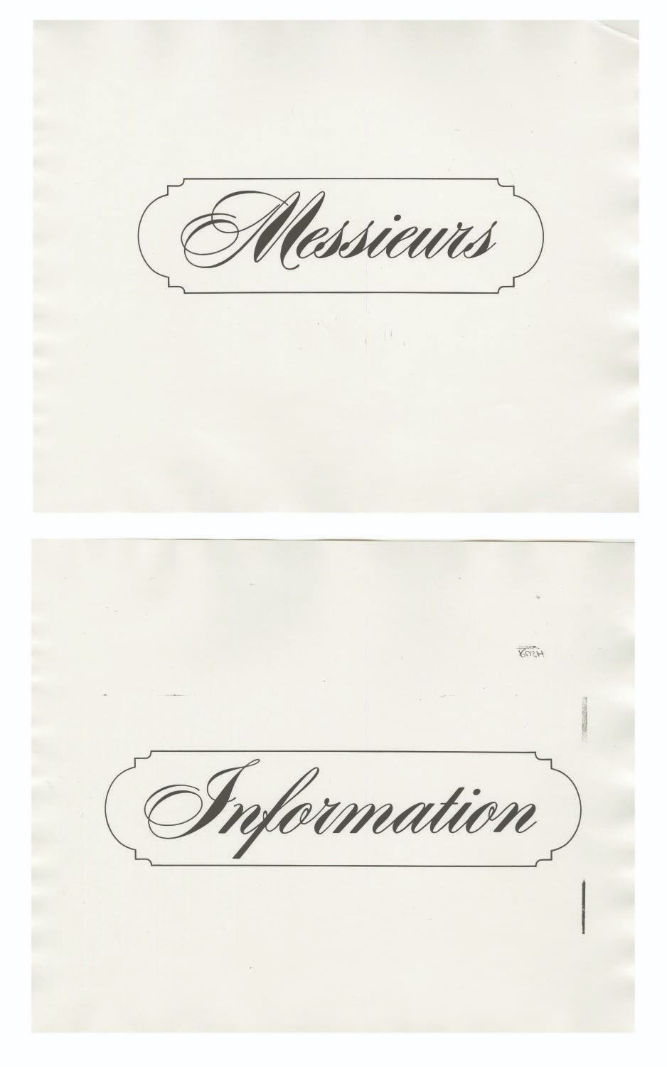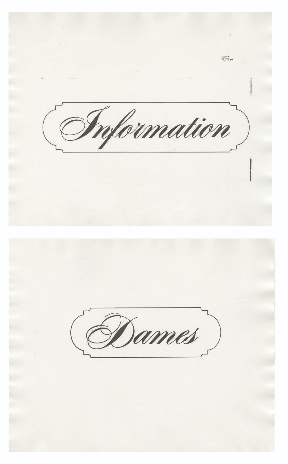 (Disneyland, 1967) A rare collection of original production artwork used in the creation of printed signage for the Blue Bayou restaurant in Disneyland. The set contains two hand-painted transparencies reading "31" and "Private." The artwork also includes five photo cel negatives that were used to clean up the imagery for printing, featuring the words "Messieurs," "Dames," "Information," and "Private." Also included are photographic sample prints with negative and positive imagery of the text, including an additional Blue Bayou "BB" logo image. The unique set offers a very rare look into the creation of signage for this iconic Disneyland restaurant. Measuring between 5" x 10" and 16.75" x 12", the production art is in very good condition with light wear from use including edge wear and rippling to some of the sheets.