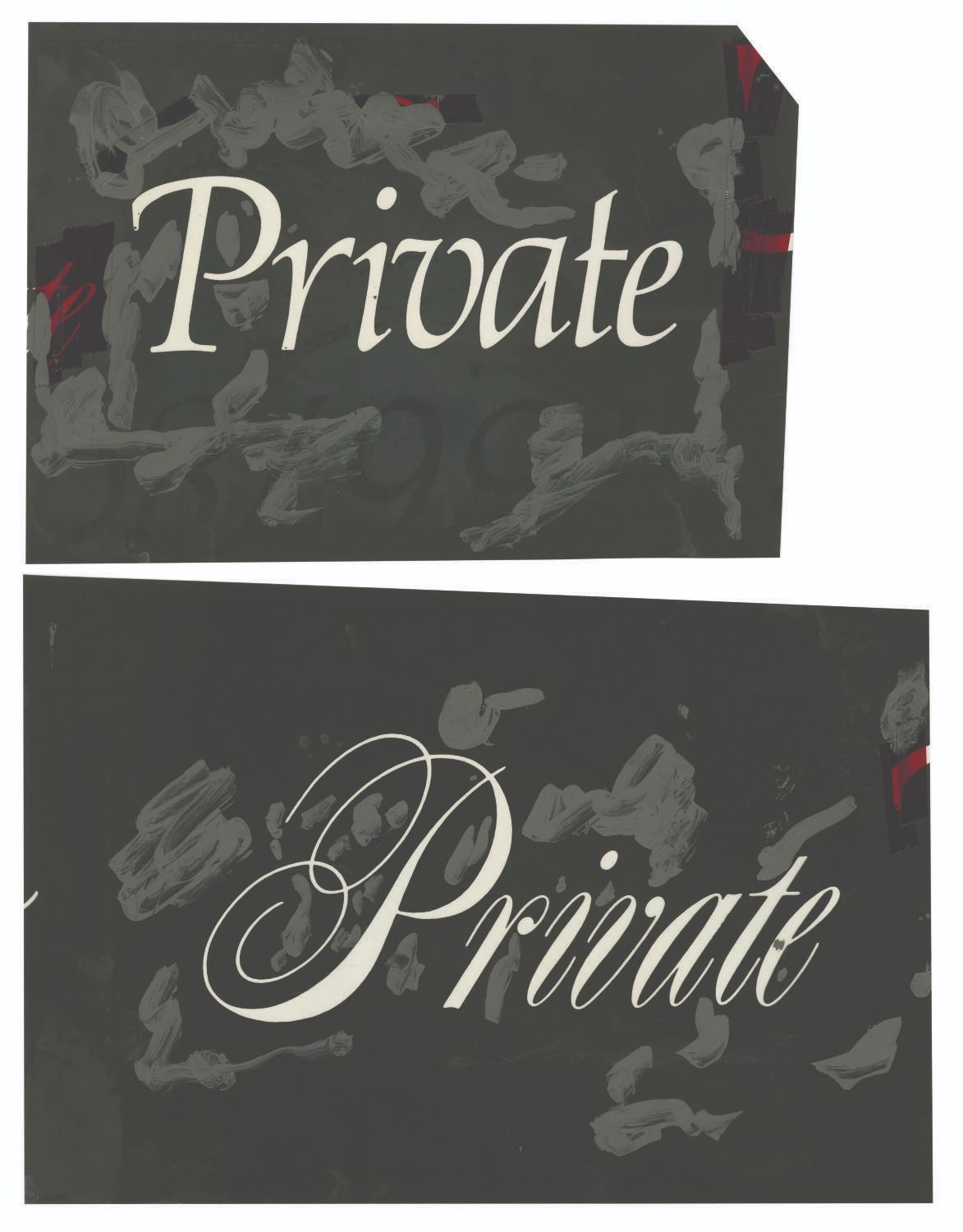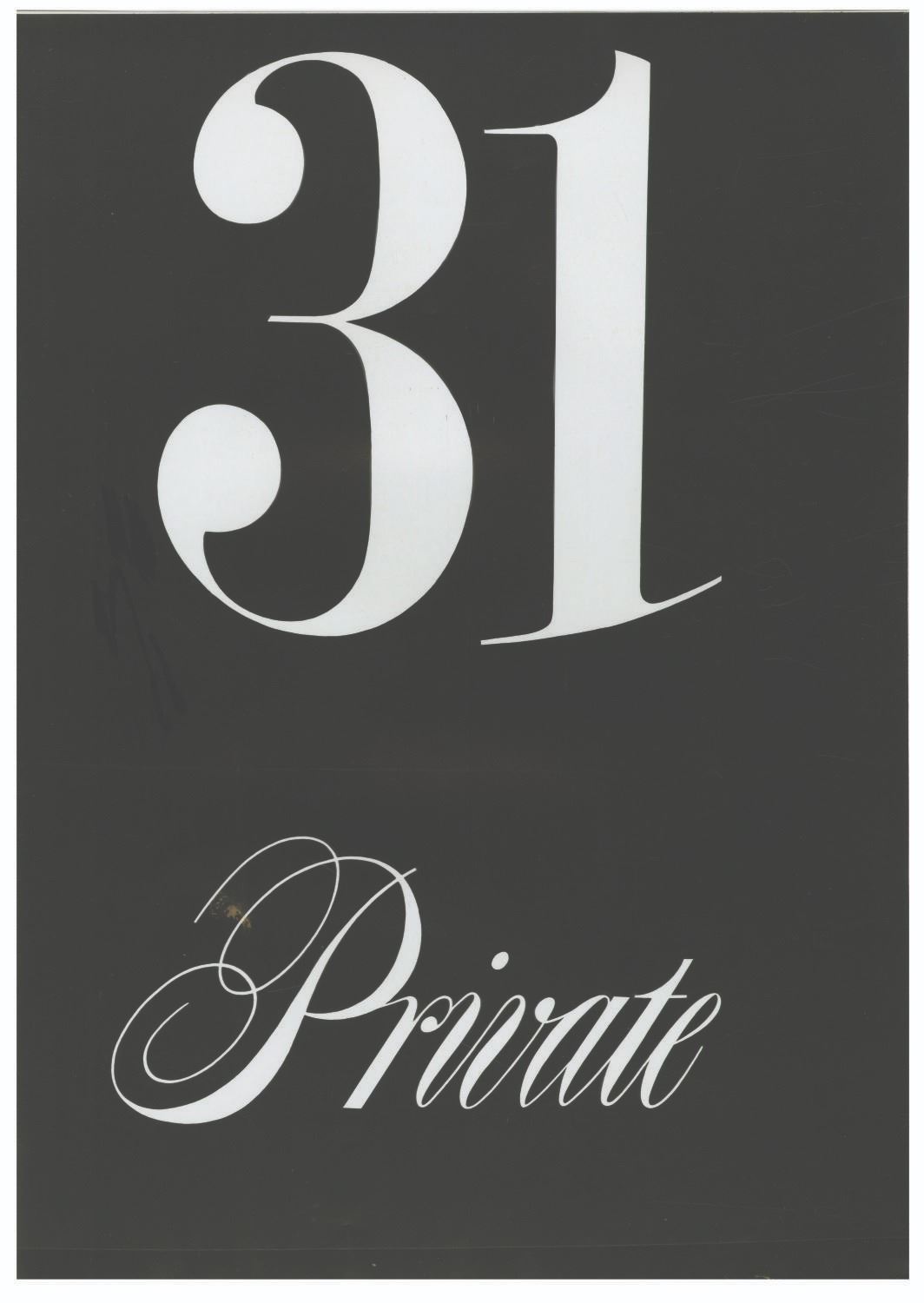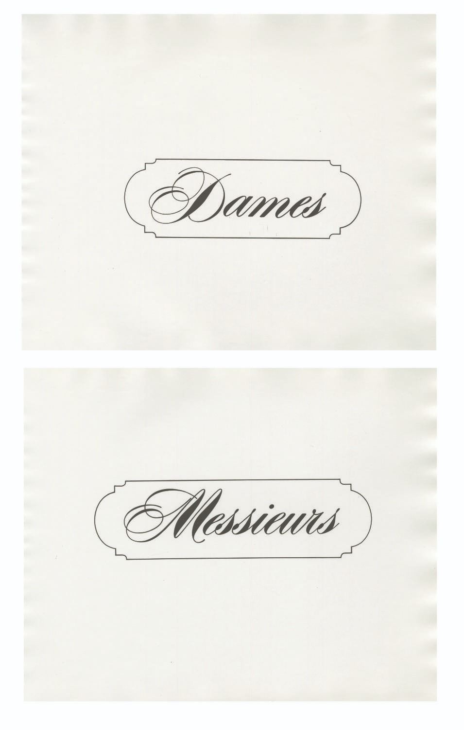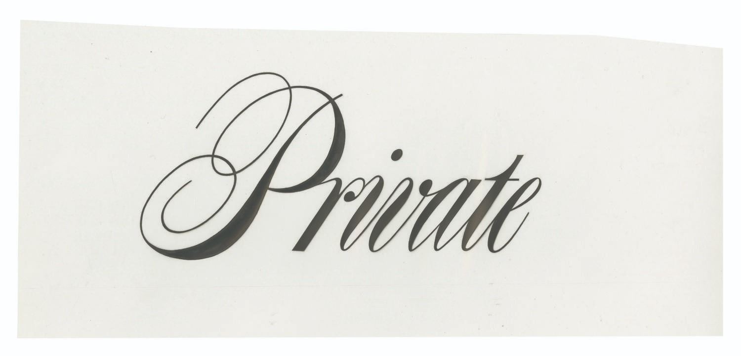 (Disneyland, 1967) A rare collection of original production artwork used in the creation of printed signage for the Blue Bayou restaurant in Disneyland. The set contains two hand-painted transparencies reading "31" and "Private." The artwork also includes five photo cel negatives that were used to clean up the imagery for printing, featuring the words "Messieurs," "Dames," "Information," and "Private." Also included are photographic sample prints with negative and positive imagery of the text, including an additional Blue Bayou "BB" logo image. The unique set offers a very rare look into the creation of signage for this iconic Disneyland restaurant. Measuring between 5" x 10" and 16.75" x 12", the production art is in very good condition with light wear from use including edge wear and rippling to some of the sheets.