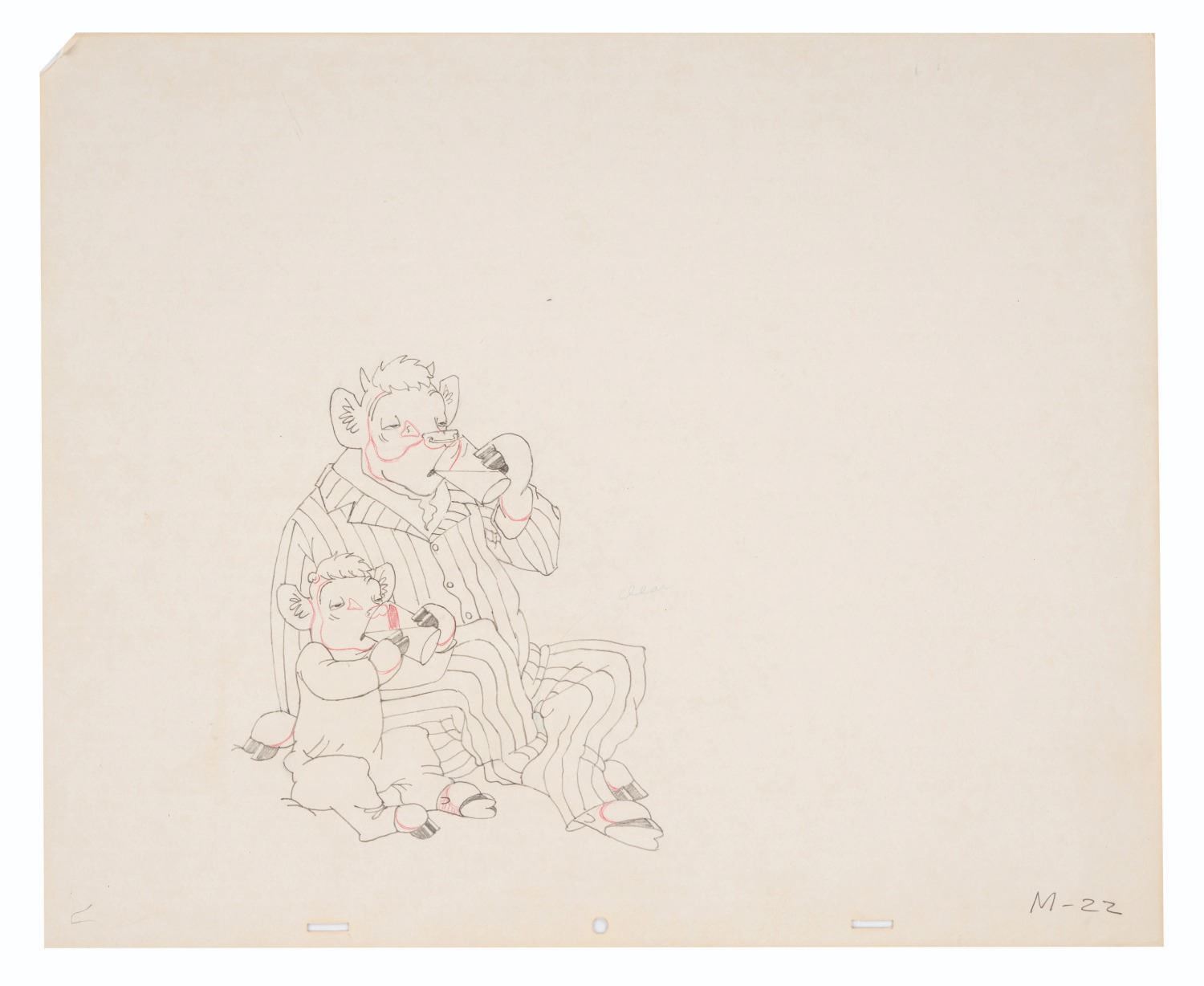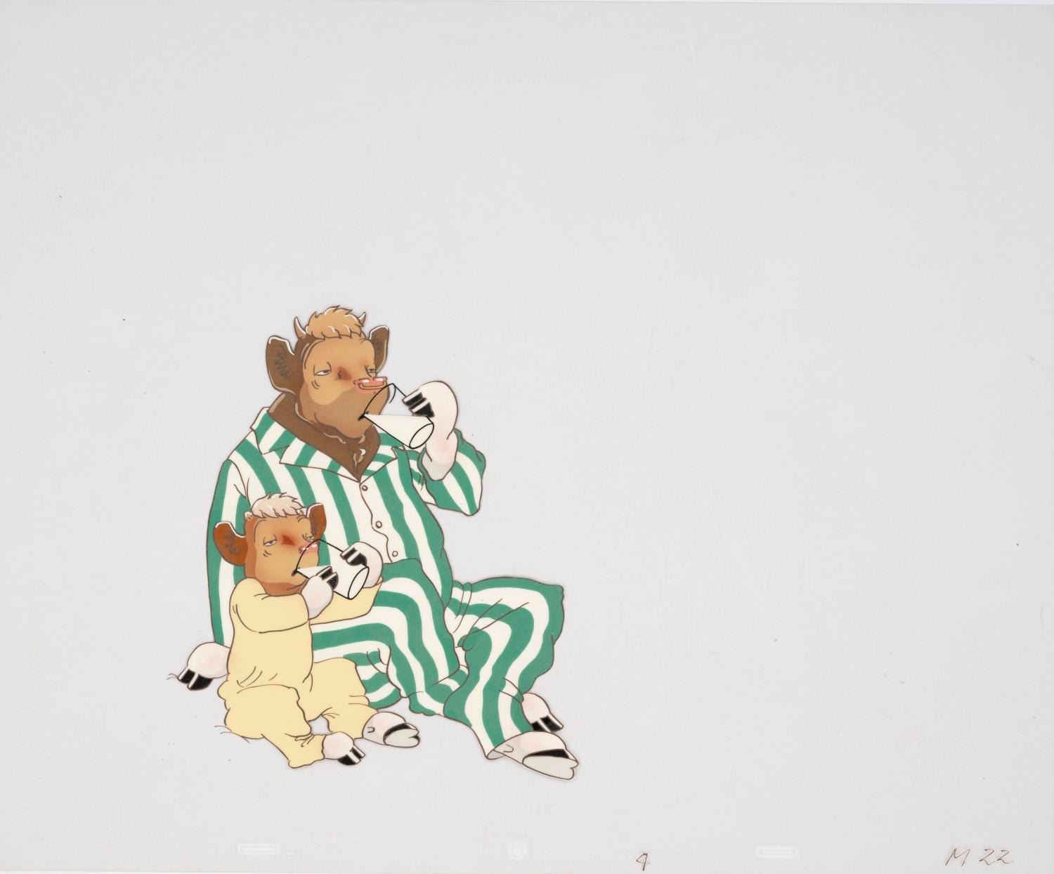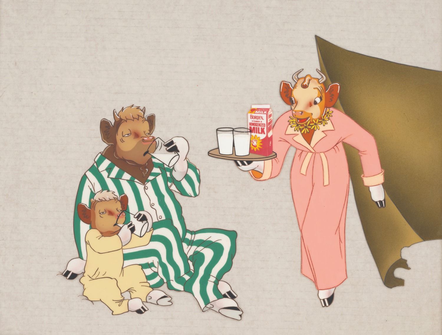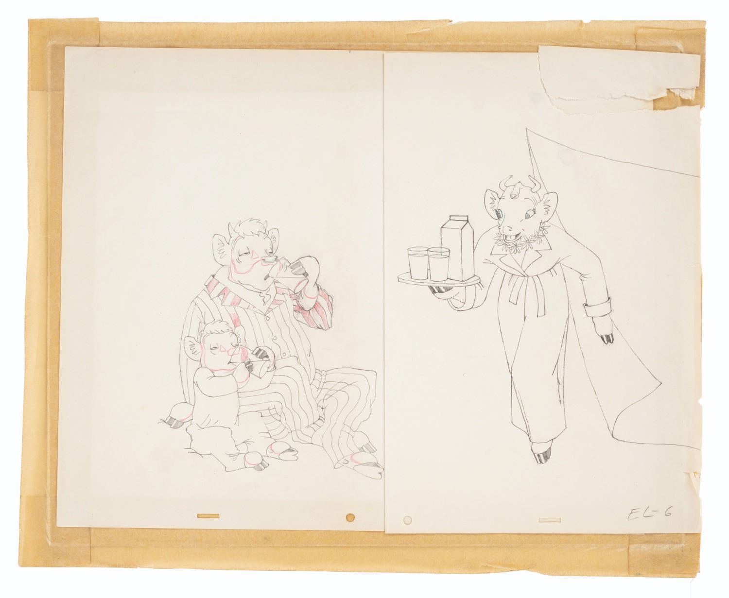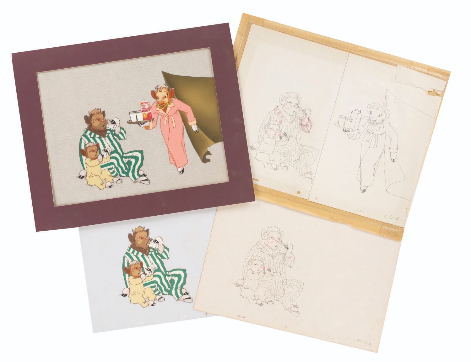(Borden, 1970s) A pair of cels from a Borden milk commercial, wih original production drawings. Included are two cels of Elmer and Beauregard in pajamas drinking milk, and one cel of Elsie in a robe serving them. The untrimmed cels measure 13.5"x16.5", with a character image size of 6"x7.5" and 11"x9". The cels are in very good condition, with matching production drawings good, with a corner torn off of the Elsie drawing that doesn't affect the image.