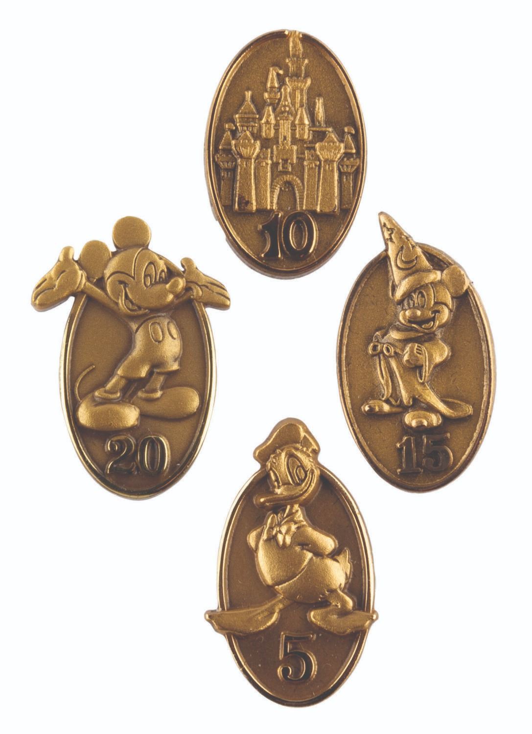 (Disney, 2000-10s) A set of four Disney Service Award pins given to Cast Members as they reach important yearly milestones. Included are the 5-year Donald Duck, the 10-year Castle, the 15-year Sorcerer Mickey, and the 20-year Mickey pin. Measuring 0.75", the pins are in very good condition with light wear from use and handling.
