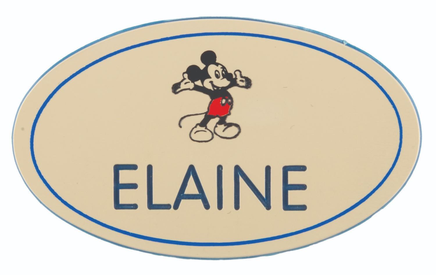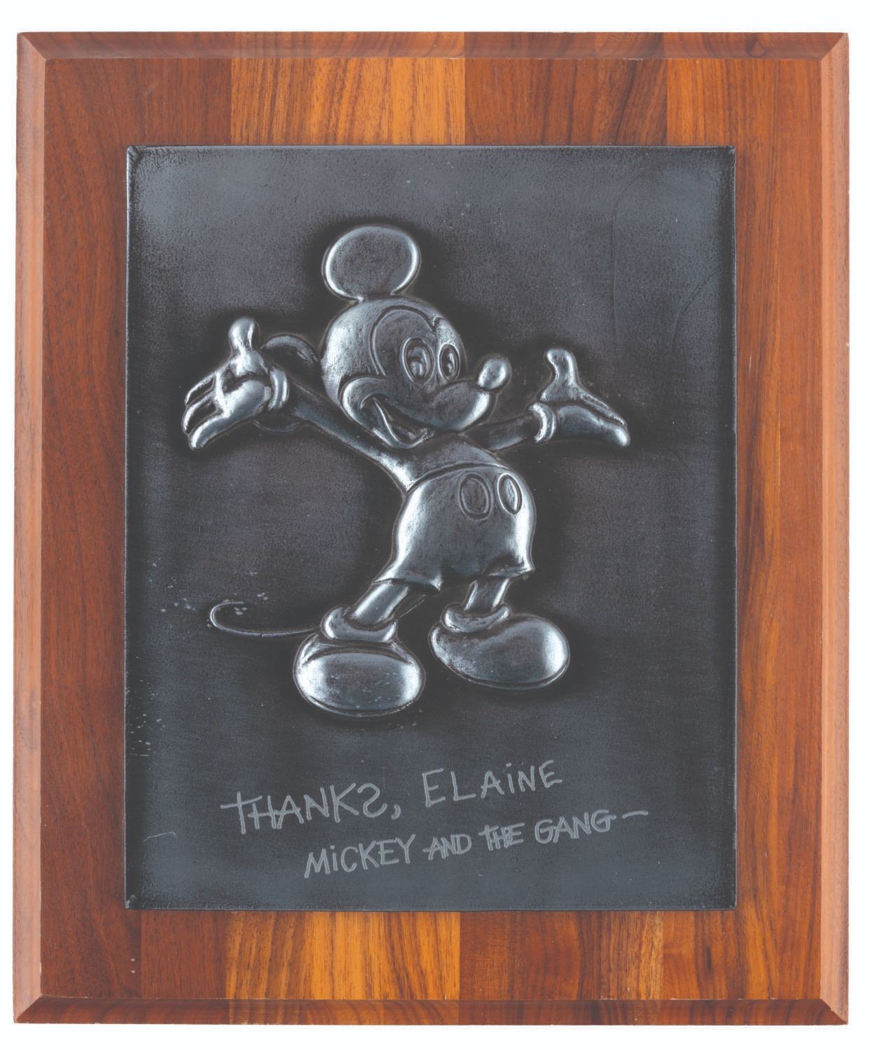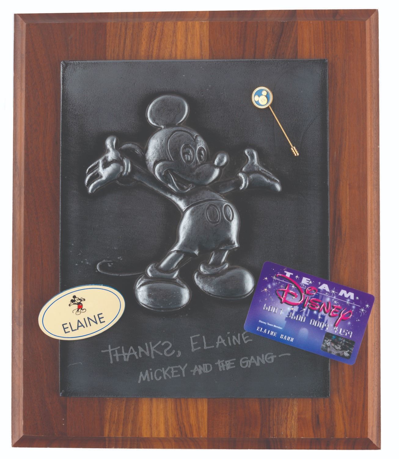 (Disneyland, 1990s-2000s) A Disneyland 15-year stickpin and a wood and pewter plaque featuring Mickey Mouse presented to an employee upon her retirement. The plaque reads, "Thanks, Elaine," and is signed "Mickey and the Gang." Also included is an"Elaine” name badge and a Team Disney credit card. The plaque measures 13" x 11" and is in very good condition with very light wear. The pin, credit card, and name badge are in fine condition.