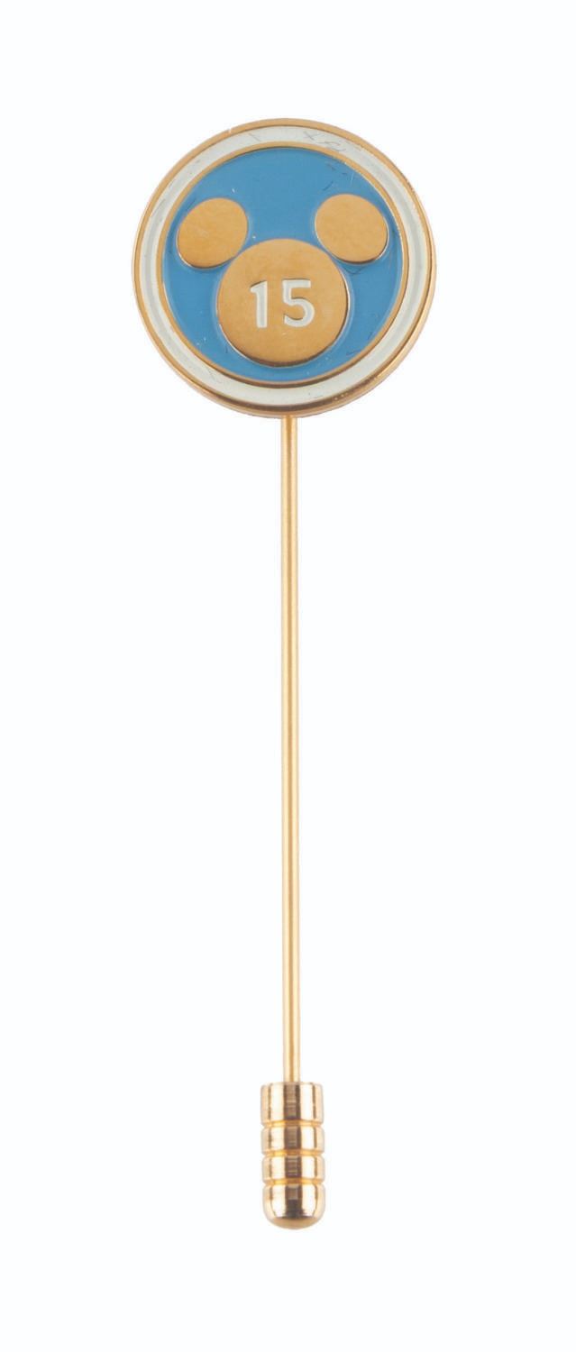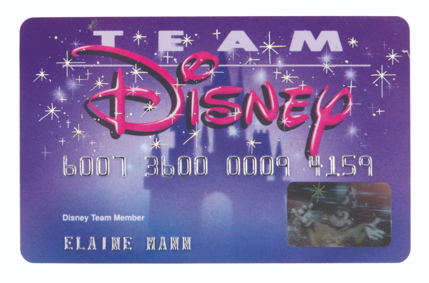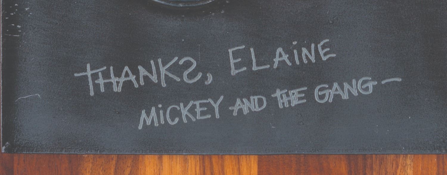 (Disneyland, 1990s-2000s) A Disneyland 15-year stickpin and a wood and pewter plaque featuring Mickey Mouse presented to an employee upon her retirement. The plaque reads, "Thanks, Elaine," and is signed "Mickey and the Gang." Also included is an"Elaine” name badge and a Team Disney credit card. The plaque measures 13" x 11" and is in very good condition with very light wear. The pin, credit card, and name badge are in fine condition.