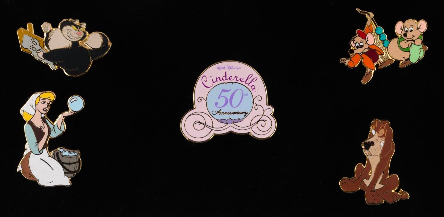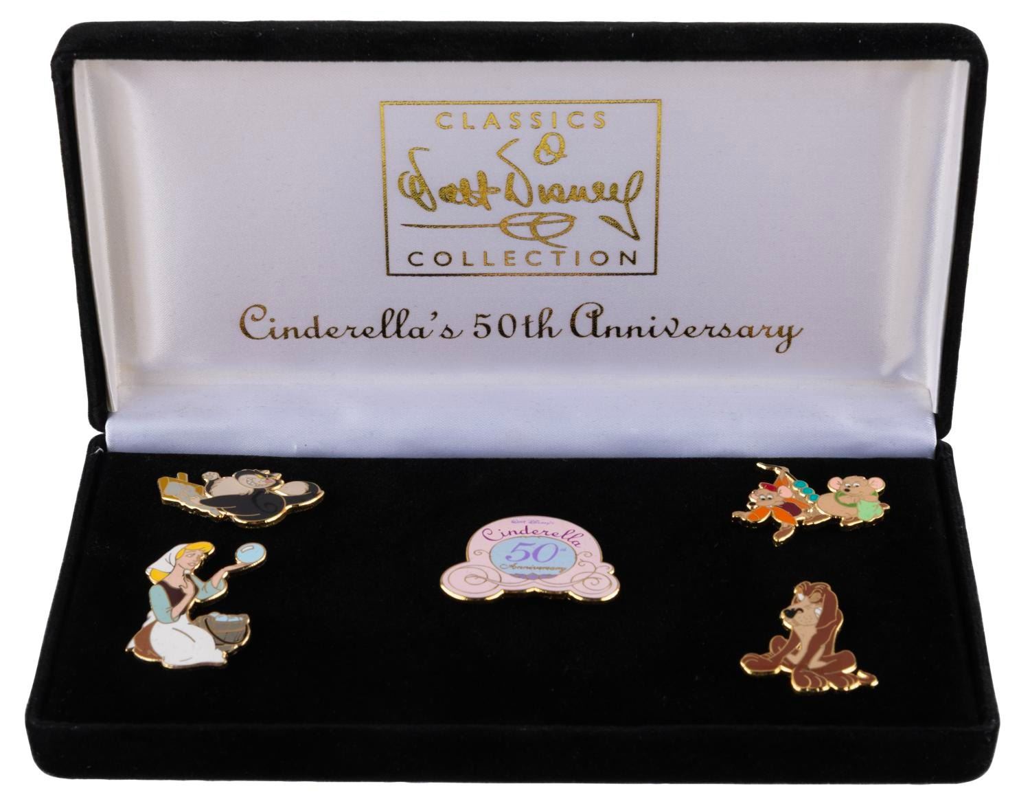 (WDCC, 2000) A set of 5 pins commemorating the 50th anniversary of Walt Disney’s "Cinderella." In the 3.25" x 6" x 1.25" presentation box, the pins are in fine condition.