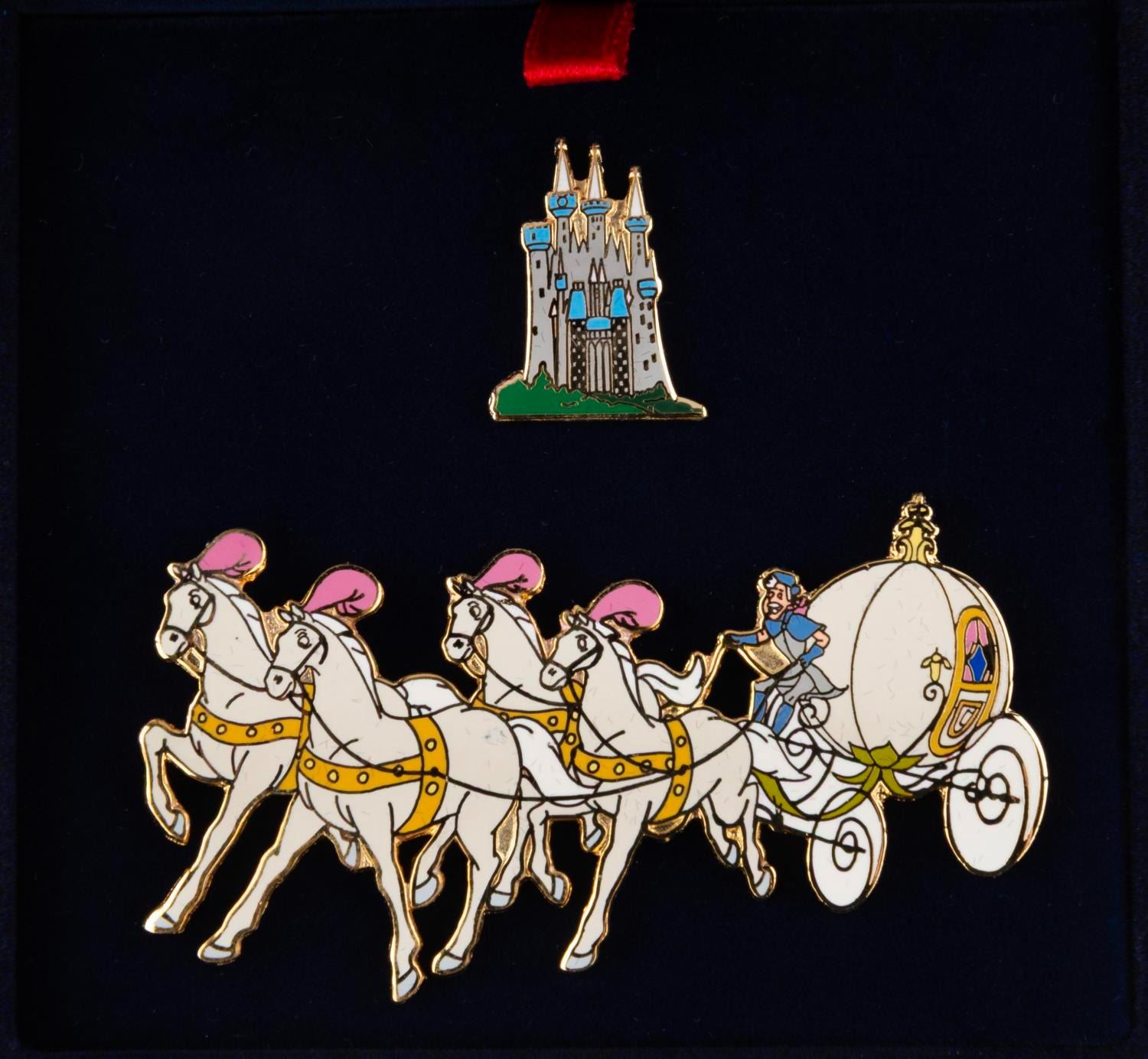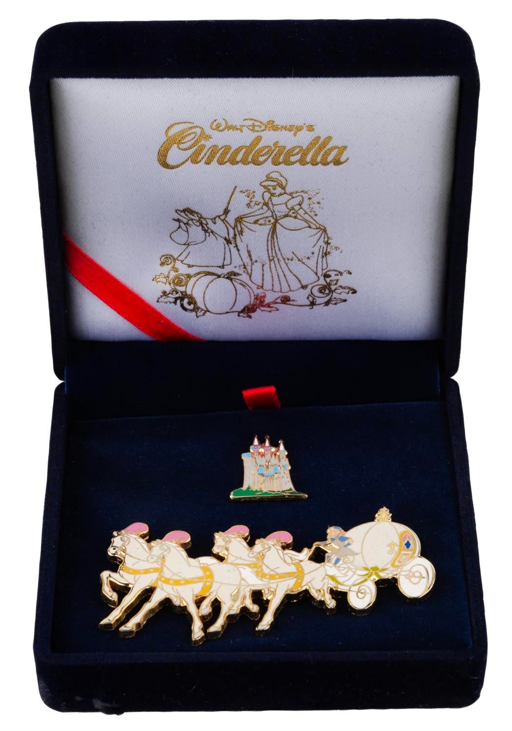 (Disneyland Resort, 2000s) A set of two "Cinderella" pins of the horse-drawn carriage, and the castle, with the original display case. The set is in fine condition.