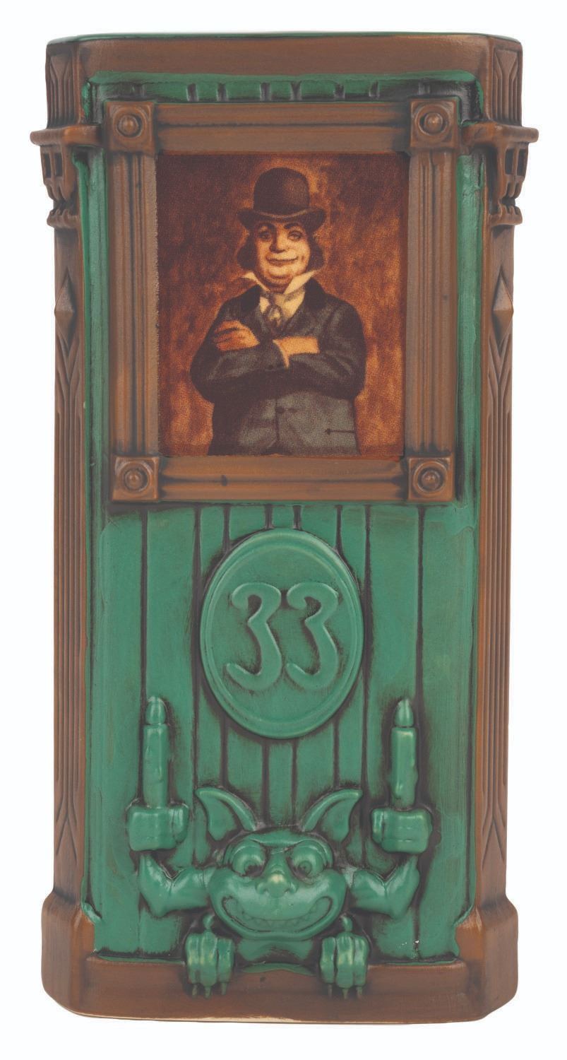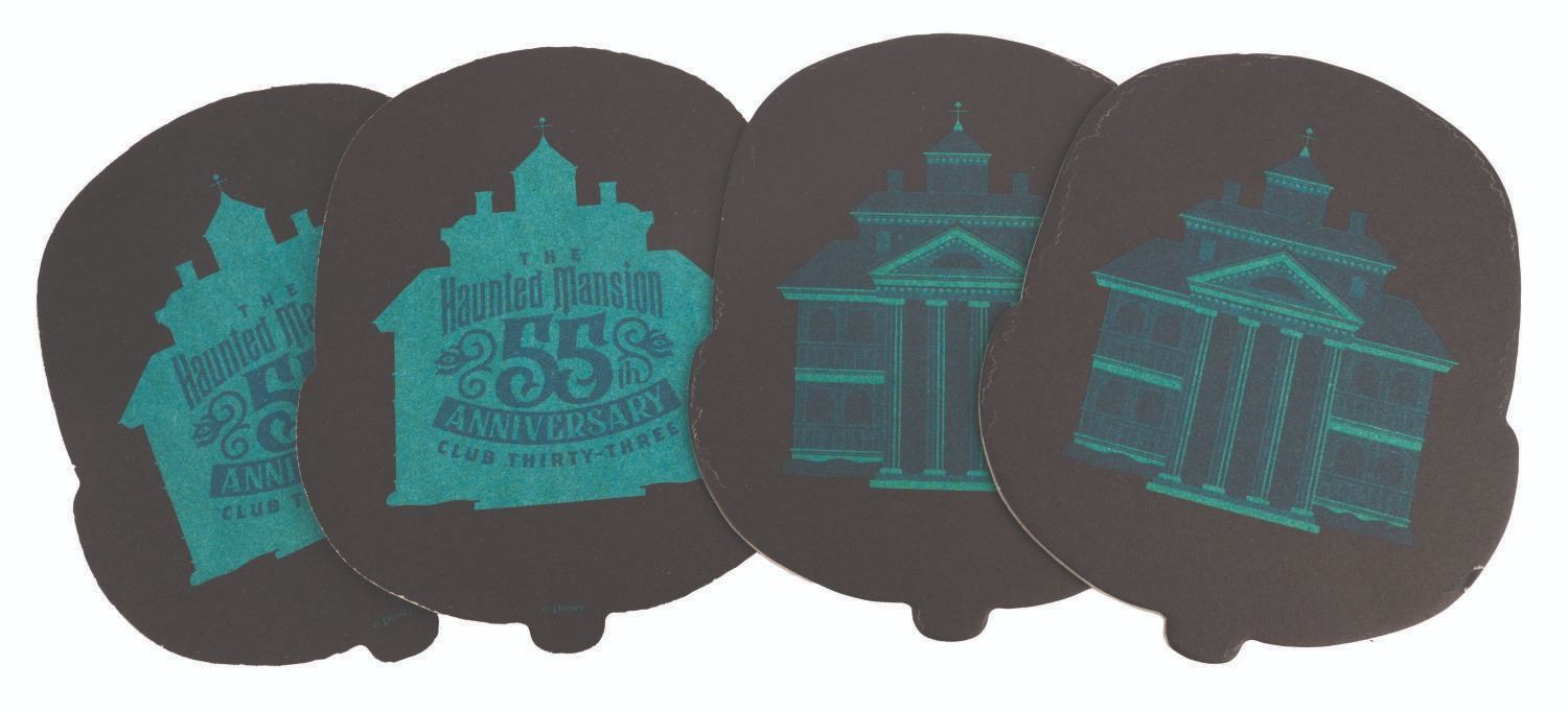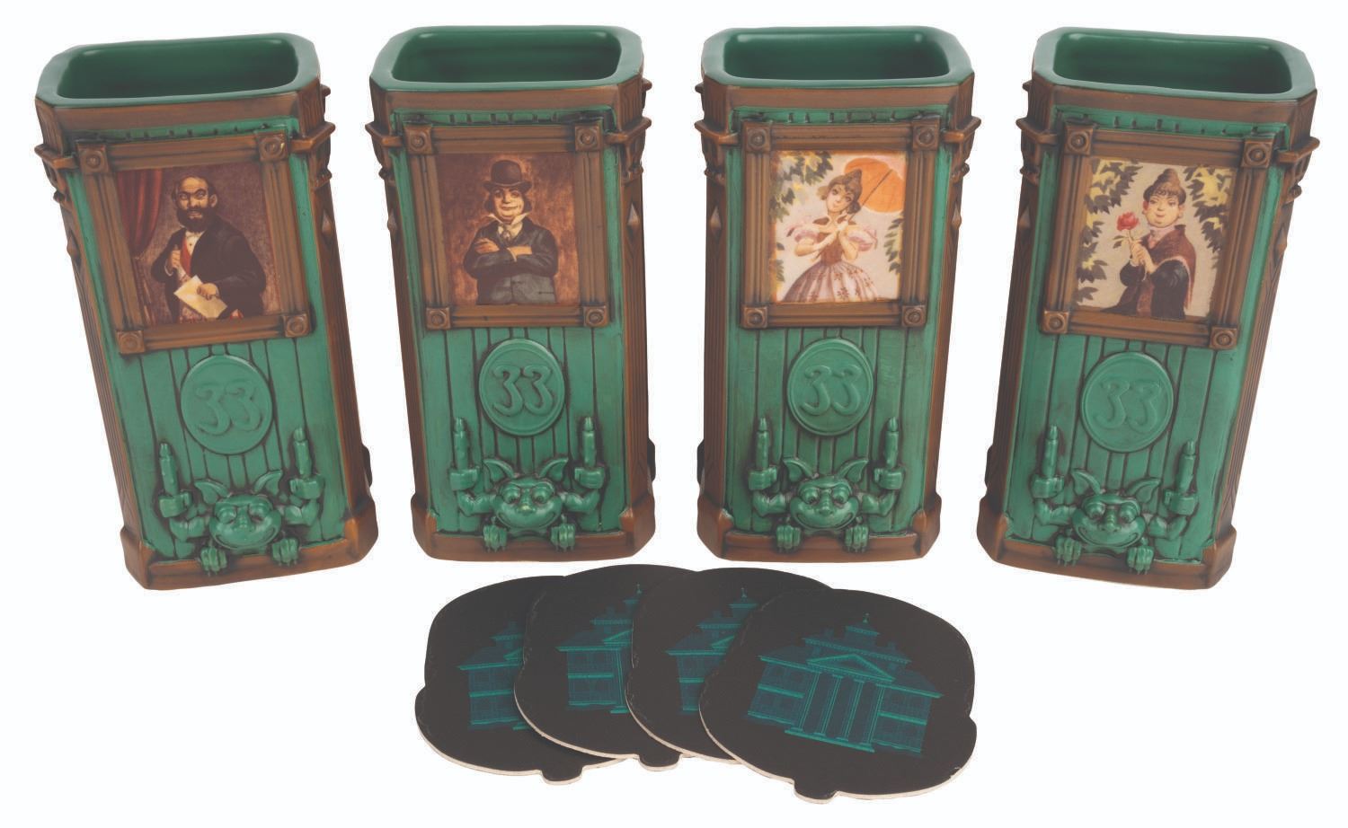 (Disneyland, 2024) A complete set of four tiki mugs and four coasters, sold exclusively at Club 33 for The Haunted Mansion’s 55th anniversary. Based on Marc Davis’ original stretching portrait art, the mugs feature the Dynamite Gentleman, the Bride, the Tightrope Walker, and the Quicksand Men. The mugs measure 3.5" x 2.75" x 6.75" with their original 4" x 3.5" x 7.25" tall boxes, while the coasters measure 3.25" x 4". The mugs and coasters are in fine condition and the boxes are in very good condition with light wear.