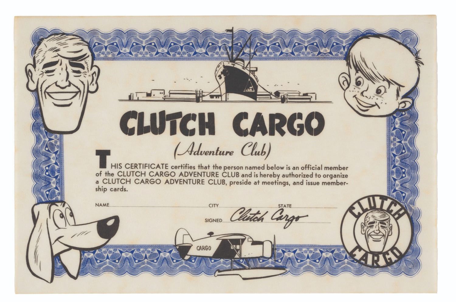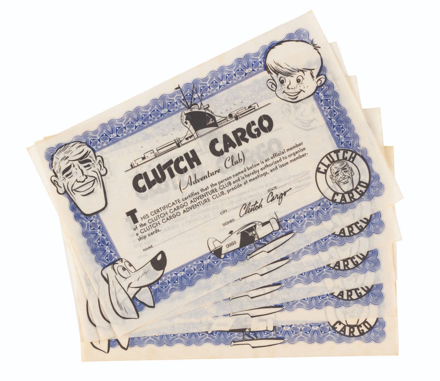 (Cambria Productions, 1959-60) A collection of five "Clutch Cargo" Adventure Club membership certificates. The parchment paper certificates measure 5.75" x 8.75" and are in very good condition with light discoloration.