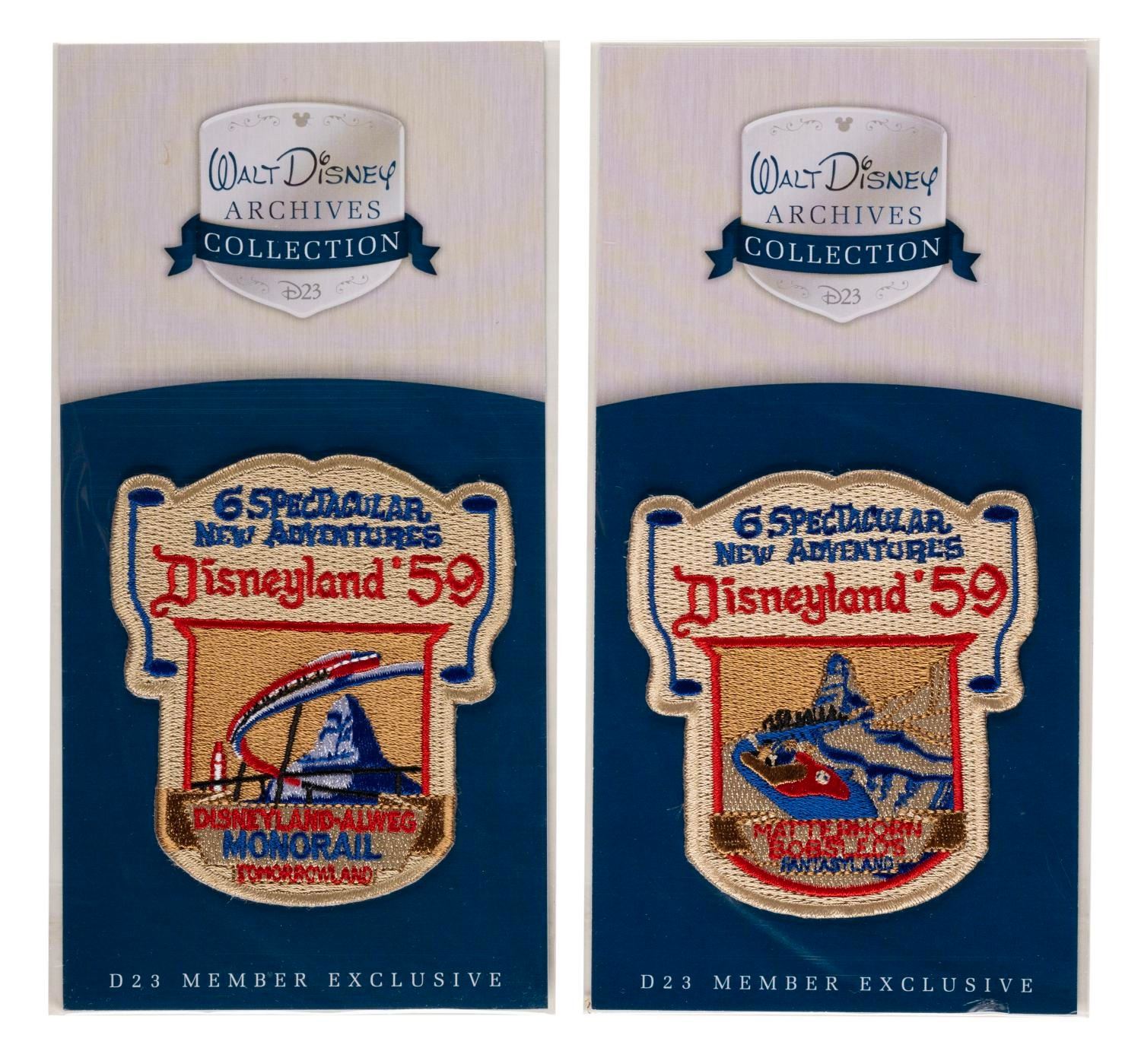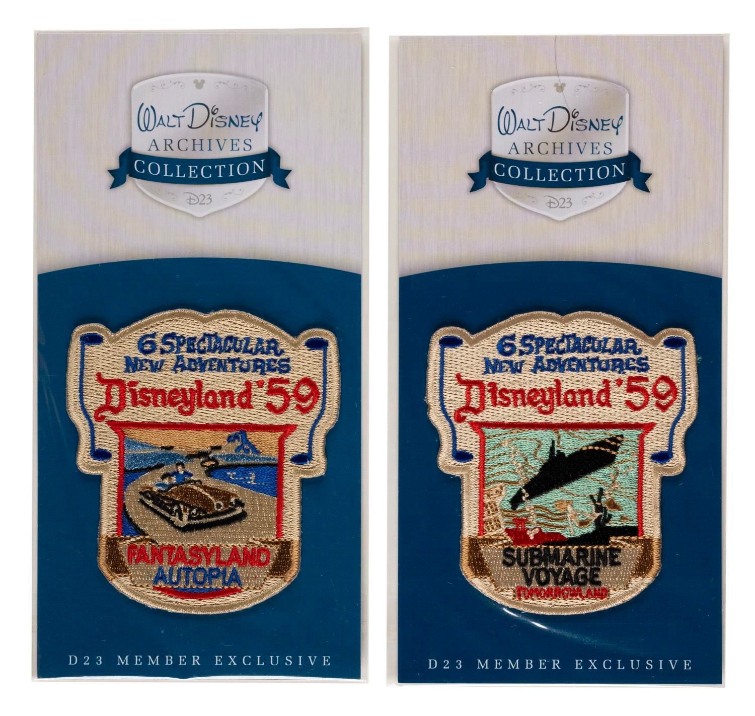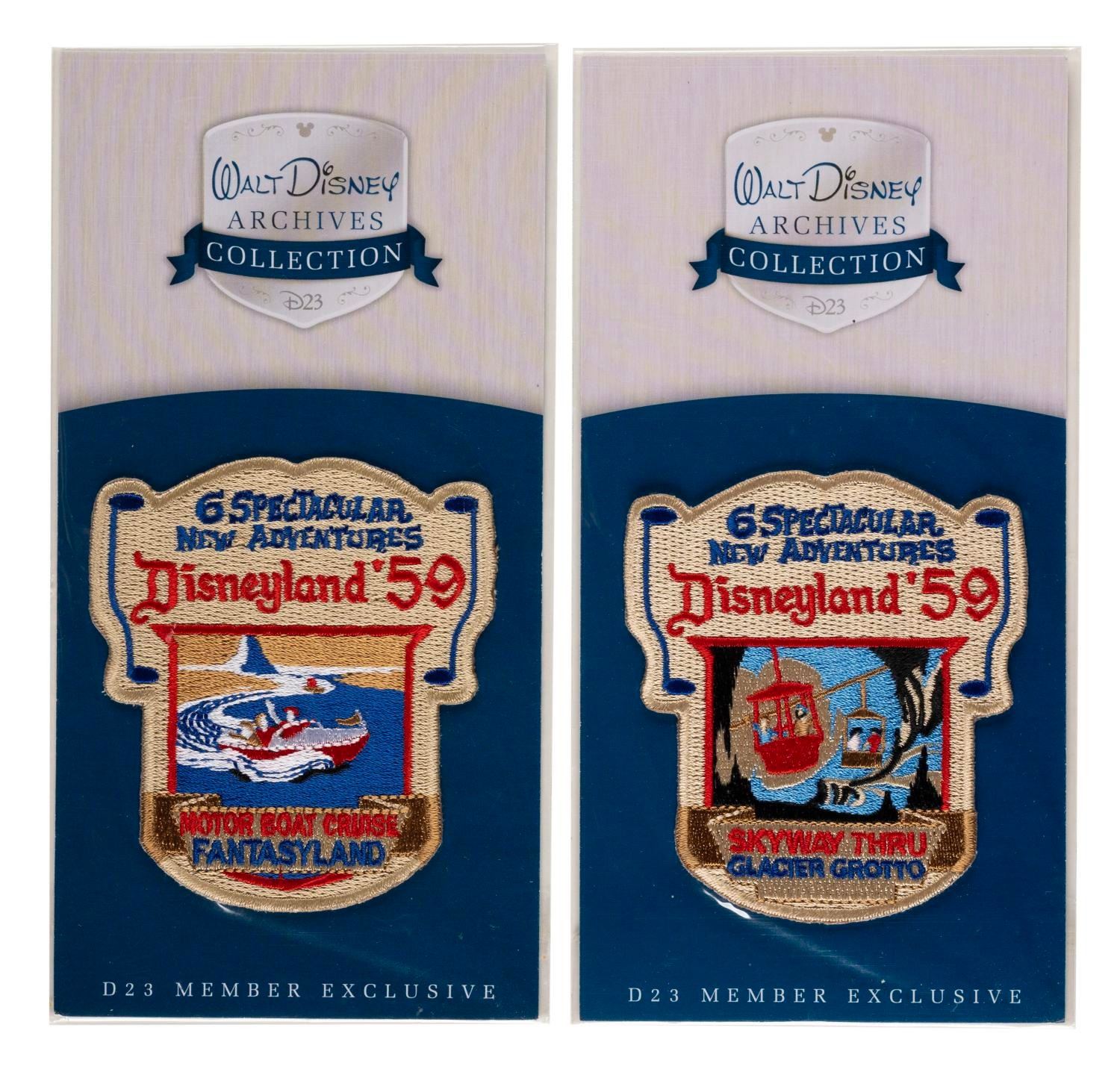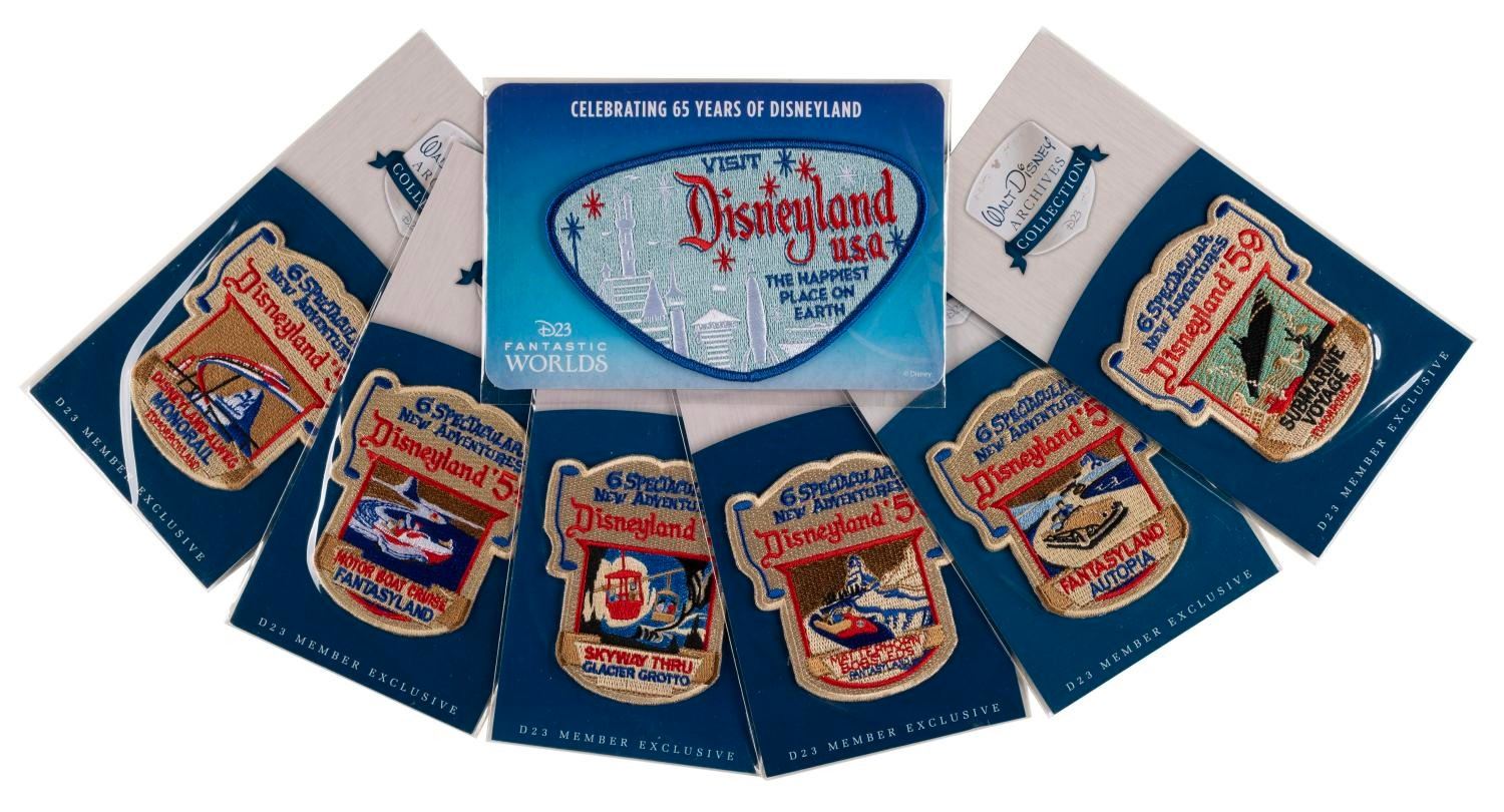 (Disneyland, ) A set of six D23 embroidered patches, including five members exclusive Walt Disney Archives Collection patches of the attractions introduced to the Park in 59', and one 65th anniversary patch. Measuring between 3.5"x3" and 5"x3", the patches are in fine unopened condition.