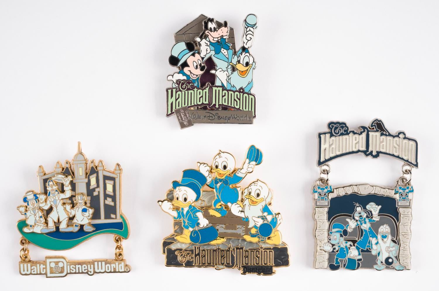 (Disney Parks, 2006-08) A collection of four Disney Characters Hitchhiking Ghosts Pins with some "pin-on-pin" and dangler features. Ranging from 2.5"x2.5" to 1.5"x1.5", the pins are in very good to fine condition, with very light wear from handling or age.