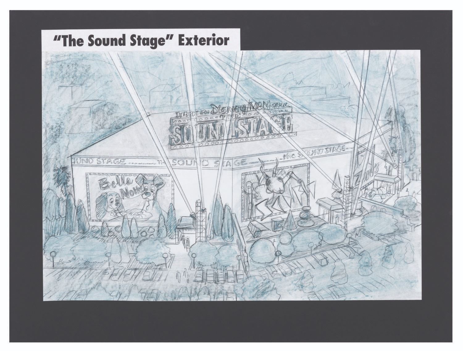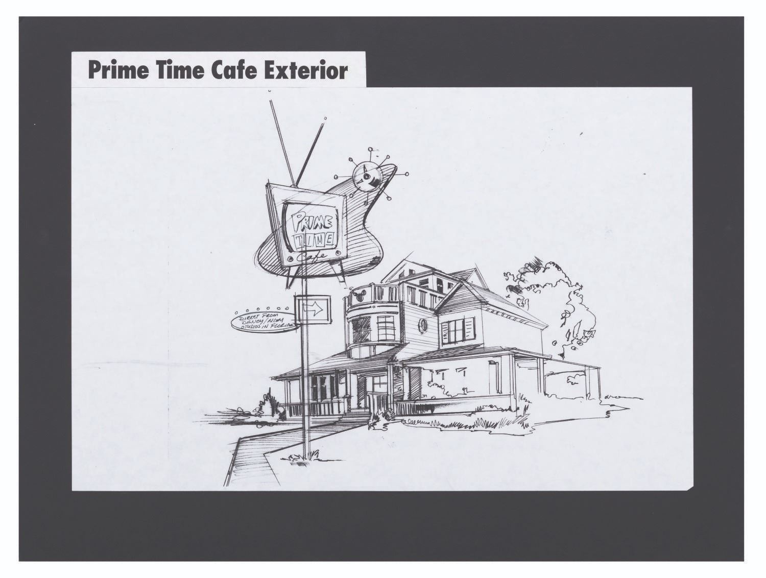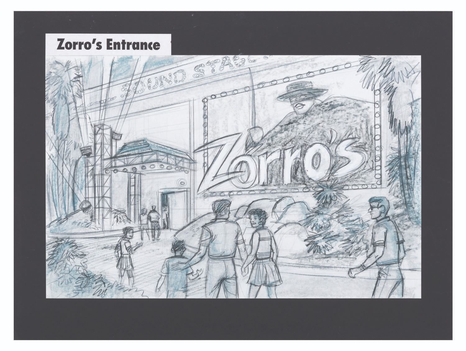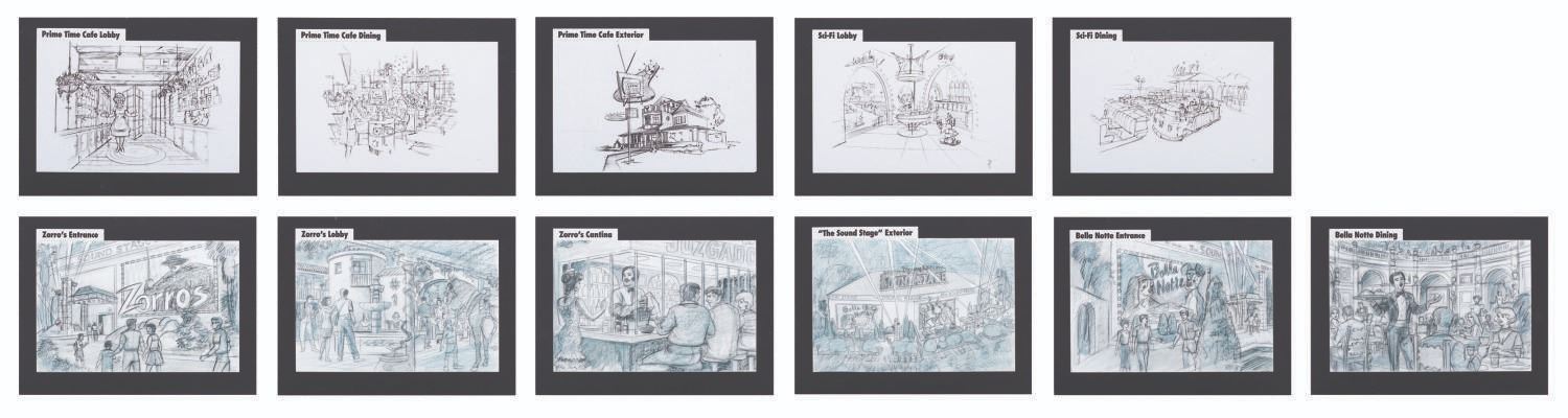 (Disney-MGM Studios, 1980s) A set of 11 presentation boards of concept art for restaurants at Disney-MGM Studios. Included are concepts for the 50s Prime Time Cafe, The Sound Stage, Bella Notte, the Sci-Fi Dine in Theater, and the never-realized Zorro’s Cantina. The concepts are a combination of graphite and colored pencil drawings and photocopies, representing the interiors and exteriors of the restaurants. Measuring 11" x 17" on 15" x 20" illustration board, the concept artwork is in very good, production-used condition with light handling wear.