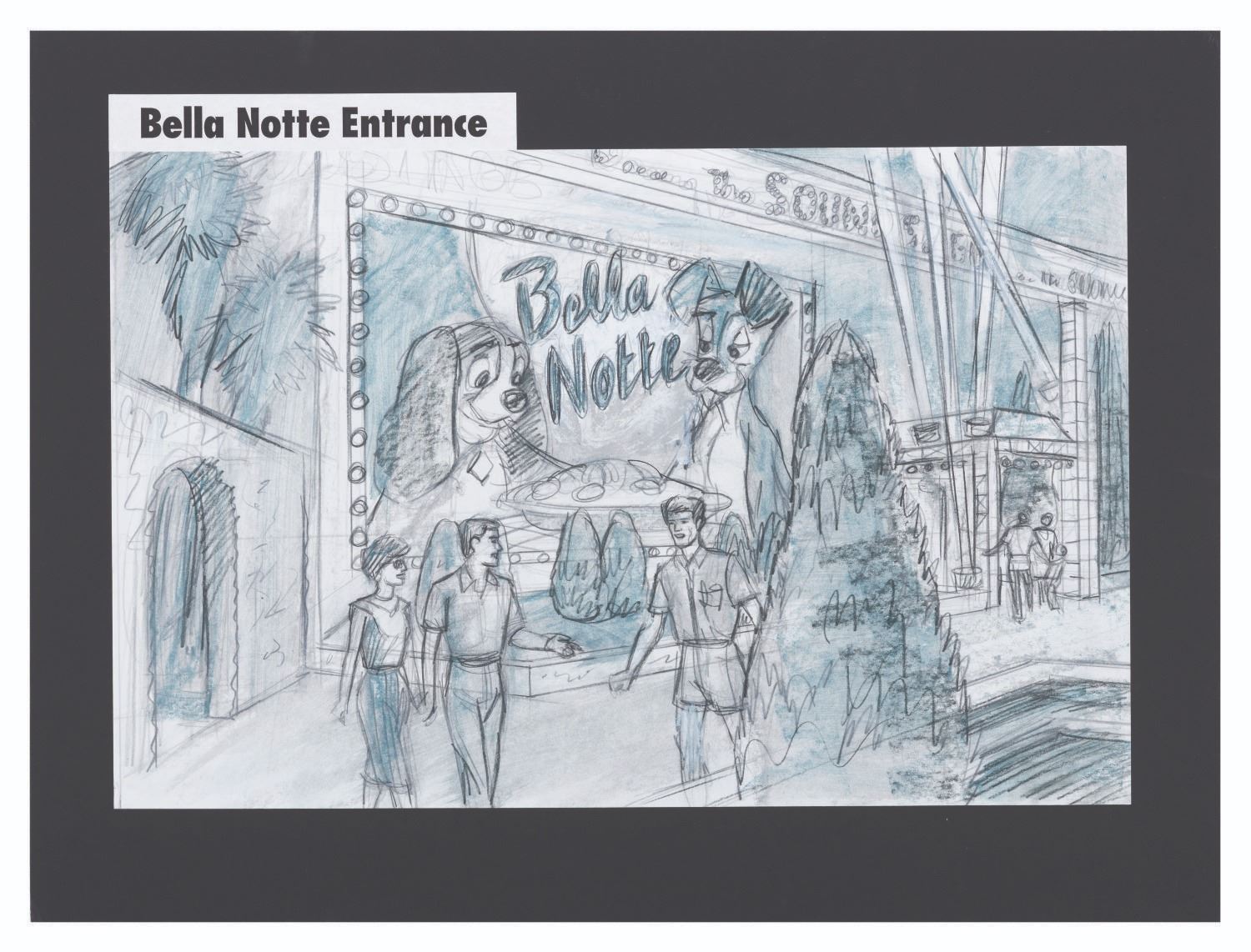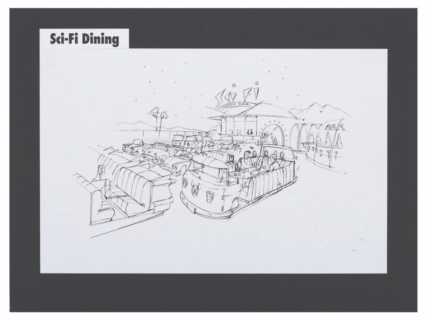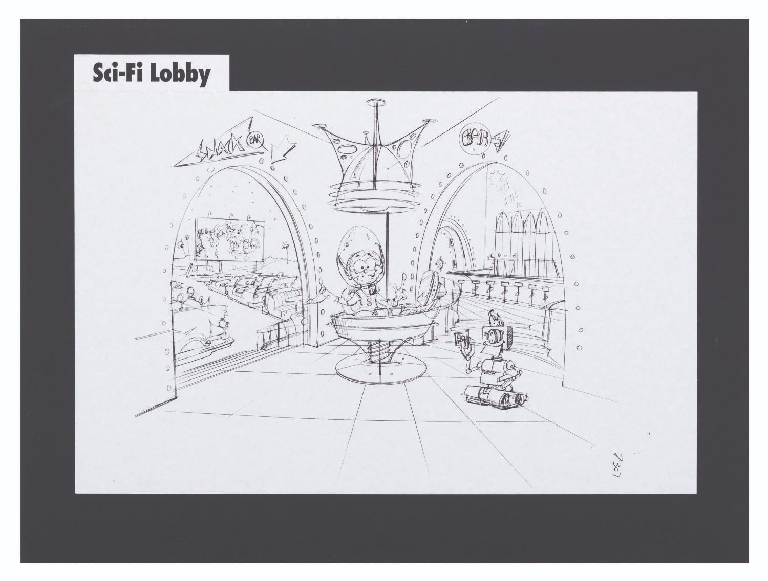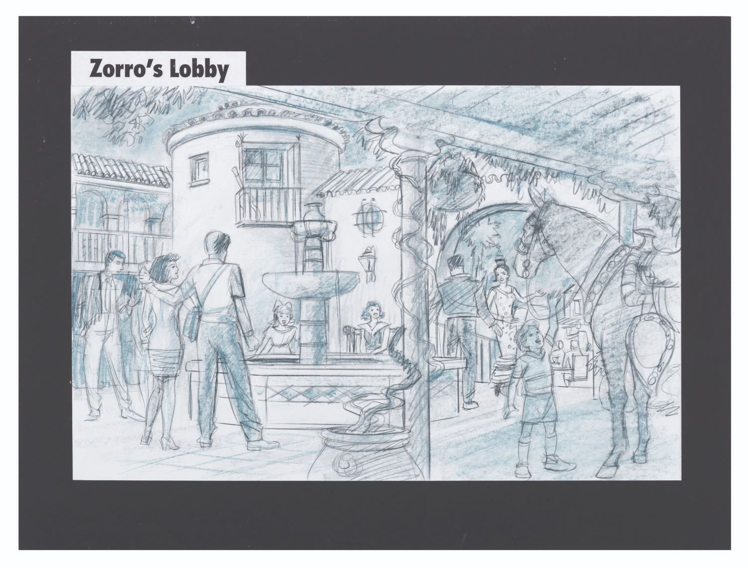 (Disney-MGM Studios, 1980s) A set of 11 presentation boards of concept art for restaurants at Disney-MGM Studios. Included are concepts for the 50s Prime Time Cafe, The Sound Stage, Bella Notte, the Sci-Fi Dine in Theater, and the never-realized Zorro’s Cantina. The concepts are a combination of graphite and colored pencil drawings and photocopies, representing the interiors and exteriors of the restaurants. Measuring 11" x 17" on 15" x 20" illustration board, the concept artwork is in very good, production-used condition with light handling wear.