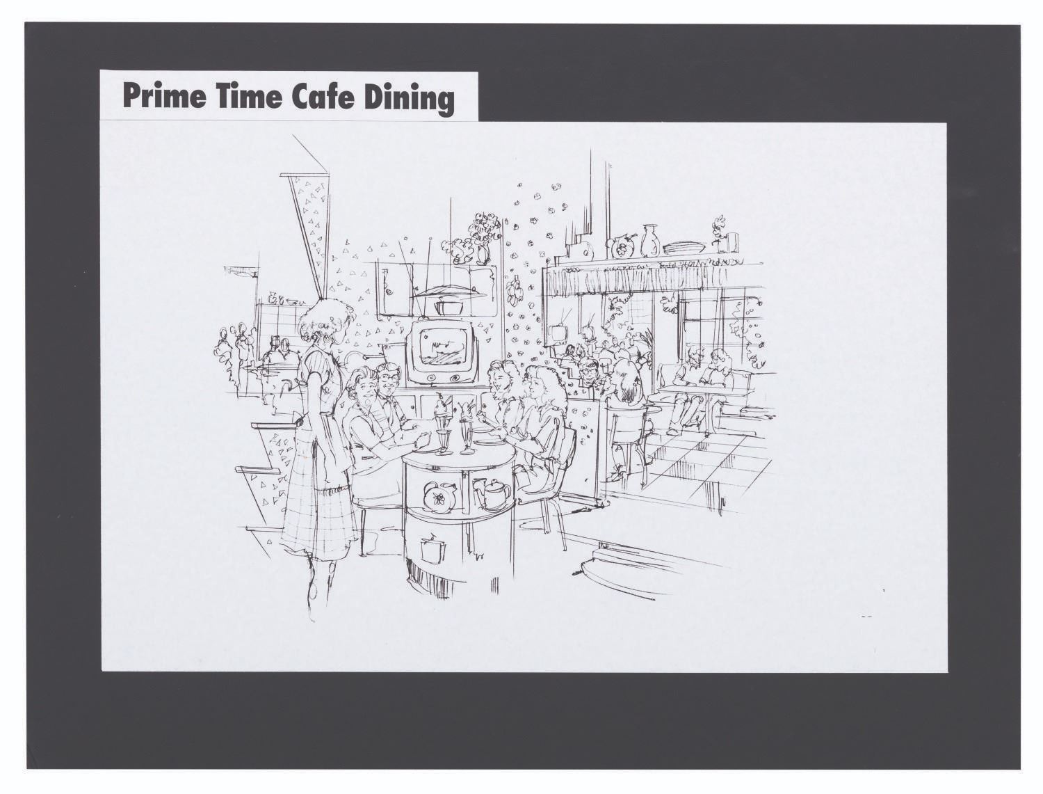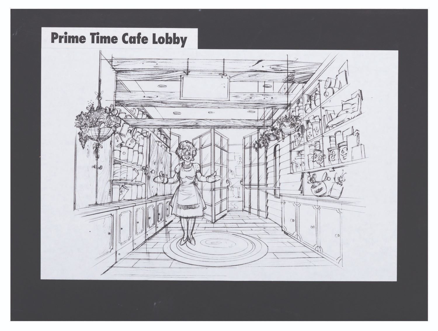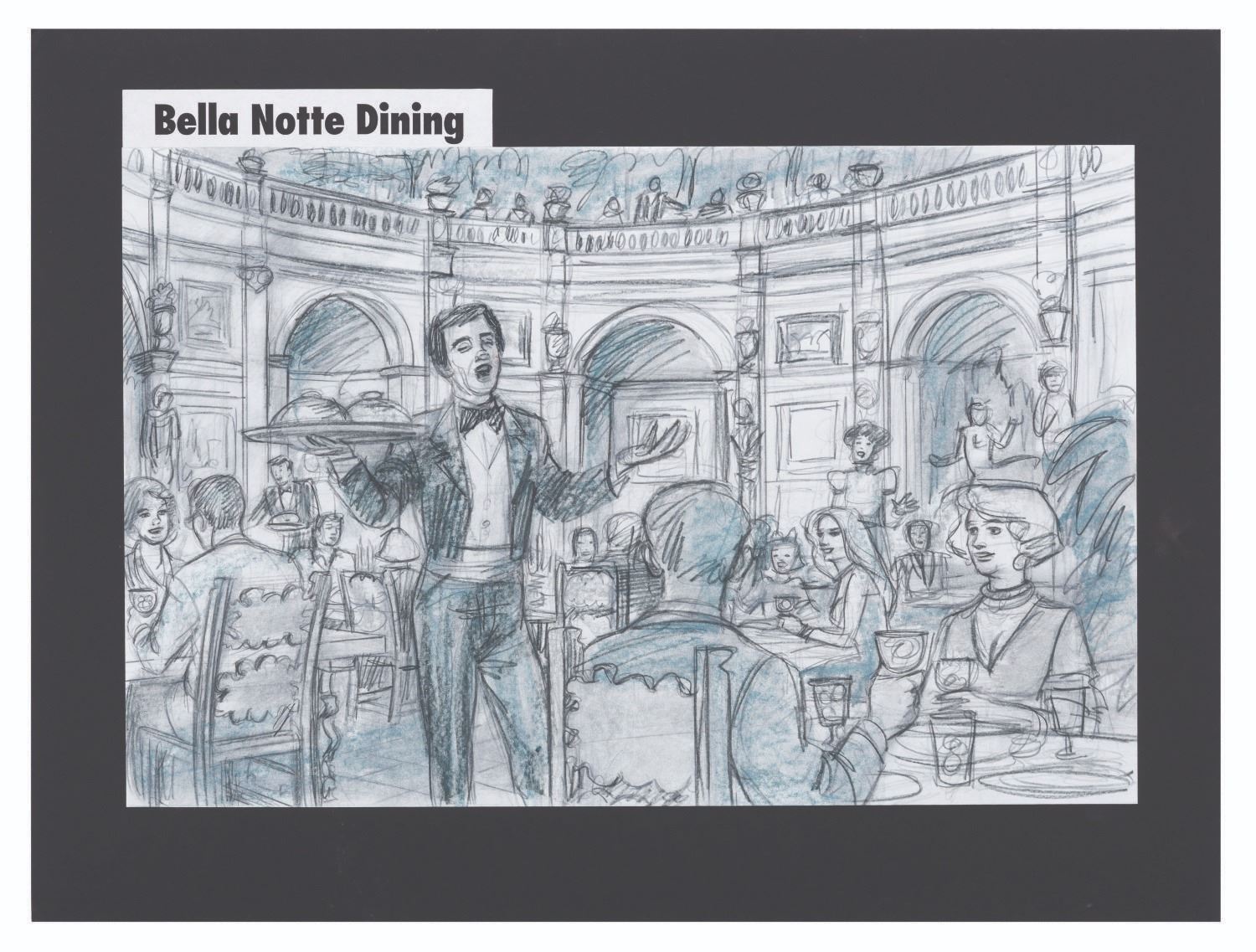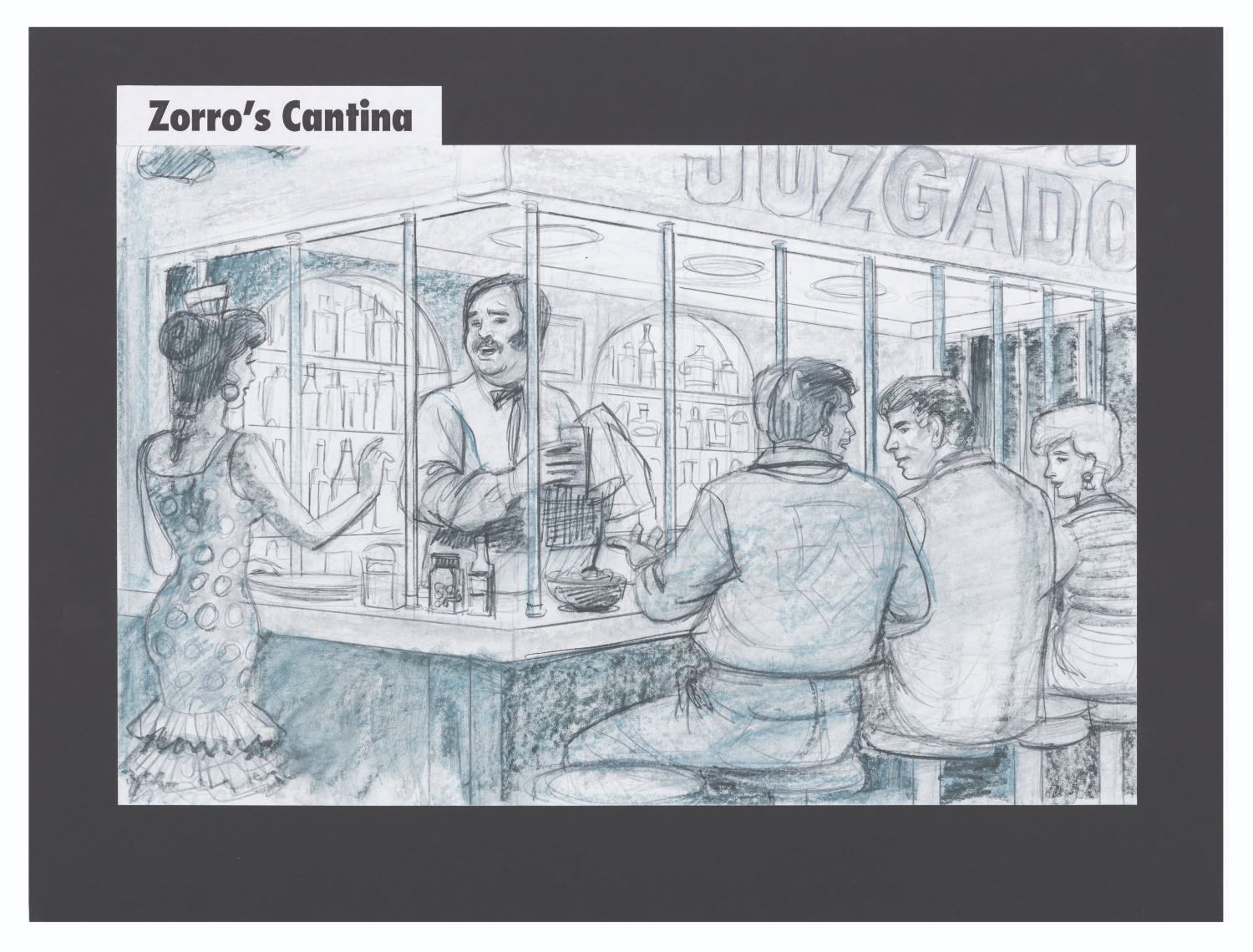 (Disney-MGM Studios, 1980s) A set of 11 presentation boards of concept art for restaurants at Disney-MGM Studios. Included are concepts for the 50s Prime Time Cafe, The Sound Stage, Bella Notte, the Sci-Fi Dine in Theater, and the never-realized Zorro’s Cantina. The concepts are a combination of graphite and colored pencil drawings and photocopies, representing the interiors and exteriors of the restaurants. Measuring 11" x 17" on 15" x 20" illustration board, the concept artwork is in very good, production-used condition with light handling wear.