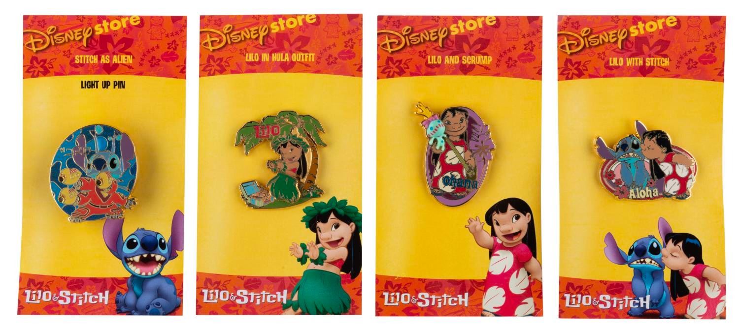(Disney Store, 2002) A set of four "Lilo & Stitch" pins, released in time with the debut of the film. The pins are in fine condition, including an alien Stitch pin with light-up feature that still works when tested.