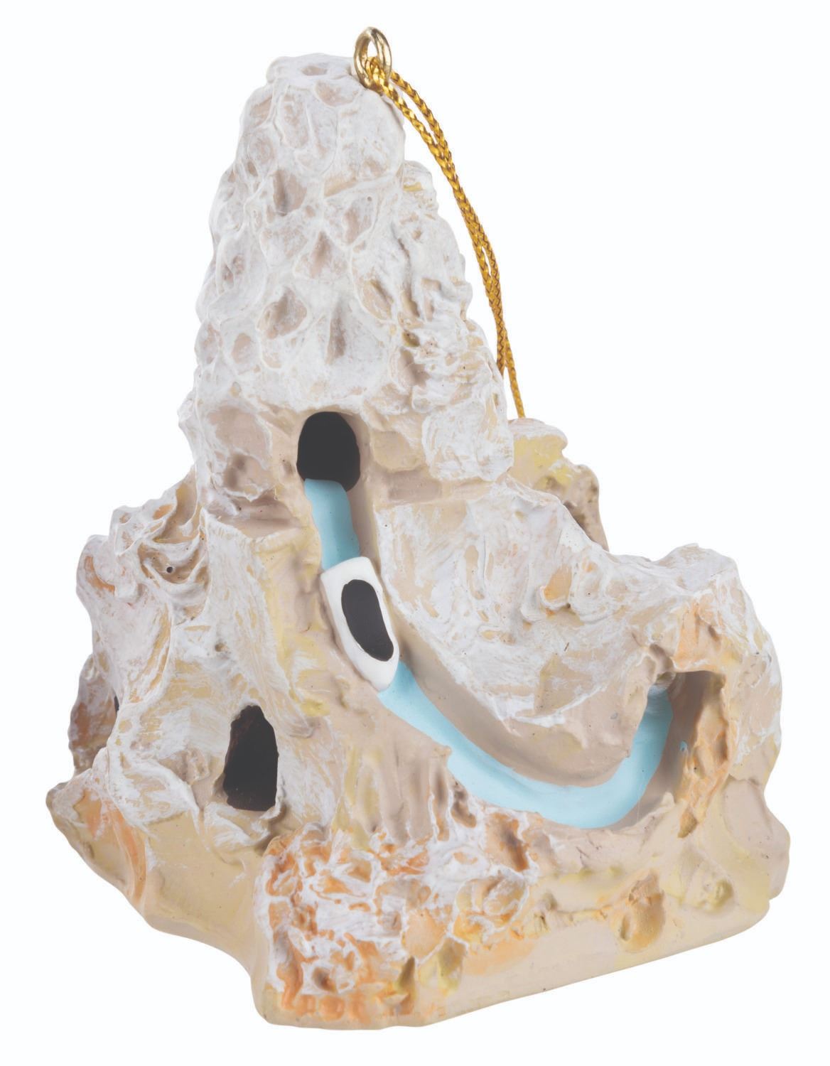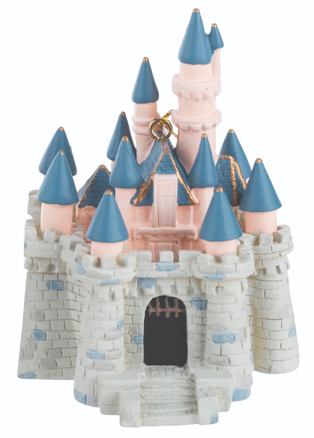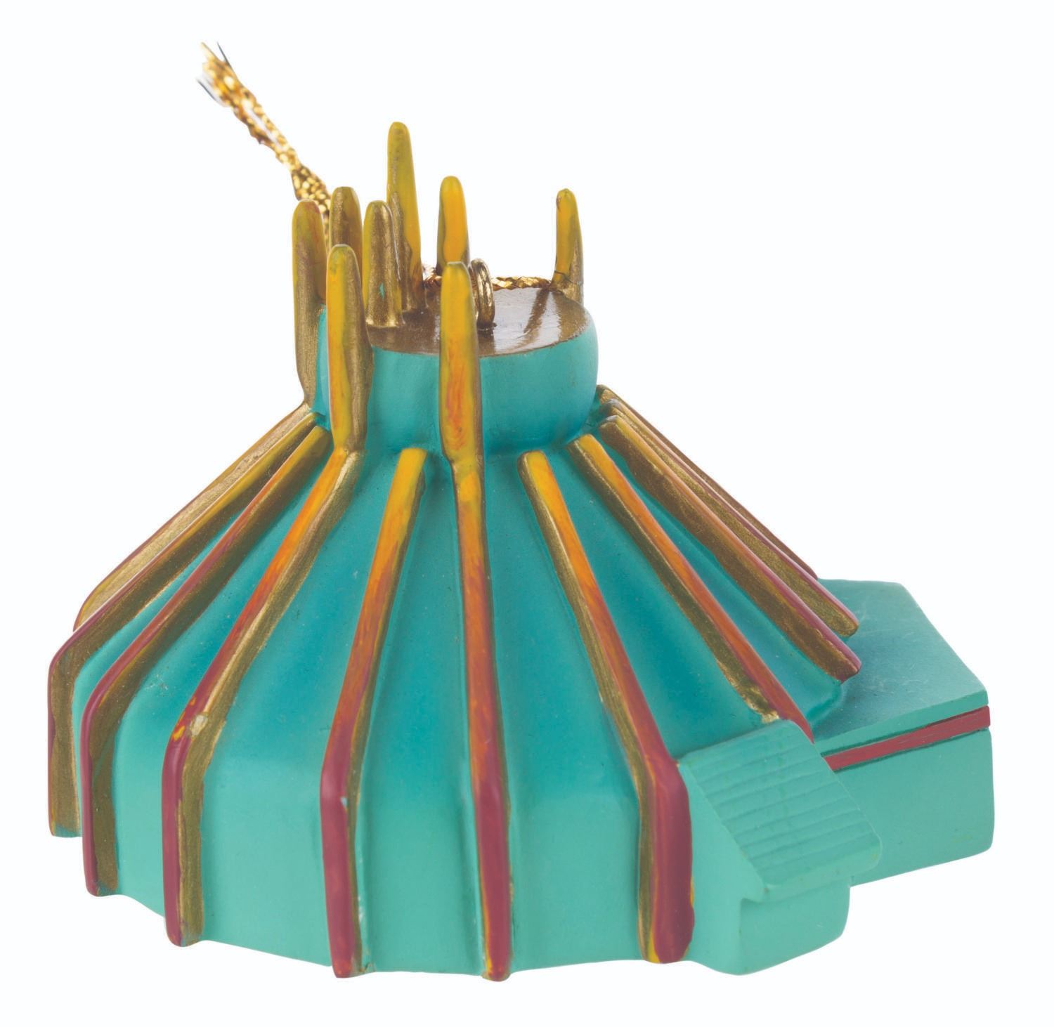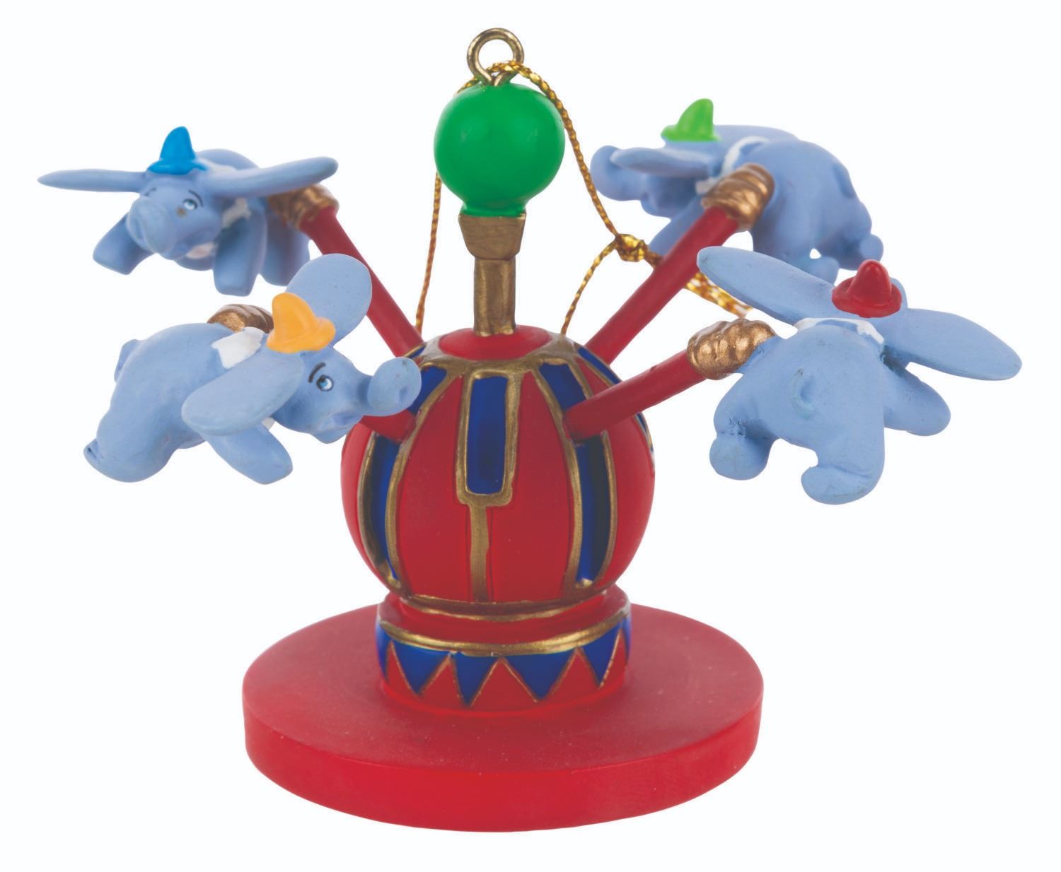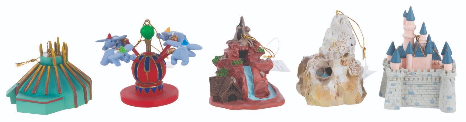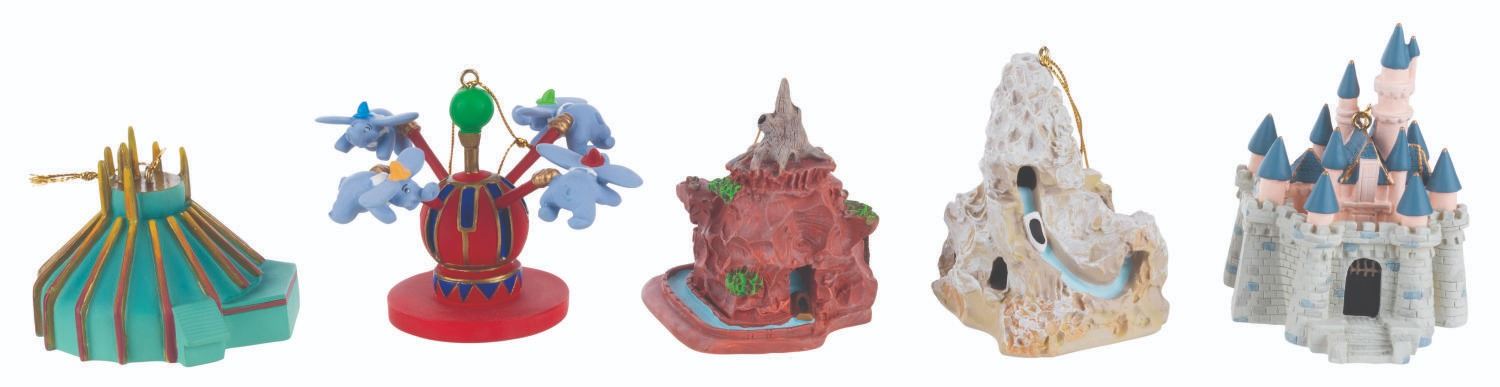 (Disneyland, 1999) A collection of five Disneyland attraction ornaments including the Matterhorn, Dumbo Ride, Splash Mountain, Space Mountain, and Sleeping Beauty Castle. Measuring up to 3" tall, the ornaments are in very good to fine condition.