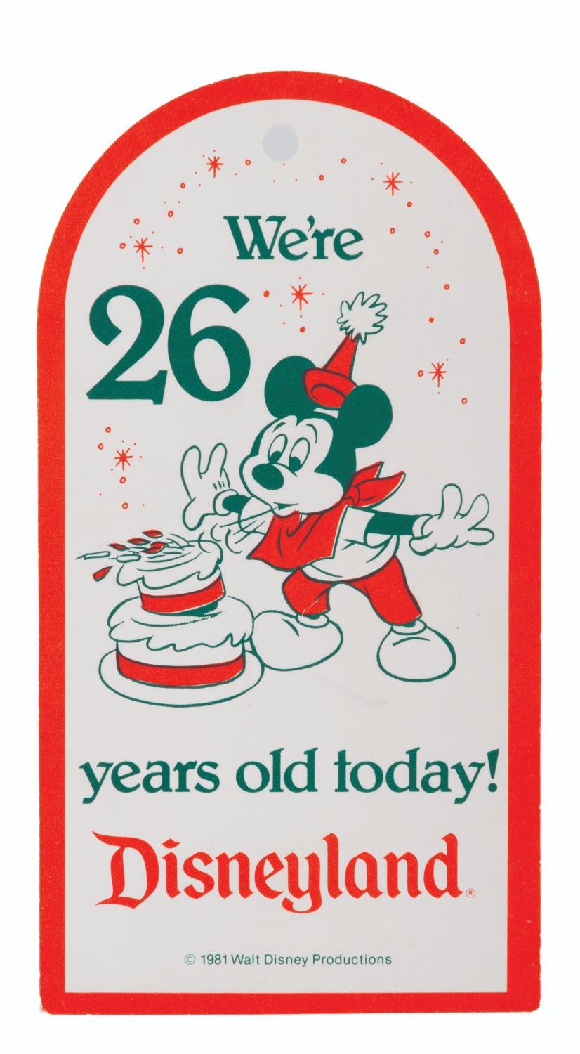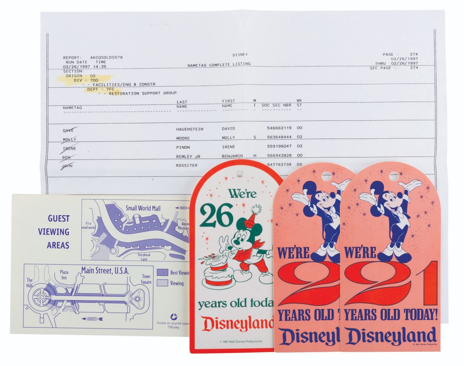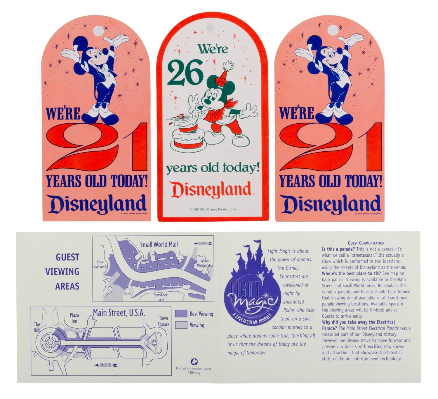 (Disneyland, 1976-1997) A collection of four Disneyland Cast Member paper items including two 21st birthday tags from 1976, one 26th birthday tag from 1981, and a Cast Member information card for the Light Magic Parade in 1996. Measuring 5" x 3.75" each, the paper items are in fine condition.