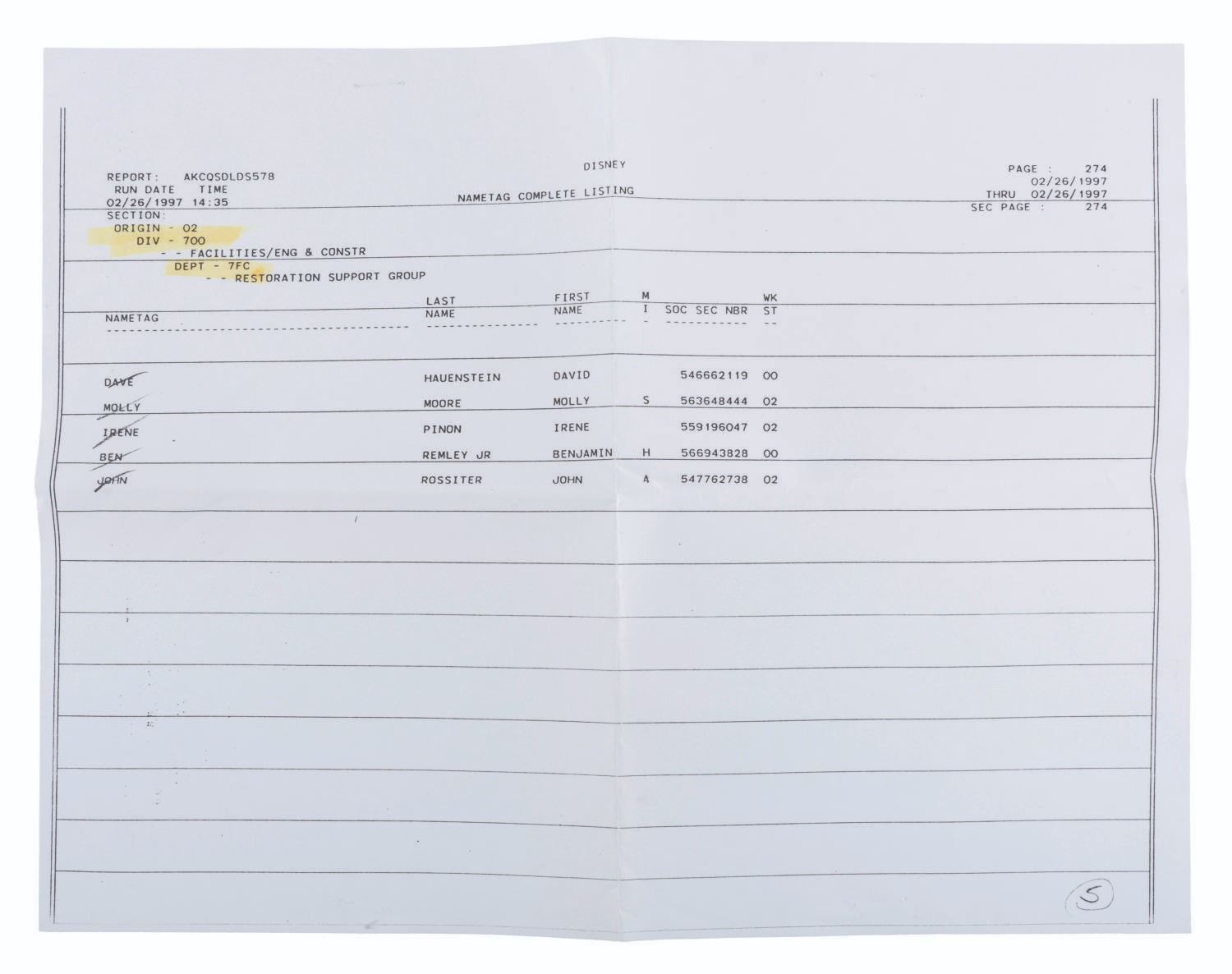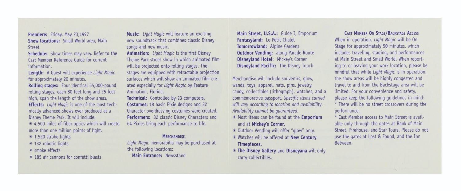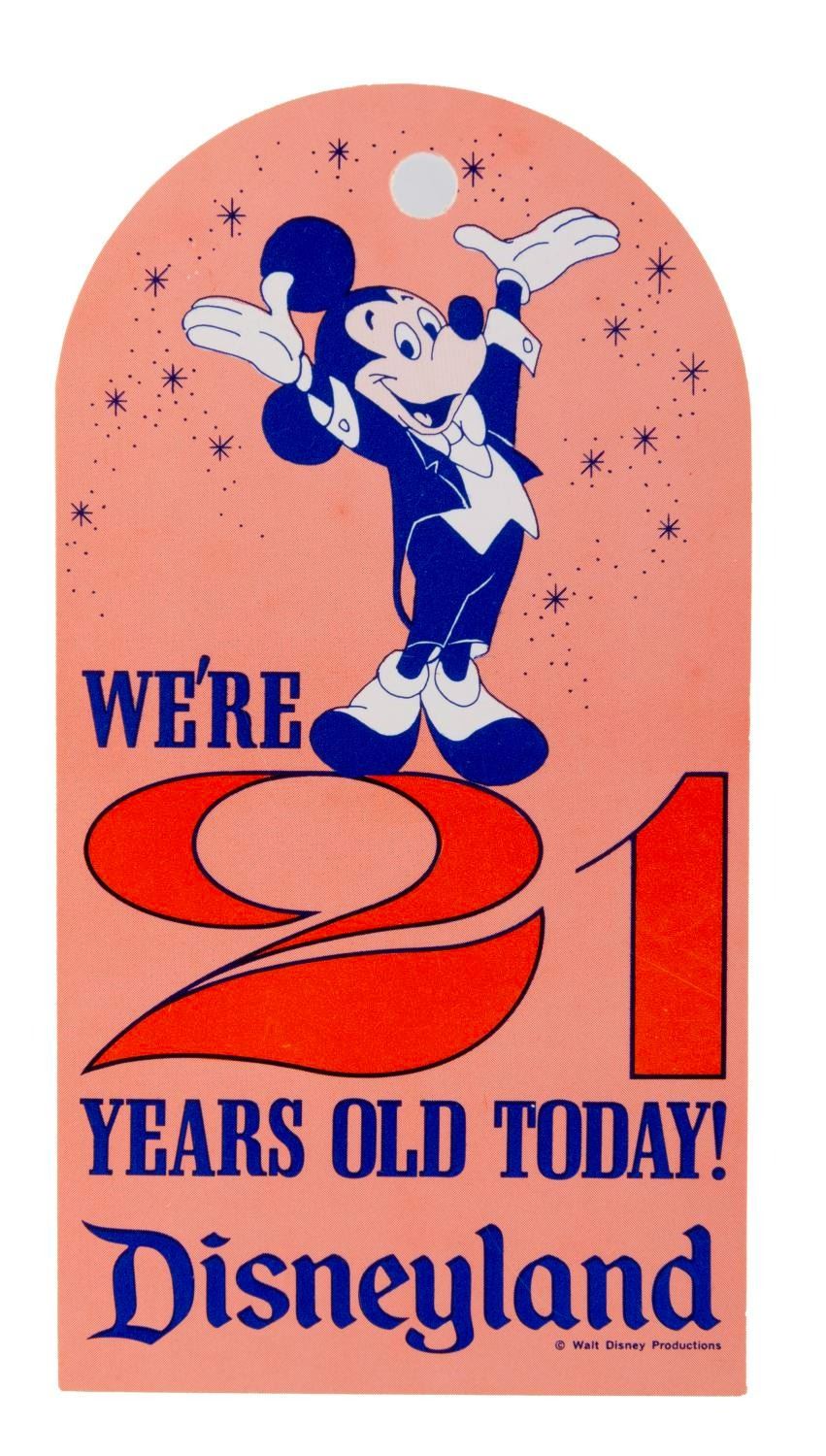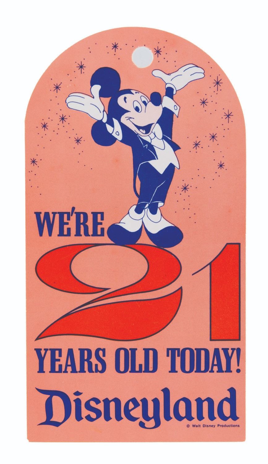 (Disneyland, 1976-1997) A collection of four Disneyland Cast Member paper items including two 21st birthday tags from 1976, one 26th birthday tag from 1981, and a Cast Member information card for the Light Magic Parade in 1996. Measuring 5" x 3.75" each, the paper items are in fine condition.