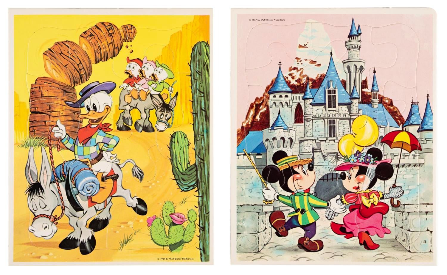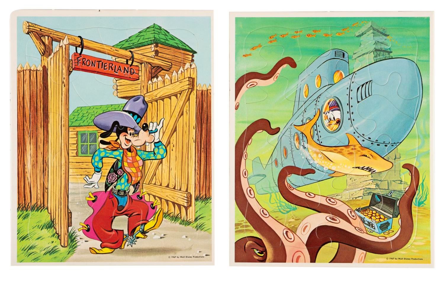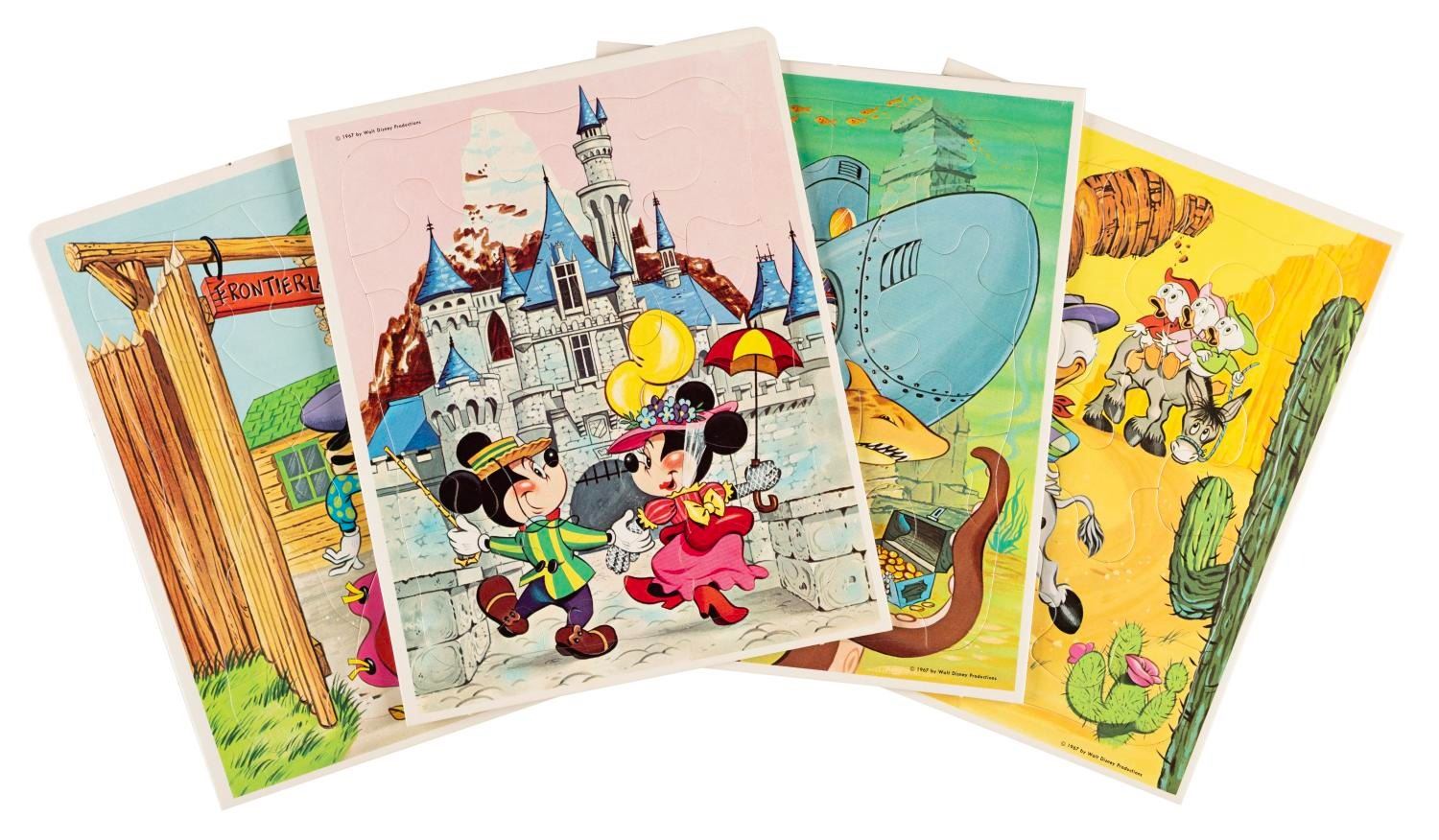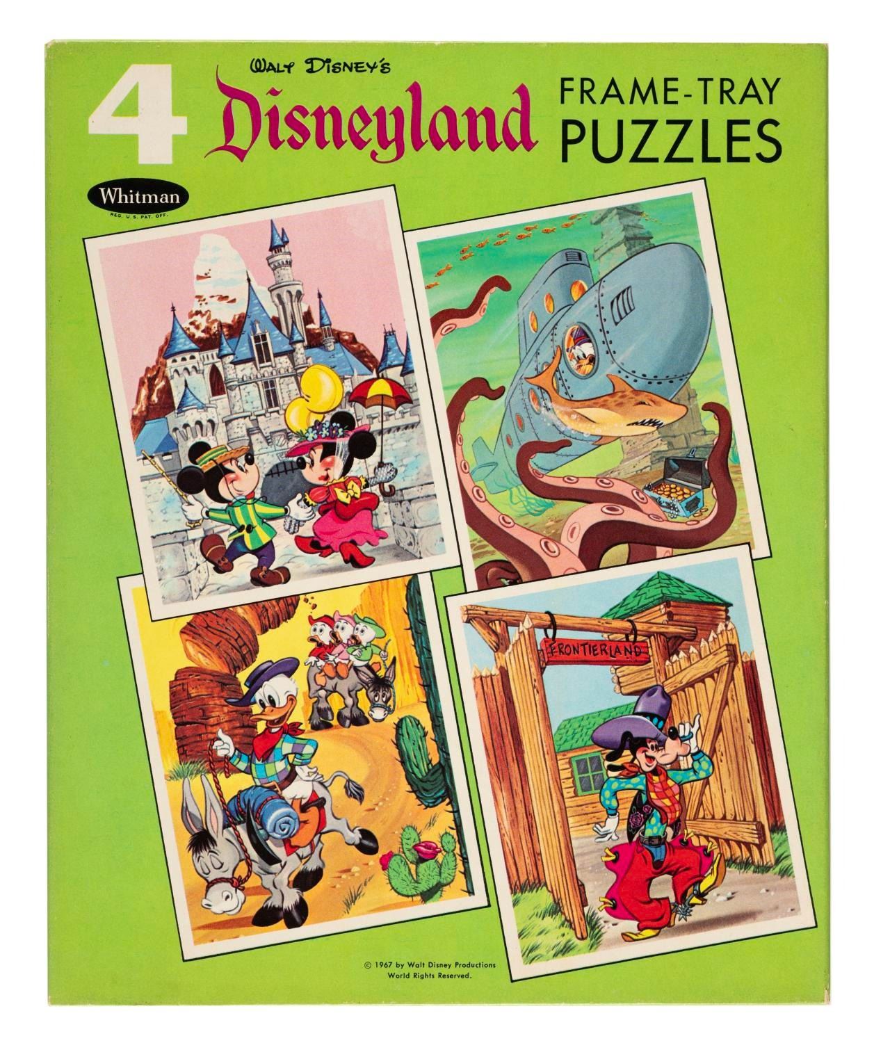 (Whitman, 1967) A set of four frame-tray puzzles inspired by Disneyland and featuring imagery of Sleeping Beauty Castle, the Submarine Voyage, the Pack Mules Through Nature's Wonderland, and Frontierland. Measuring 8.5" x 10.5", the puzzles are in very good condition with minimal edge wear and come in the original packaging, which shows minimal wear, including a library stamp and handwritten date on the reverse.