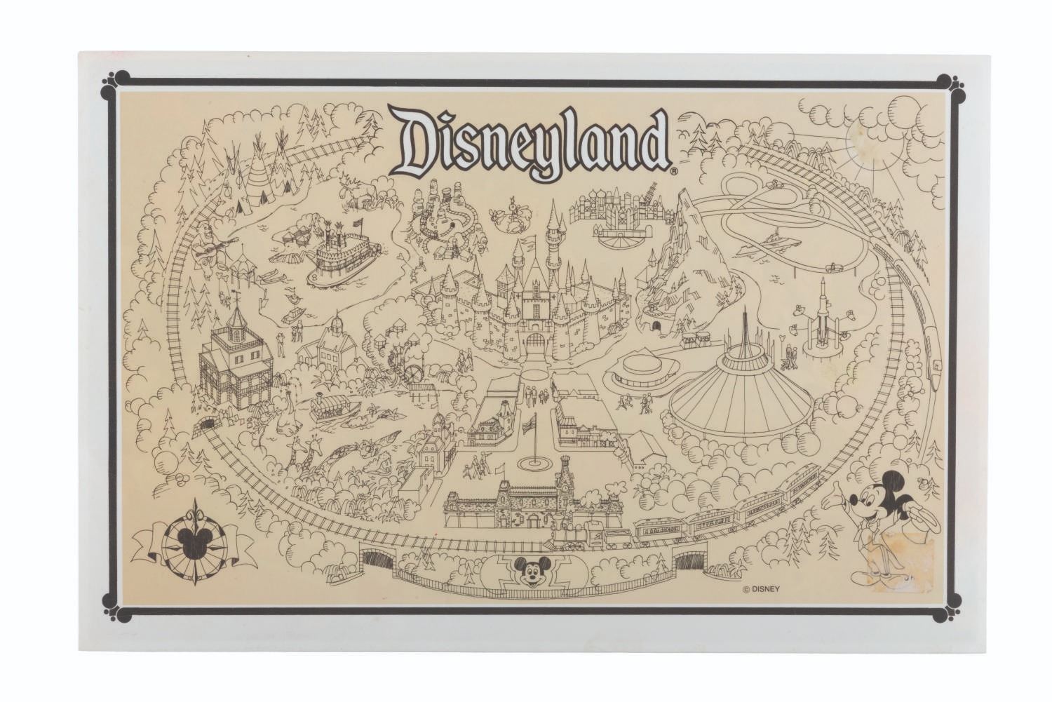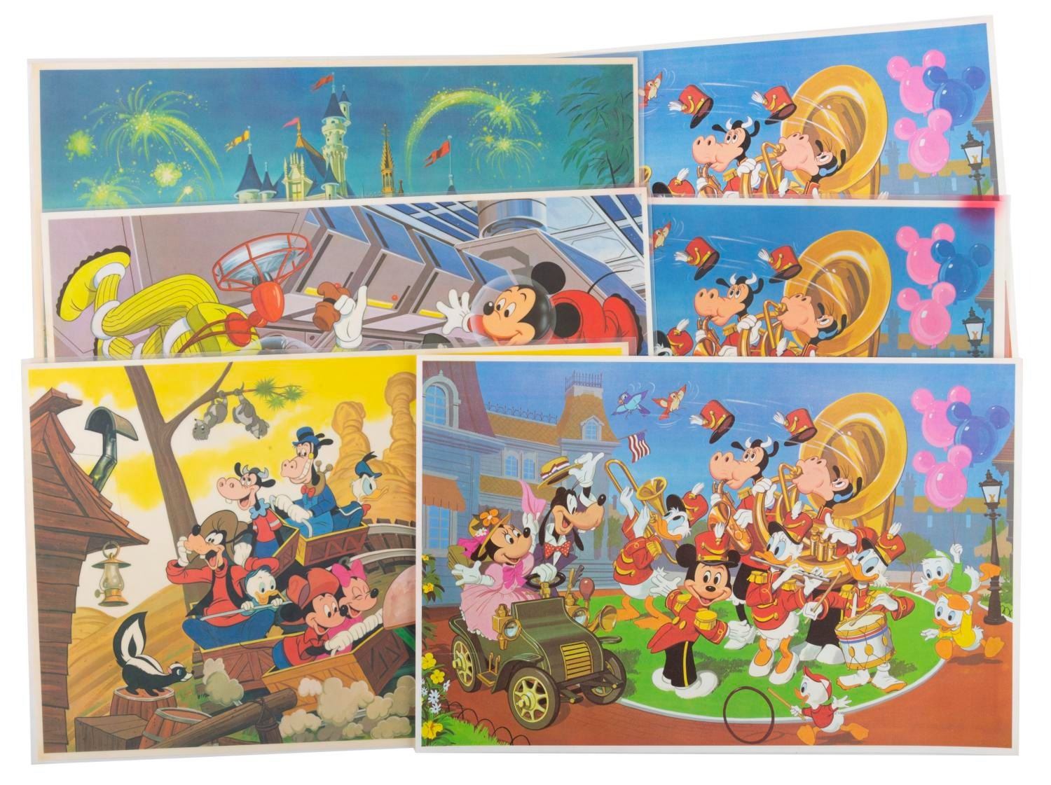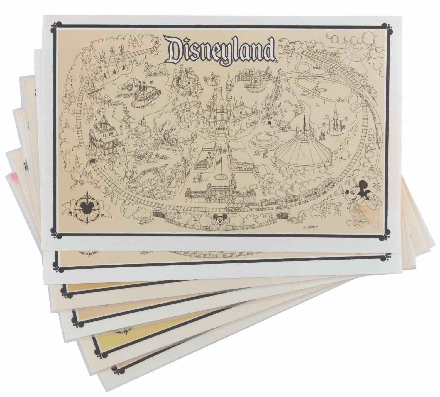 (Disneyland, 1980s) A collection of six laminated placemats of Mickey and Friends in different scenes inspired by Disneyland, each with a map of the Park on the reverse. Included is a set of four different designs released in the early 1980s, plus two extra of the Main Street Disneyland Band scene released in the late 1980s. Measuring 11.5” x 17.25”, the maps are in good to very good condition with light stains and light discoloration from age, including some red spots on the edge of the map sides.