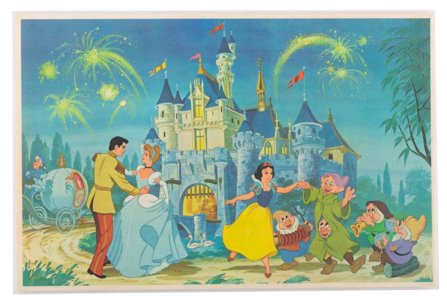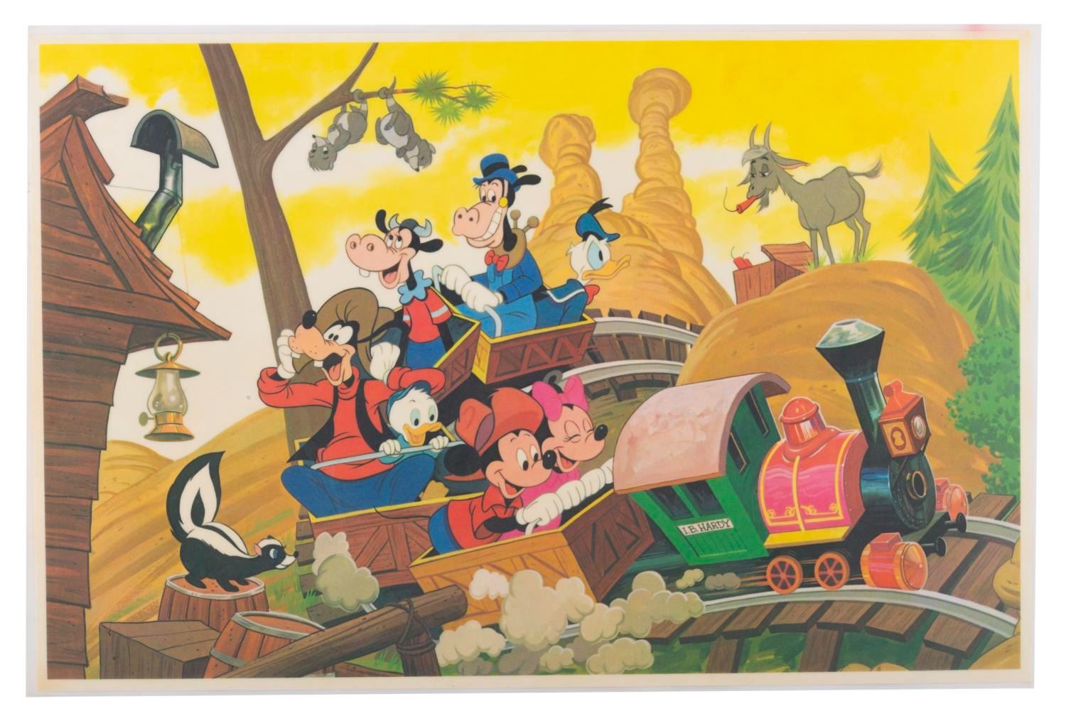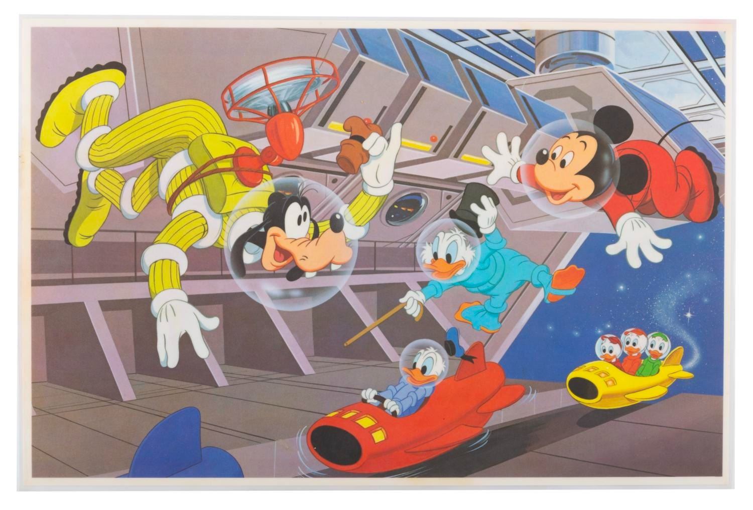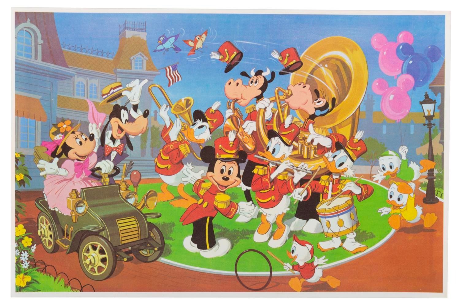 (Disneyland, 1980s) A collection of six laminated placemats of Mickey and Friends in different scenes inspired by Disneyland, each with a map of the Park on the reverse. Included is a set of four different designs released in the early 1980s, plus two extra of the Main Street Disneyland Band scene released in the late 1980s. Measuring 11.5” x 17.25”, the maps are in good to very good condition with light stains and light discoloration from age, including some red spots on the edge of the map sides.