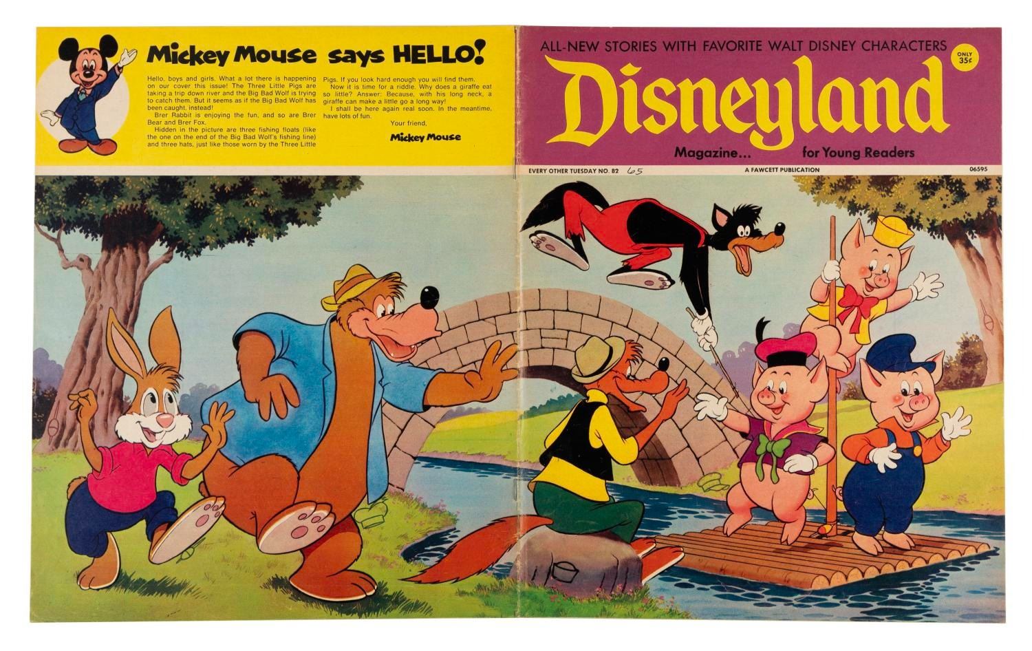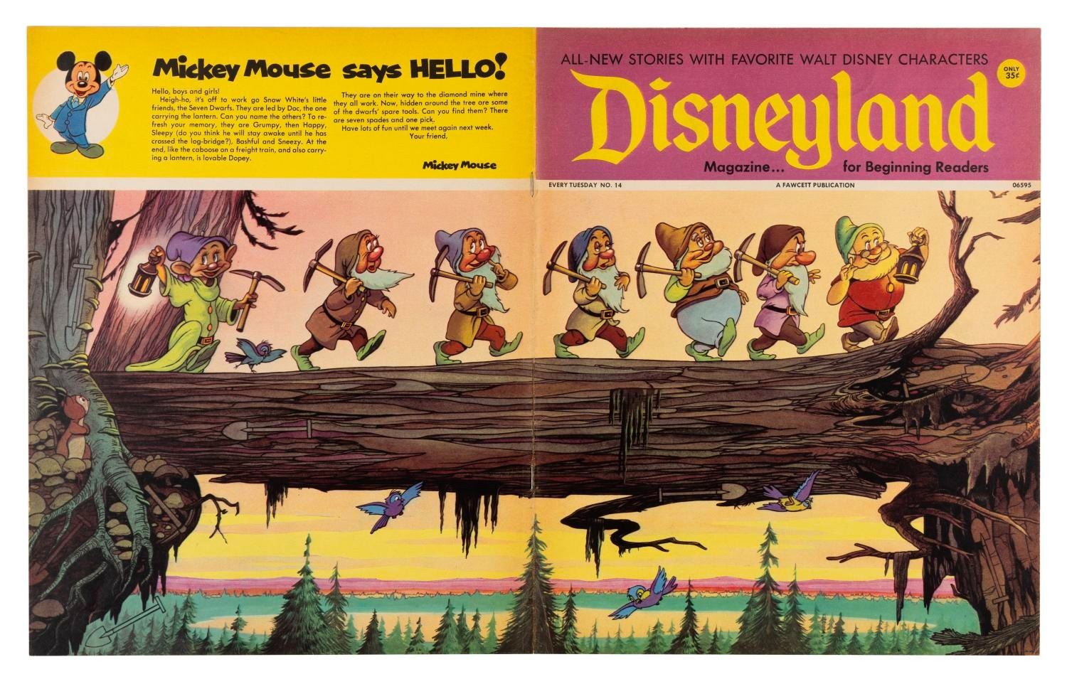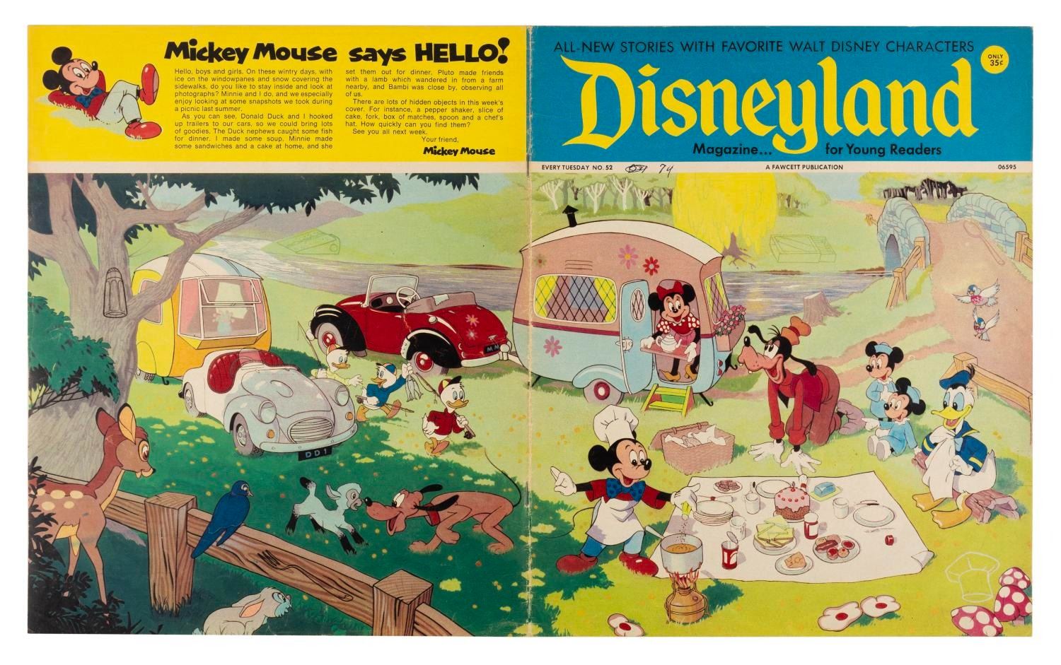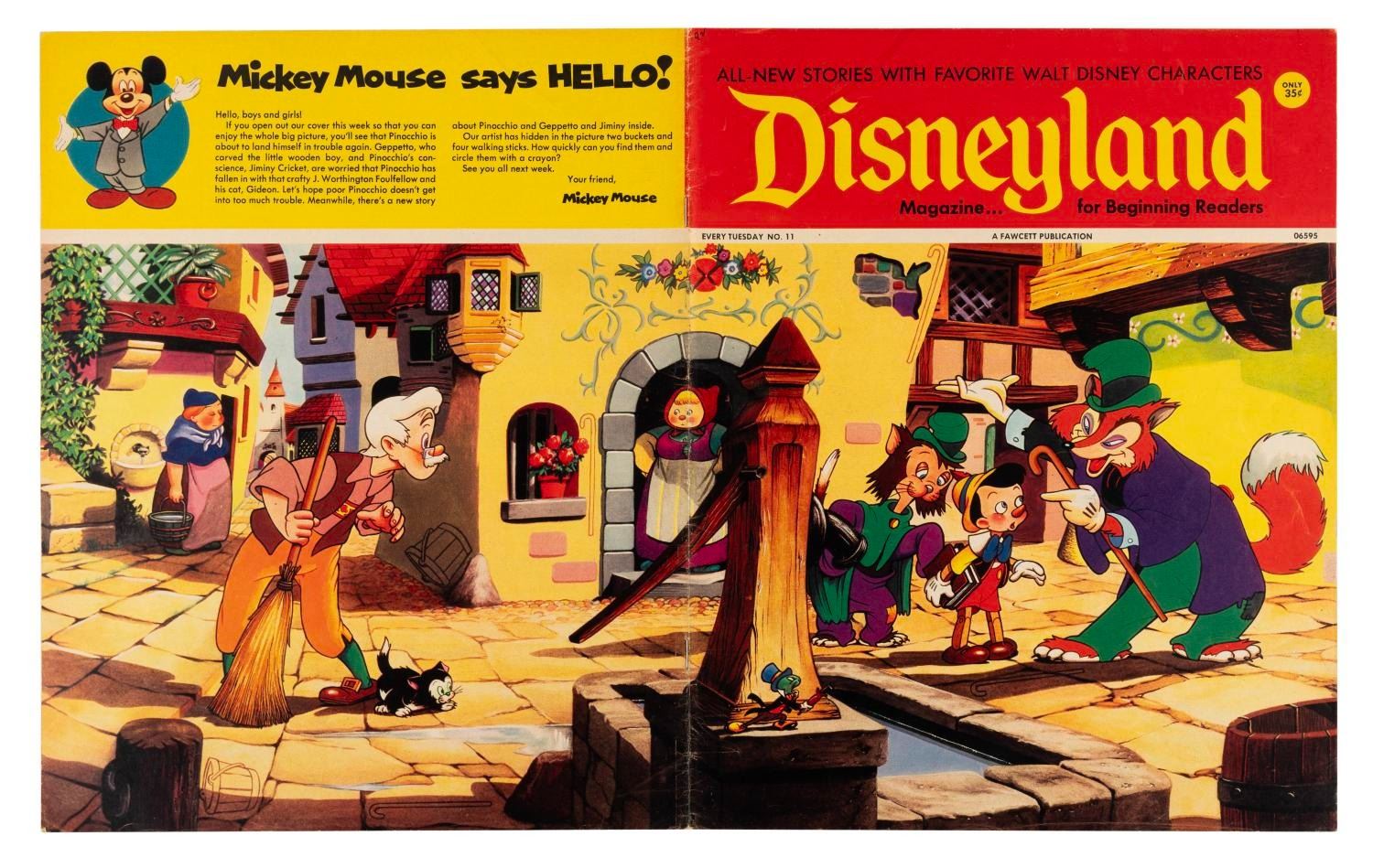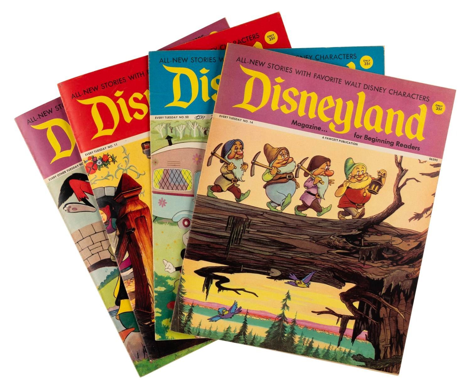 (Fawcett, 1960s/70s) A collection of four covers from Disneyland Magazine published by Fawcett, including issues No. 11, 14, 52, and 82. Measuring 12.5" x 10.5" each, the incomplete magazines are in very good condition with discoloration, light handling wear, and scuffing along the spines.