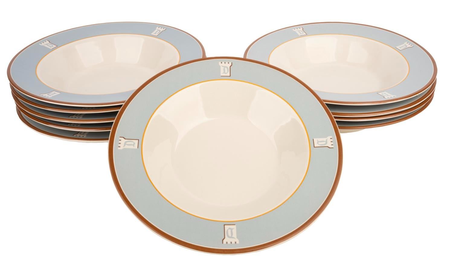 (Disneyland, 1980s-90s) A set of ten Disneyland bowls decorated with a two-color Disneyland marquee. Measuring 9" in diameter, this dishware is in very good condition with minor wear.