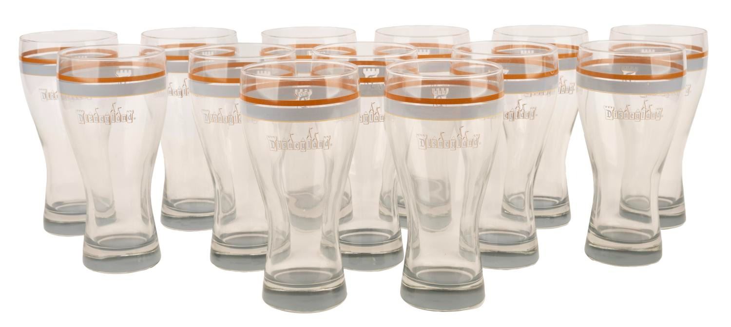 (Disneyland, 1980s-90s) A set of thirteen Disneyland soda glasses decorated with a two-color Disneyland marquee. Measuring 7" tall and 3.5" in diameter, these cups are in very good condition with minor wear.