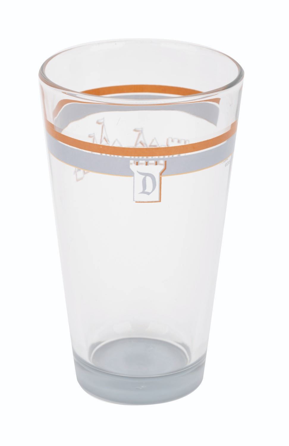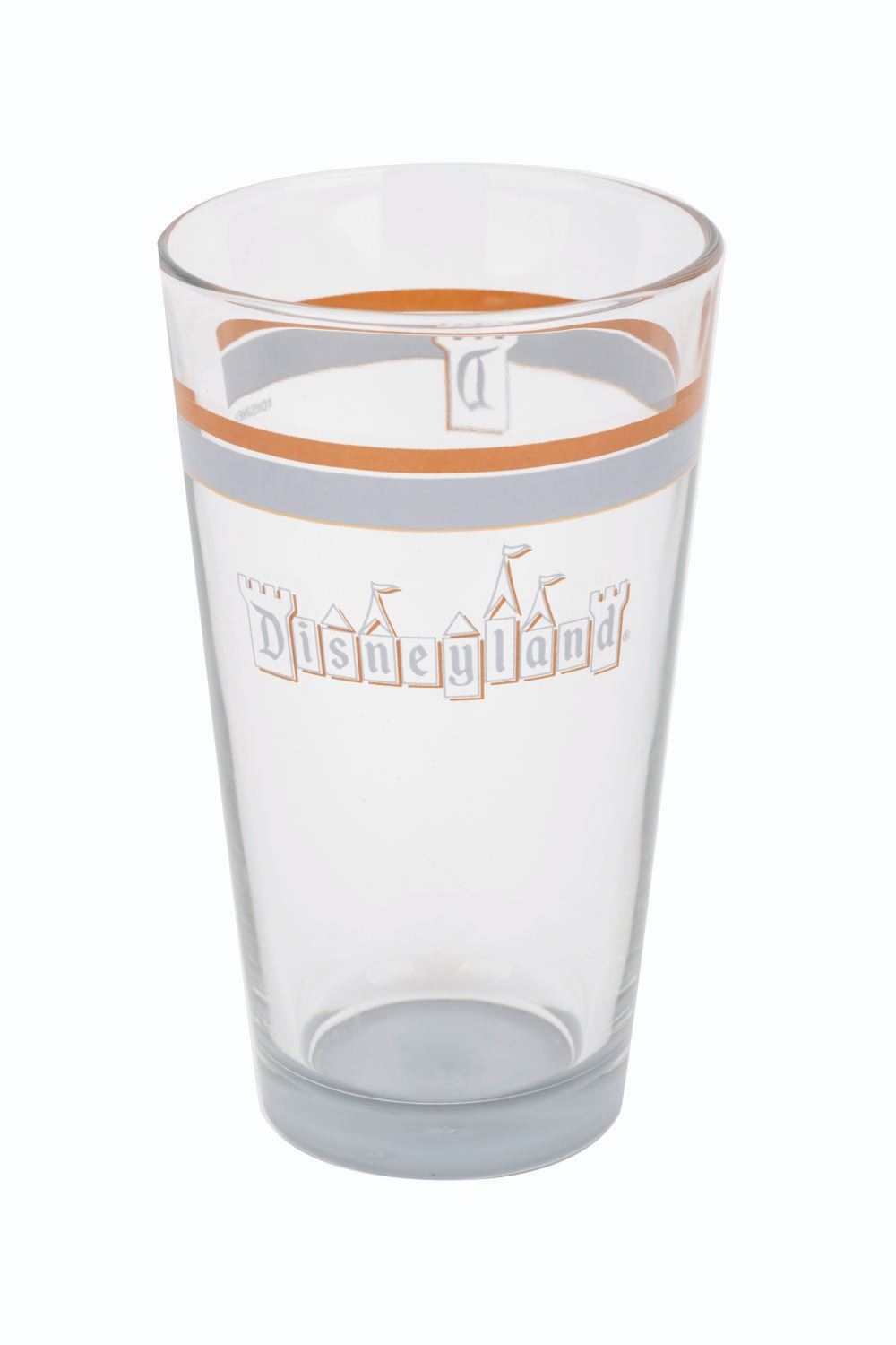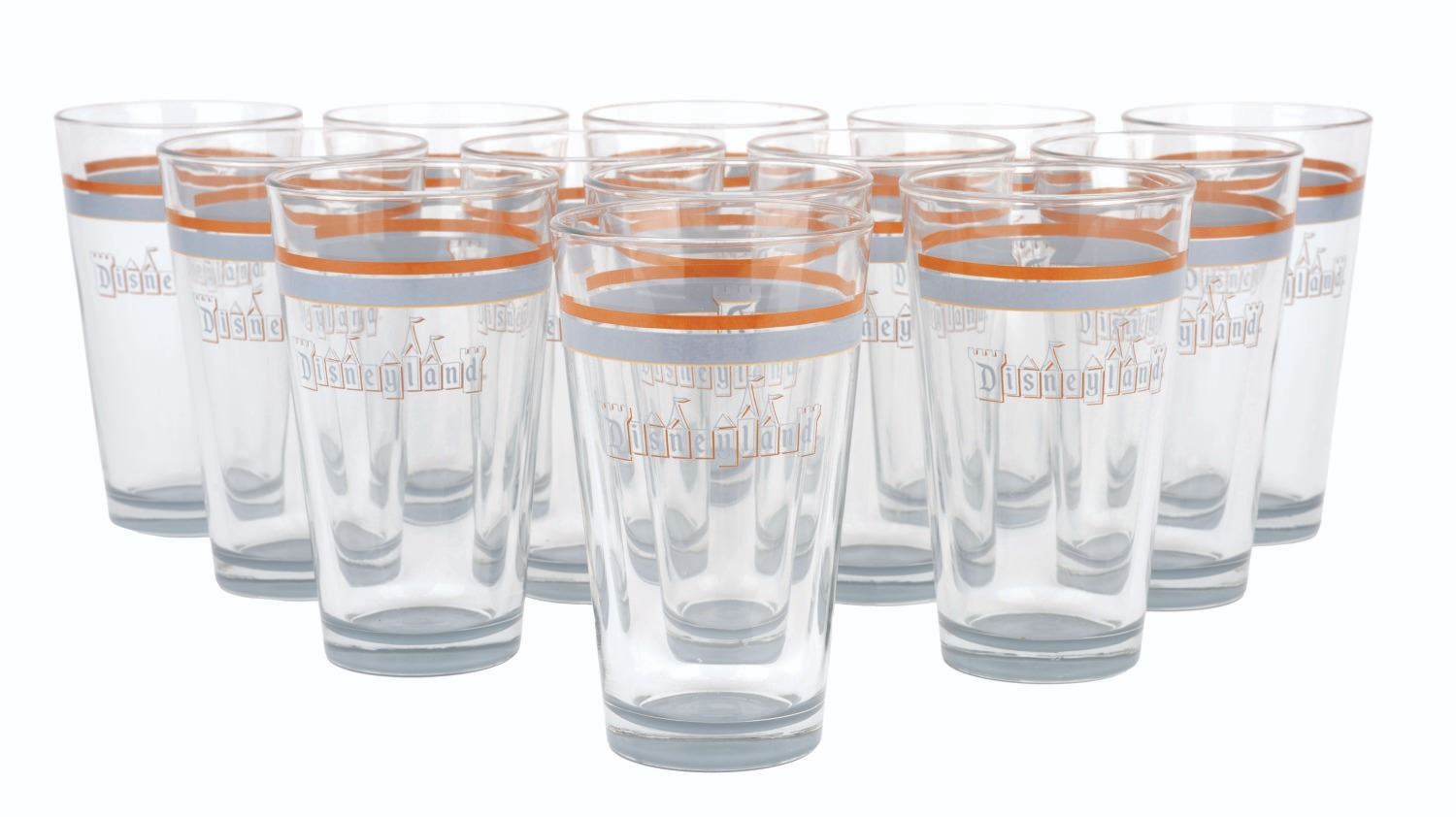 (Disneyland, 1980s-90s) A set of 13 Disneyland Pint Glasses. This set of glasses is decorated with a two-color Disneyland marquee. Measuring 5.75" tall and 3.5" in diameter, all are in very good condition with minor wear.