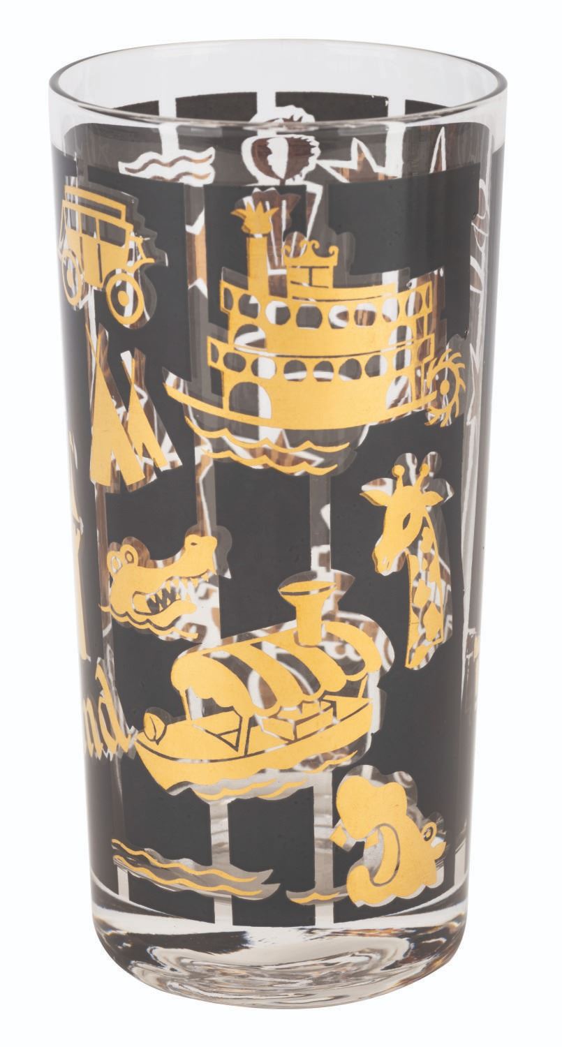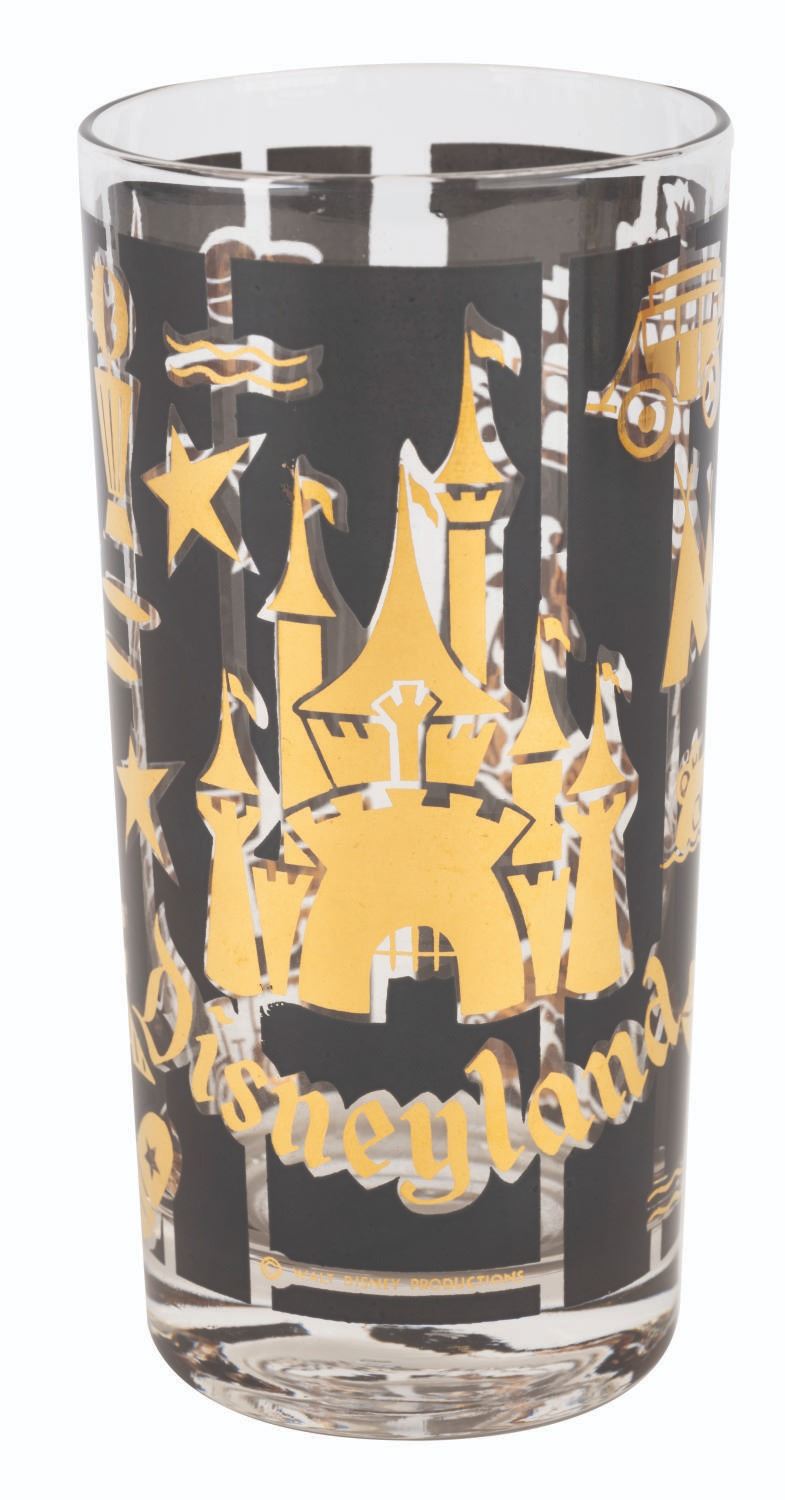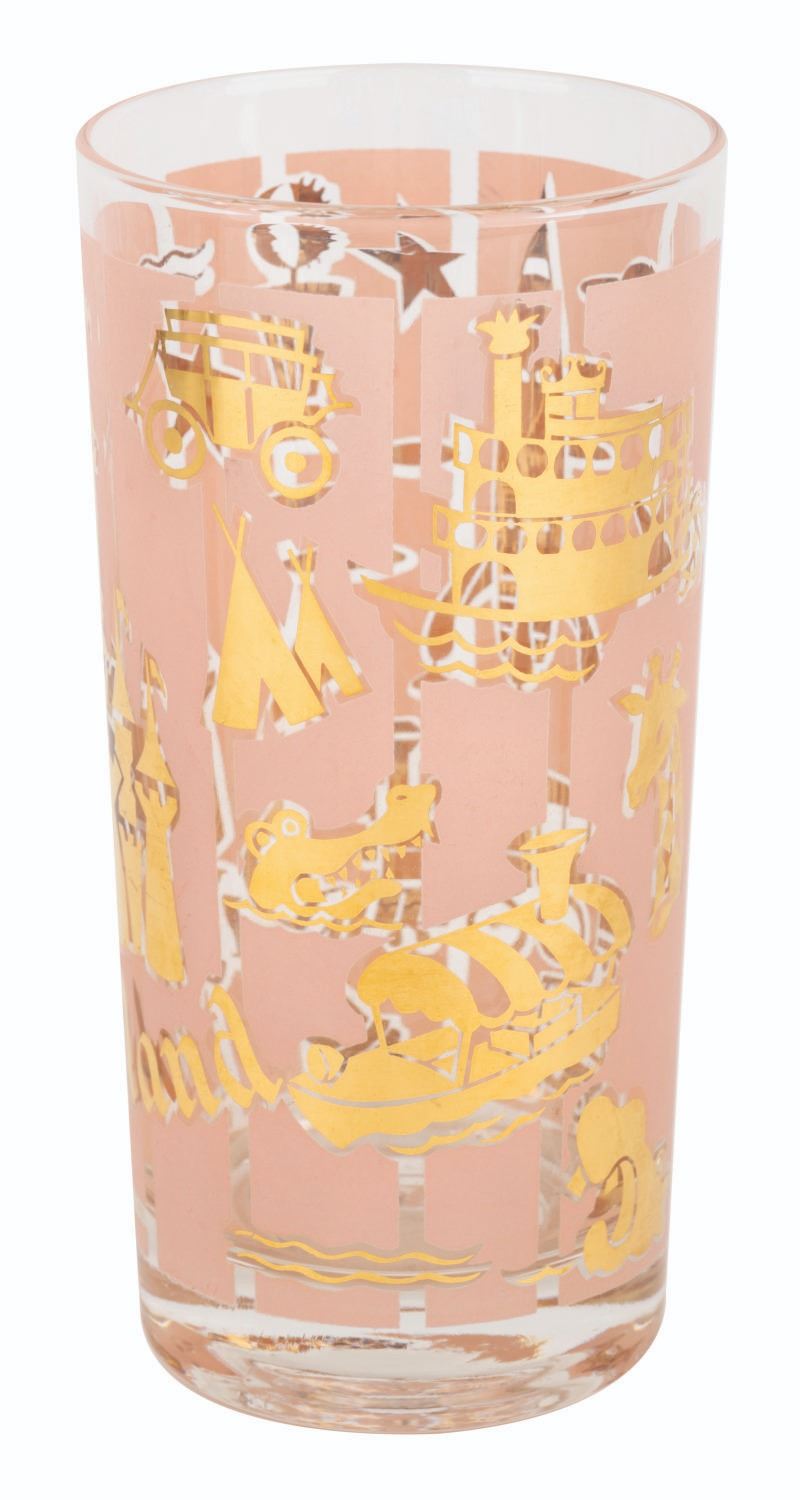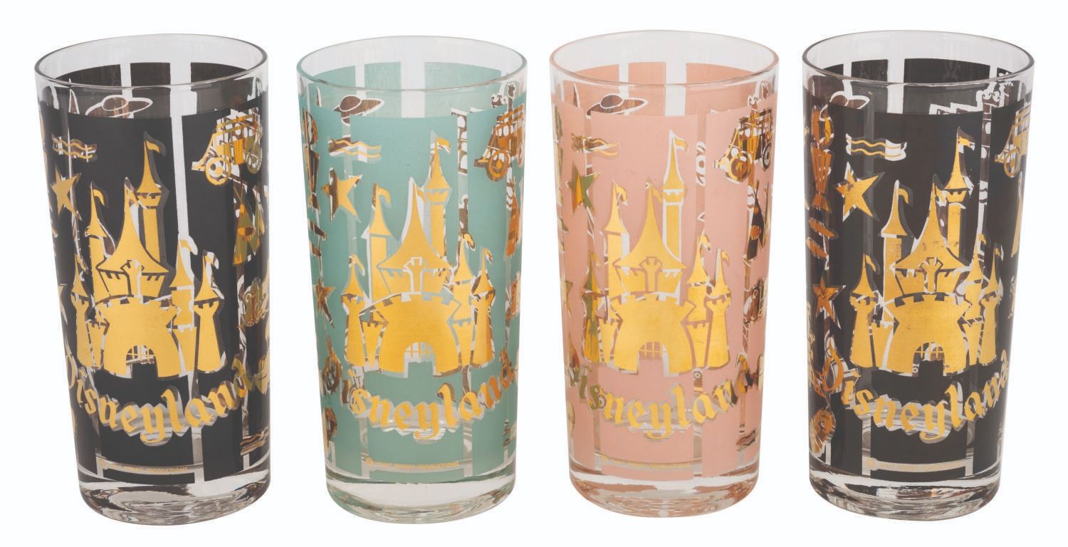 (Disneyland, 1960s) A set of four souvenir highball tumblers from Disneyland. The glasses feature fabulous Disneyland attraction imagery established in colorful silhouettes and gold leaf accents. Each glass measures 5.5" tall and 2.75" in diameter and is in very good condition, with faint scuffing to the cup's surface and exterior motif.