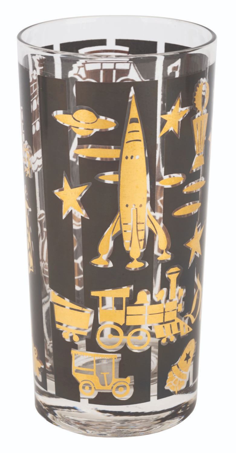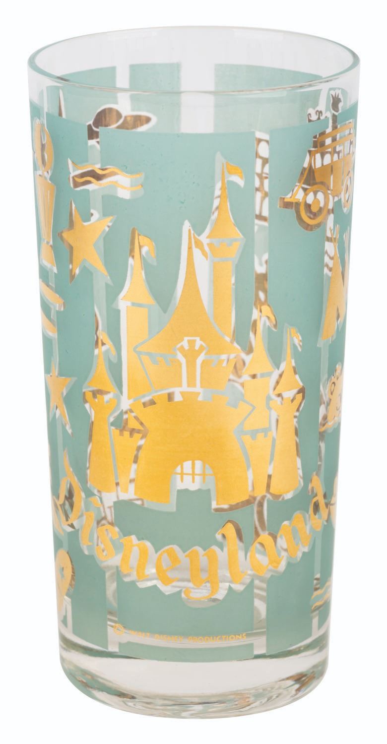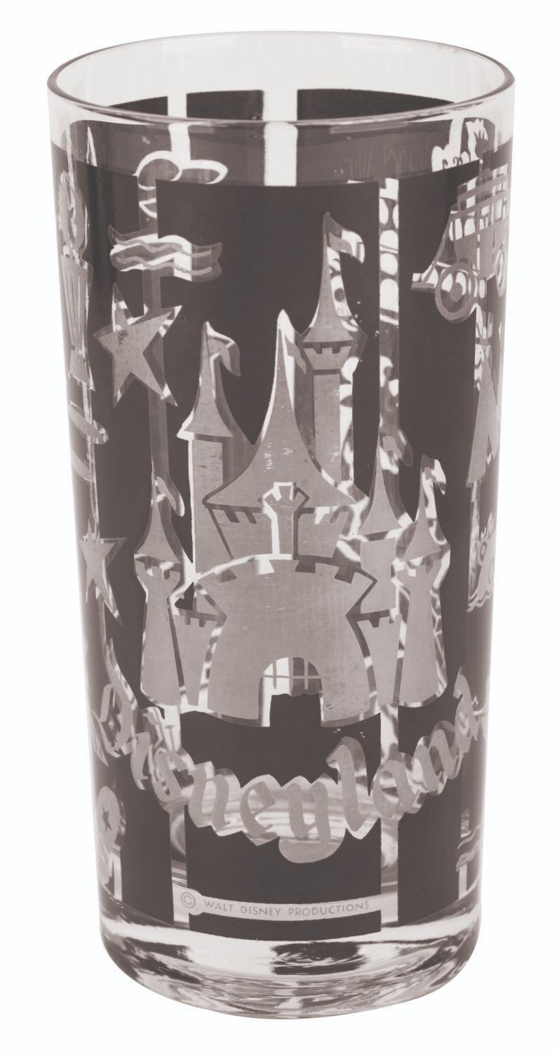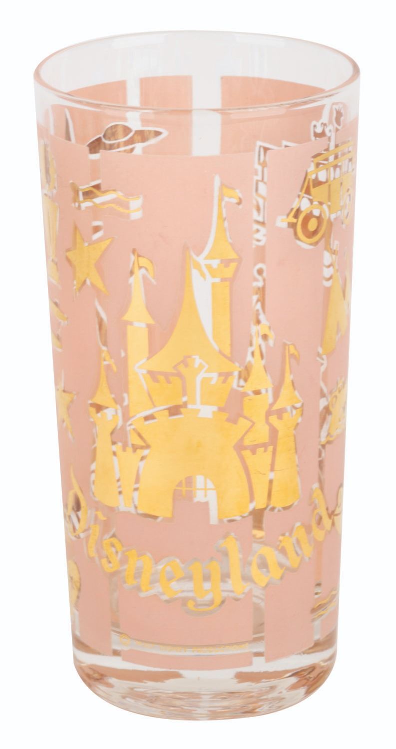 (Disneyland, 1960s) A set of four souvenir highball tumblers from Disneyland. The glasses feature fabulous Disneyland attraction imagery established in colorful silhouettes and gold leaf accents. Each glass measures 5.5" tall and 2.75" in diameter and is in very good condition, with faint scuffing to the cup's surface and exterior motif.