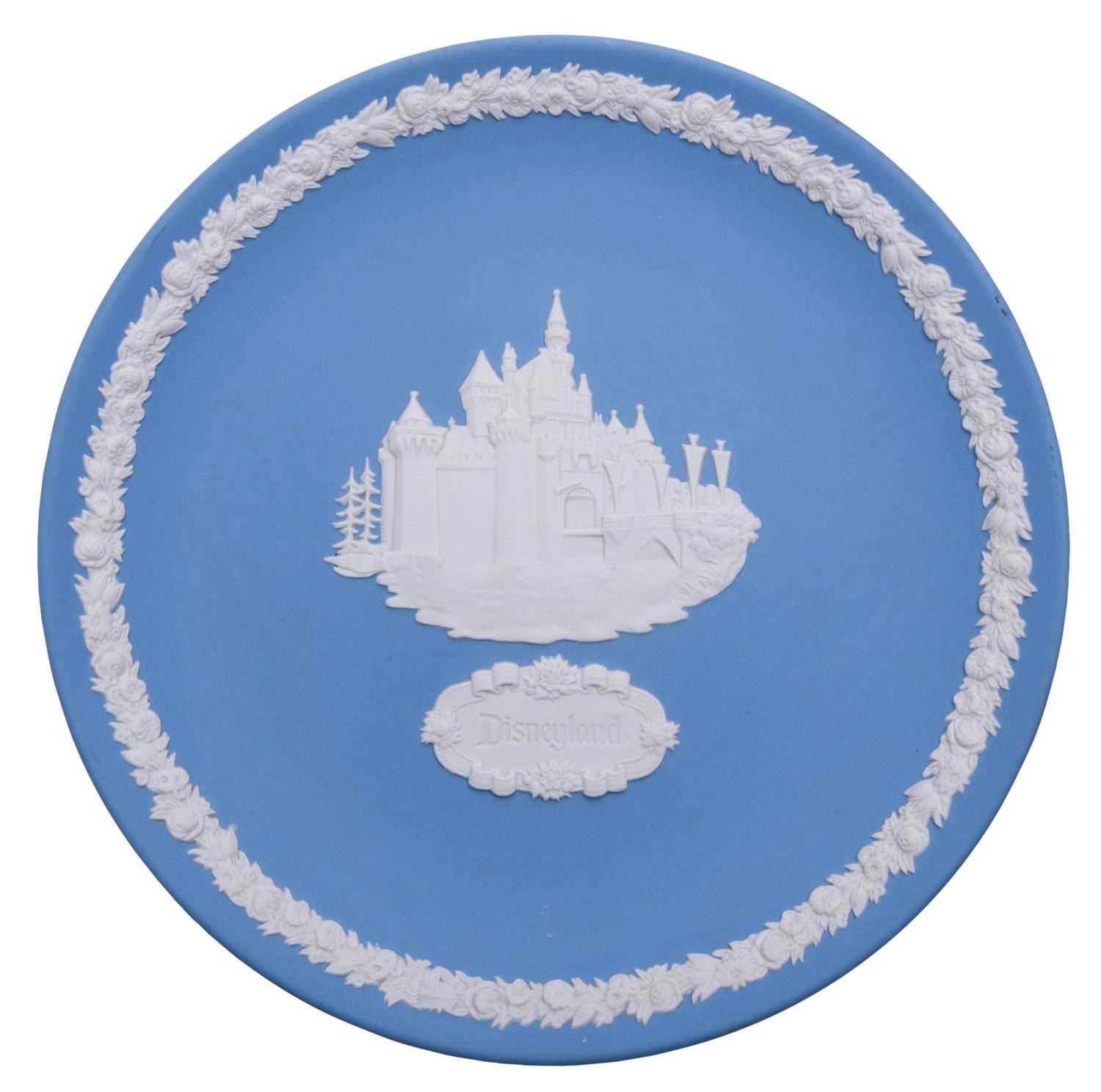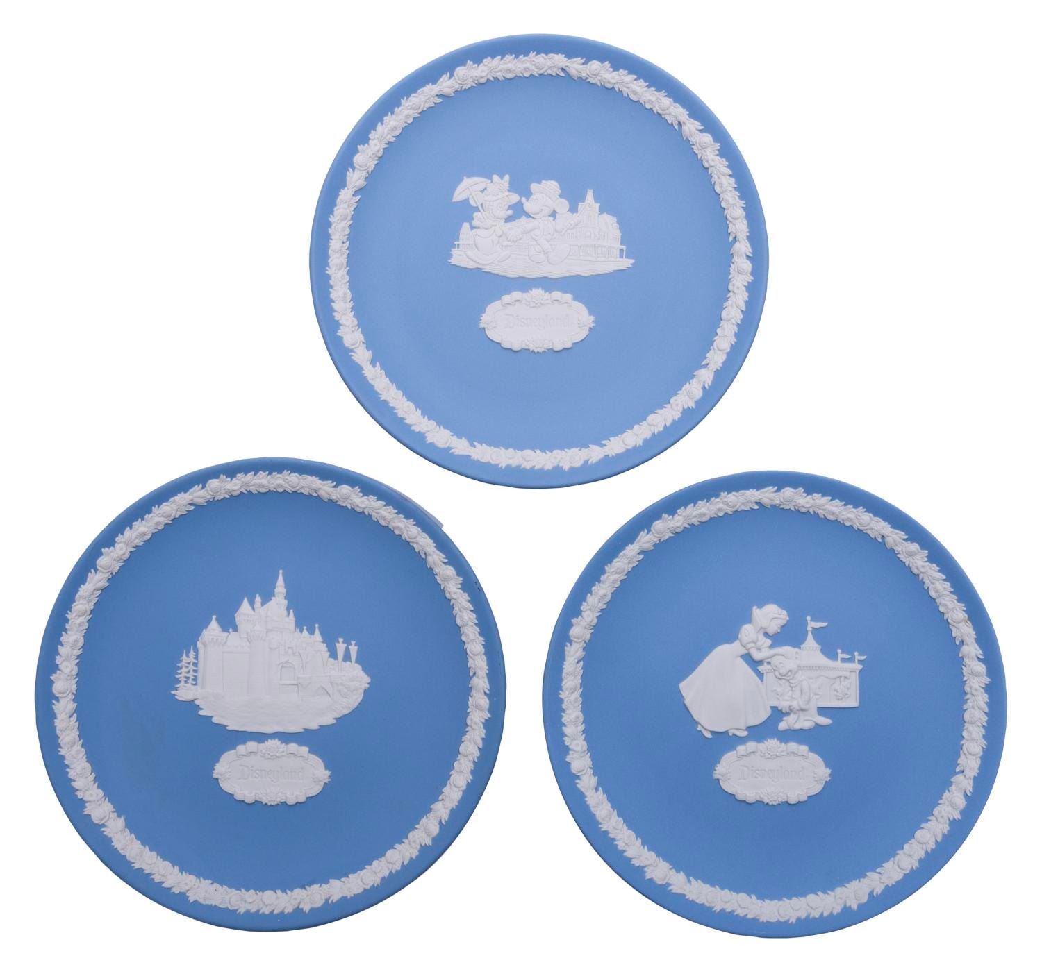 (Disneyland, 1978) A set of three Wedgwood plates featuring relief imagery of Sleeping Beauty Castle, Main Street U.S.A, and King Arthur's Carousel within a highly decorative border. Each plate is part of a limited edition of 5000 and measures 6.5" in diameter. The plates are in fine condition.