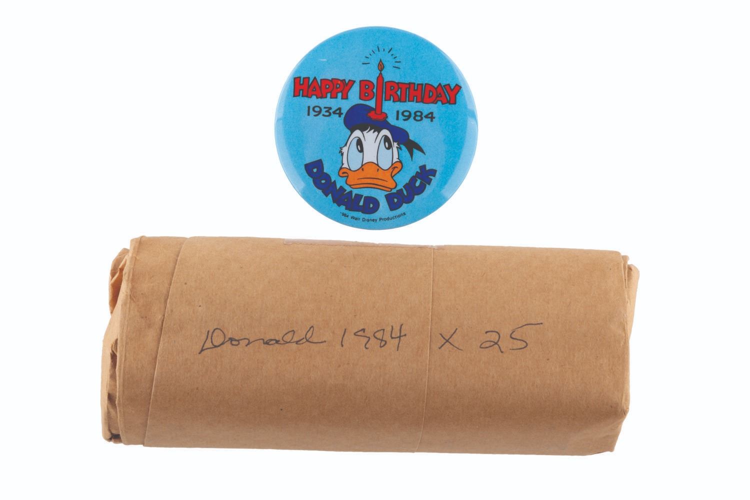 (Disney, 1994) A collection of 25 sealed buttons and one loose button from the celebration of Donald Duck's 60th birthday. Measuring 2.5 " in diameter, the loose button is in very good condition with light scratches, while the sealed buttons are in presumed fine condition.