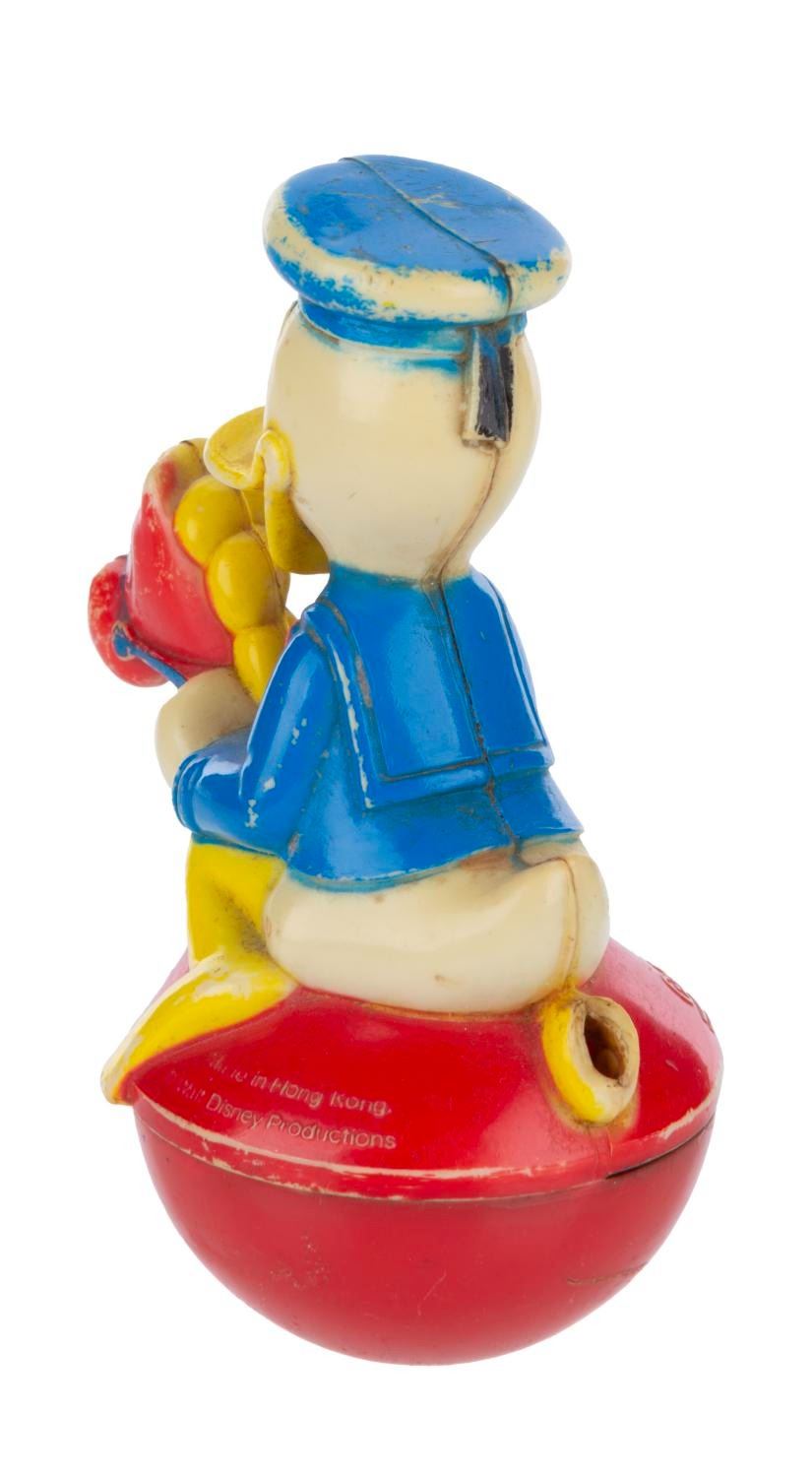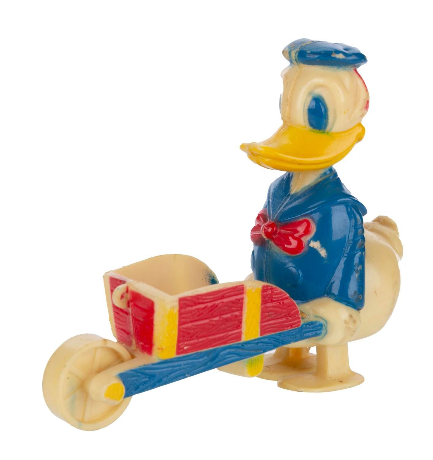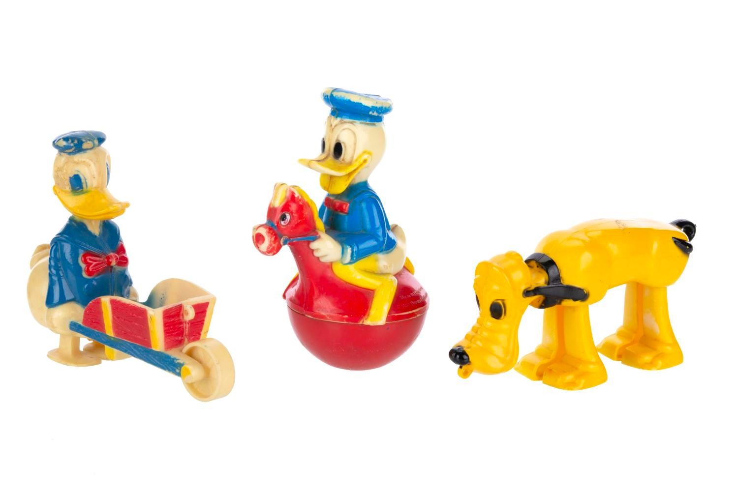 (MARX/Gabriel, 1966/78) A Pluto Ramp Walker and a Donald Duck Ramp Walker by MARX, and a Donald Duck vinyl toy by Gabriel CBS Toys. Measuring 3.75"x2.75" to 4.25"x2', each toy is in good condition with fading, scuffs, loosening, and wear.