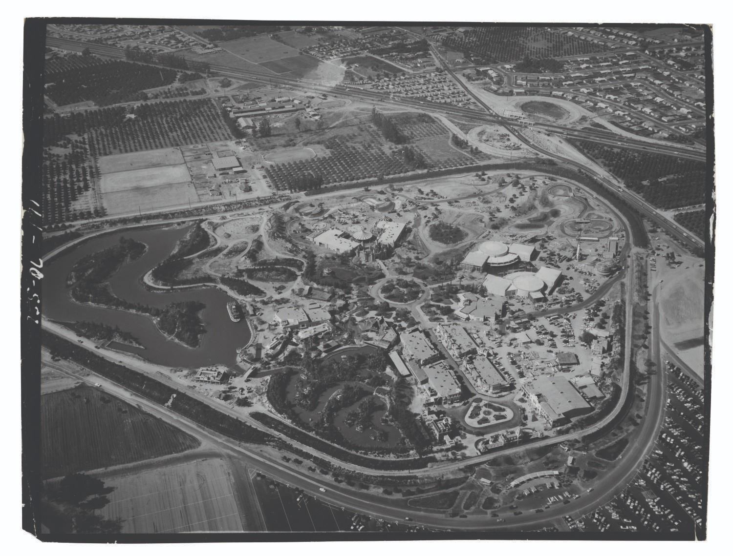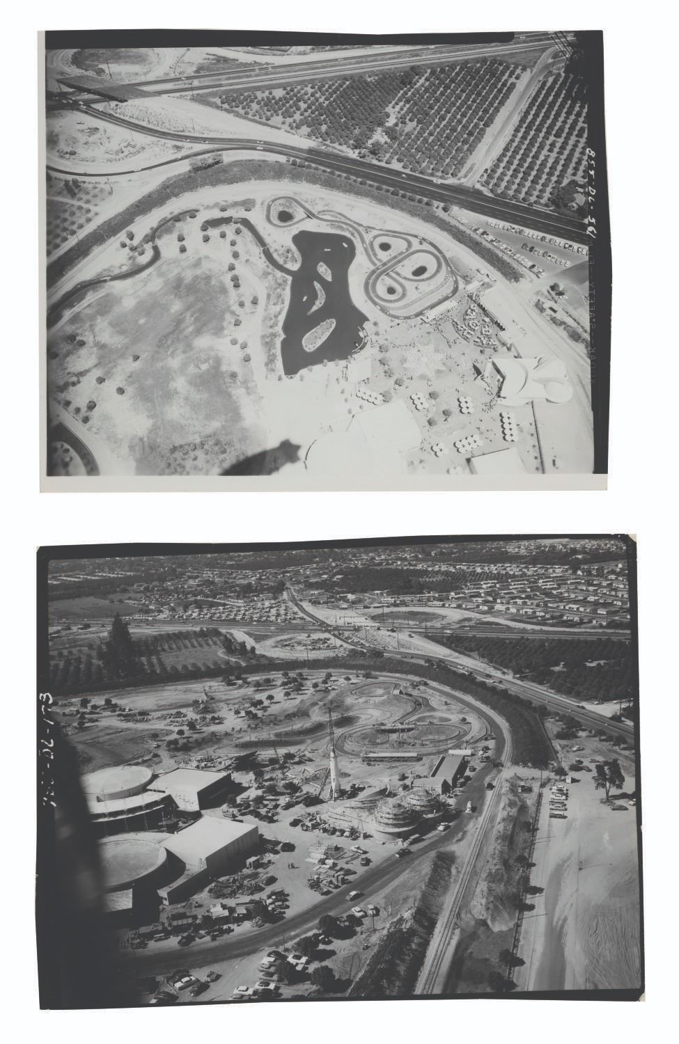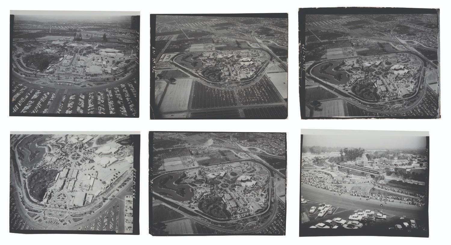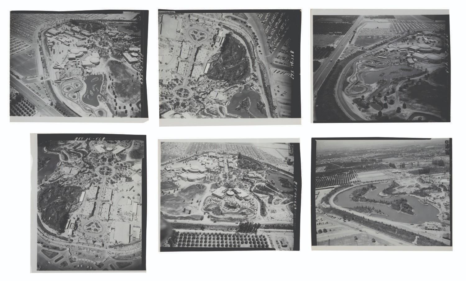 (Disneyland, 1955) A collection of 14 rare early aerial photos of Disneyland Park. Dated from July to September of 1955, these prints give views from above the whole of Disneyland including historic views of pre-opening construction by the Rivers of America and behind Tomorrowland, the Phantom Boats, huge lines outside the Main Gate, and more. These 4" x 5" contact prints were made directly from Disneyland Publicity's original camera negatives. As many of Publicity’s negatives were later culled, some of these prints may be the best if not only surviving copies of these images. The 4" x 5" glossy contact prints are in very good condition, with light wear from handling.