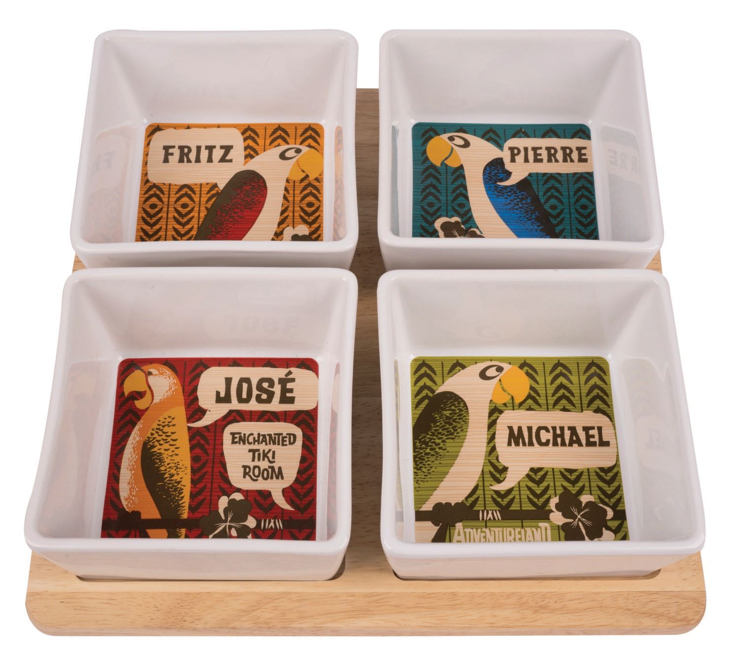 (Disney Parks, 2014) An Adventureland Collection Tiki Appetizer Set released at Disney Parks in 2014. The set contains (4) appetizer bowls featuring the colorful Tiki Room Bird Cast – Fritz, Michael, Jose, and Pierre atop a wooden tray. Each bowl measures 5"x5" and 2.75" deep while the wooden serving tray is 11.75"x11.75", each piece in fine unused condition in original product box.