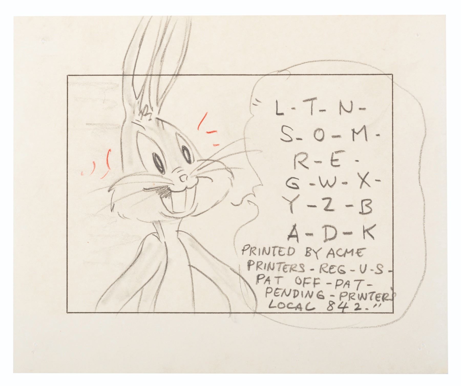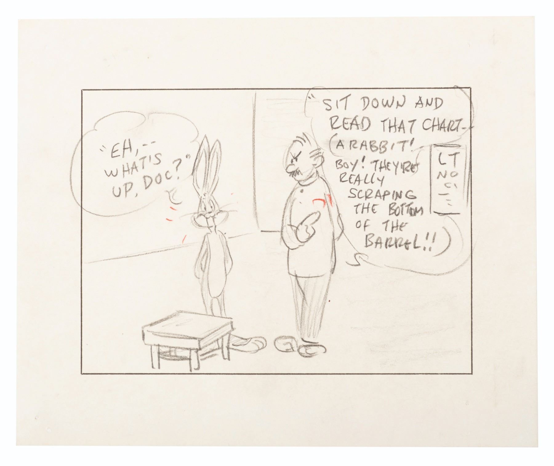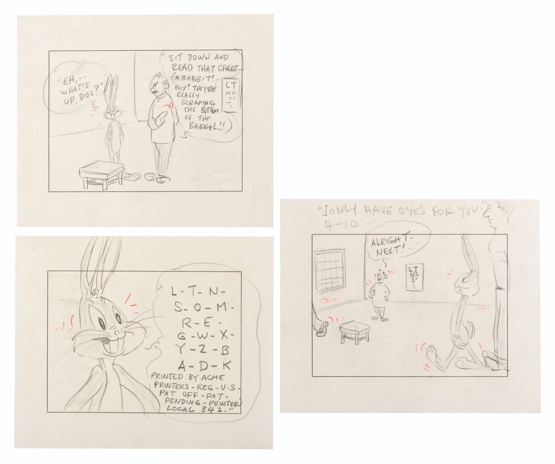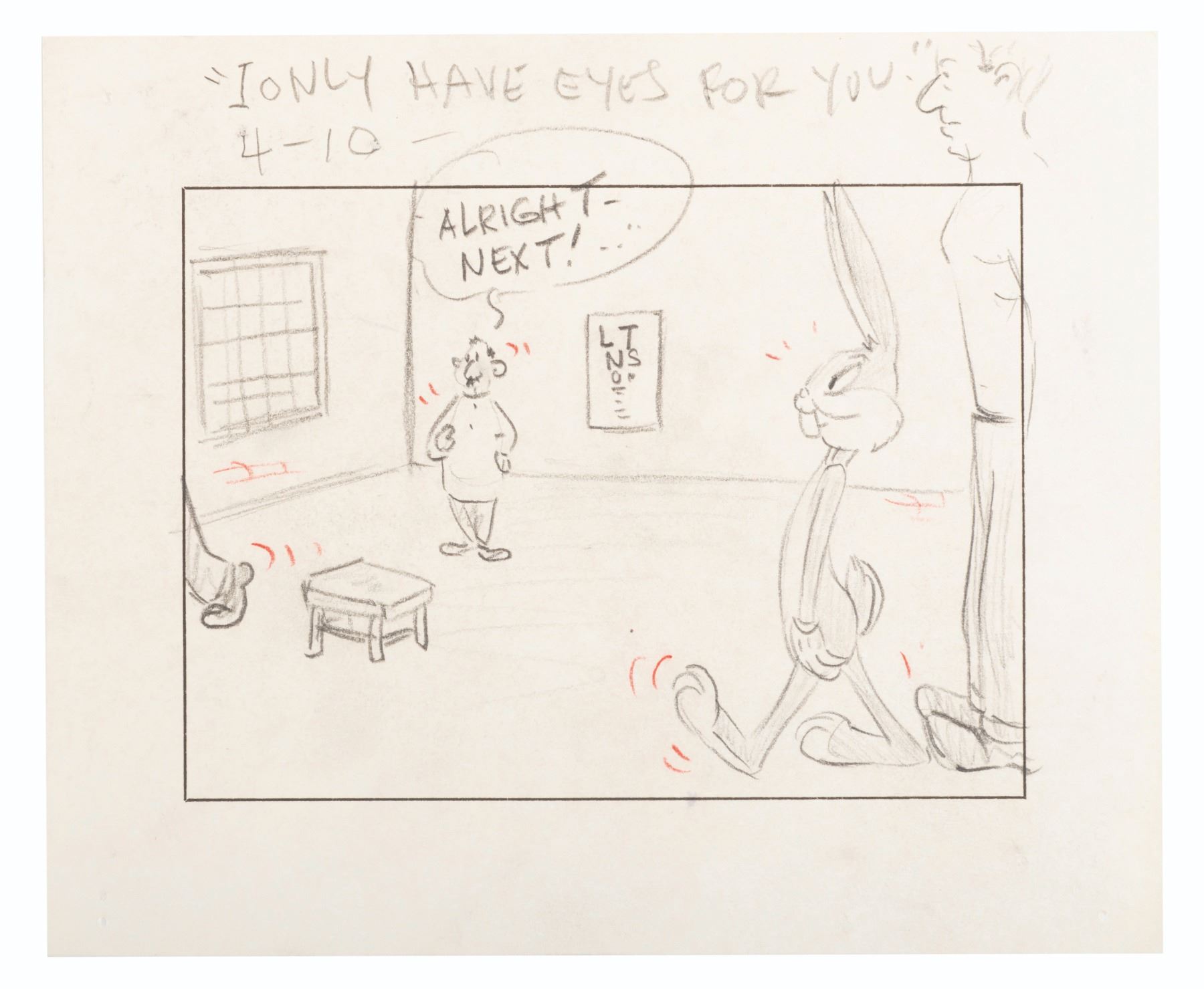(Warner Bros., 1953) A set of three original storyboard panels featuring Bugs Bunny from the Looney Tunes short “Forward March Hare.” Accomplished in graphite and colored pencil and measuring 5.75” x 7”, the panels are in very good condition with light edge wear and pinholes from production use, and light discoloration from age.