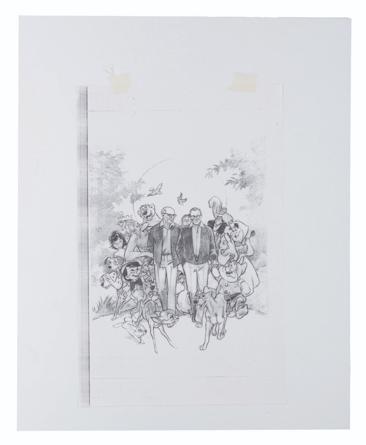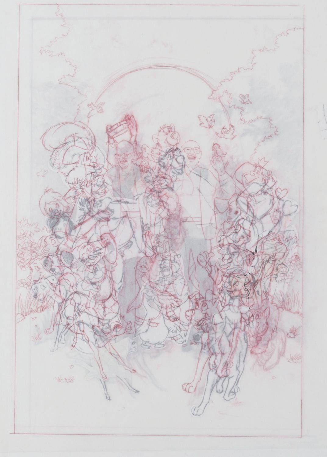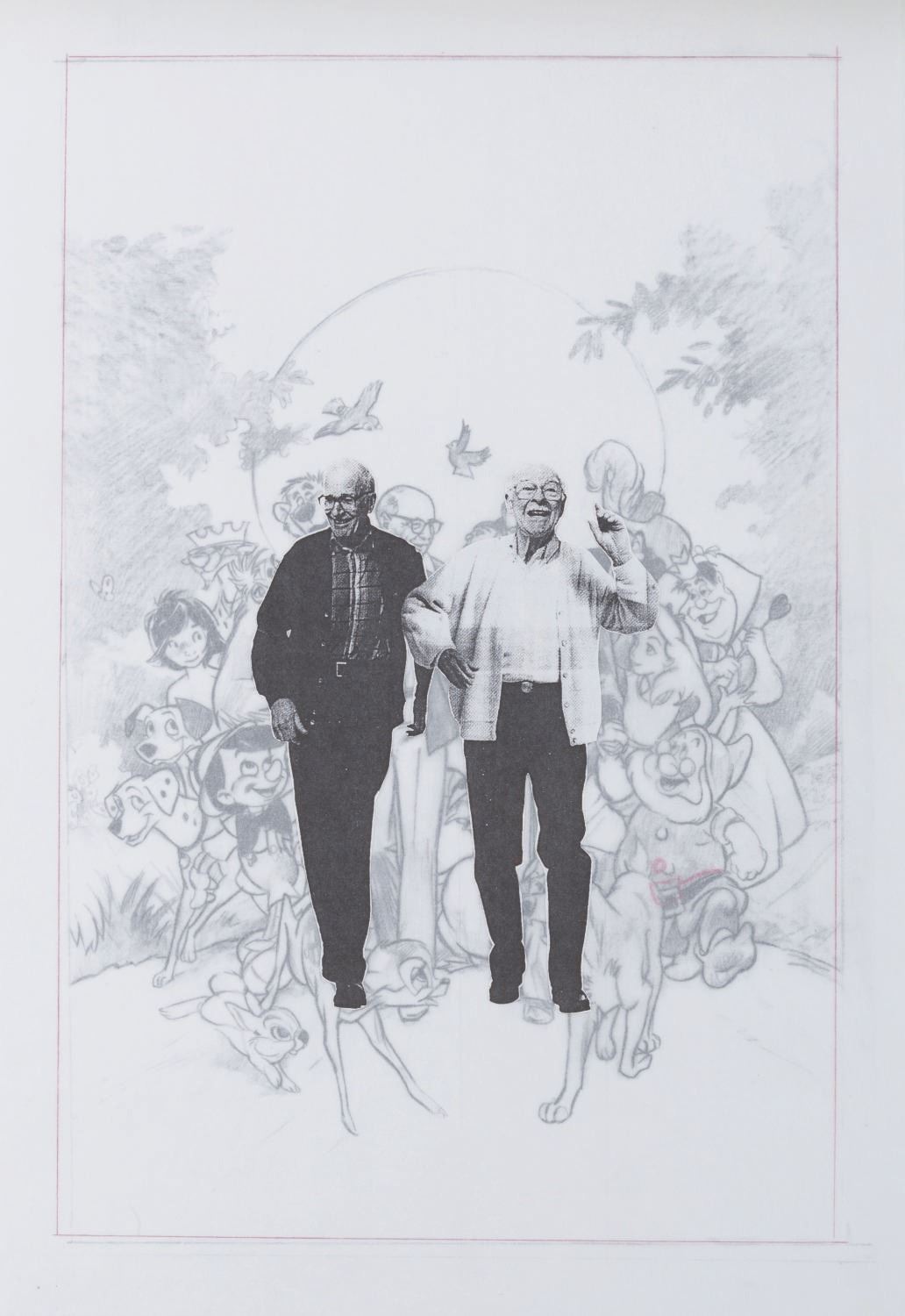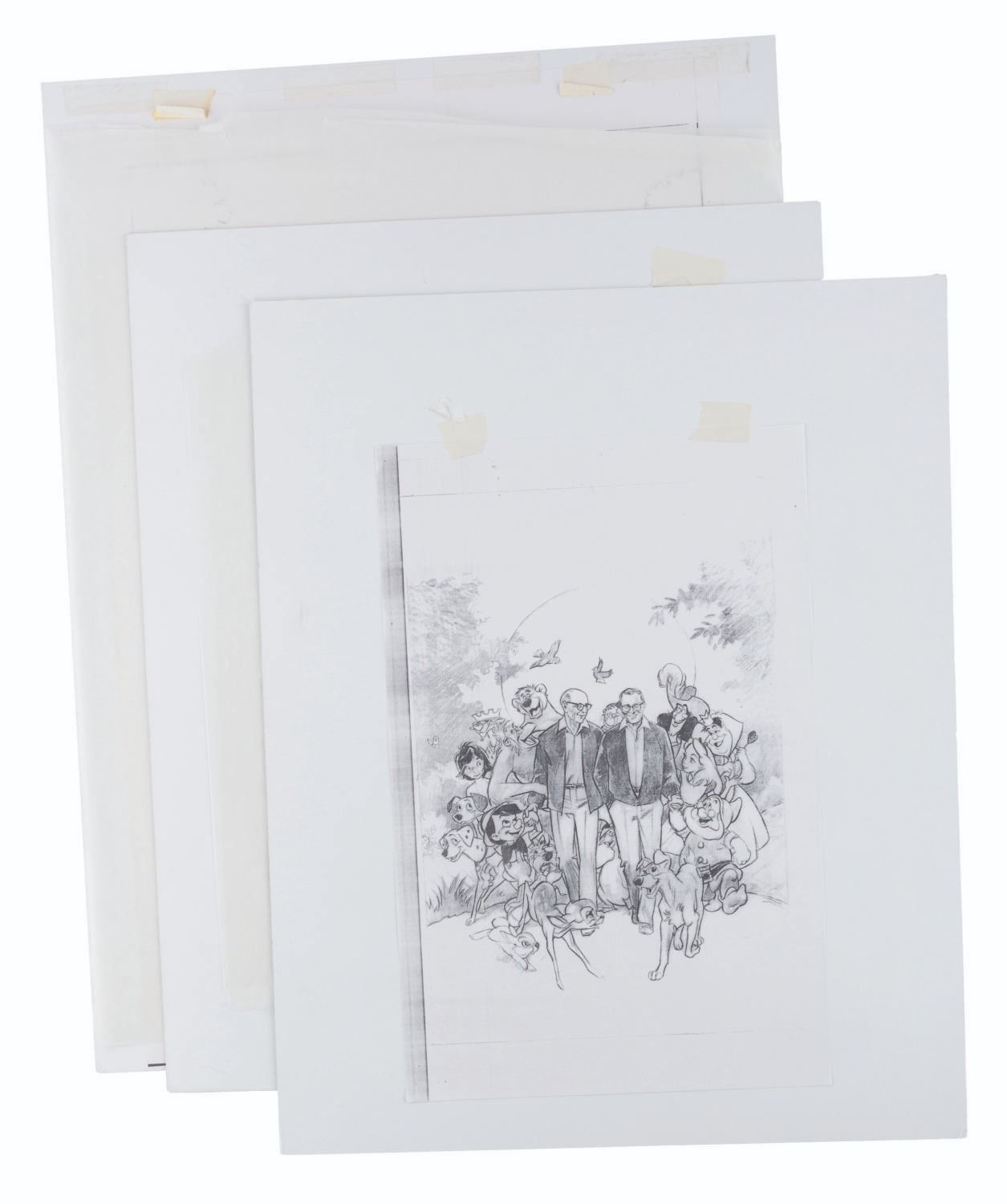 (Disney, 1995) Three printed poster development concepts for the documentary "Frank and Ollie" on the life and careers of Disney Legends Frank Thomas and Ollie Johnston, directed by Frank's son Theodore. The concepts feature hand-drawn Disney characters surrounding their animators, accomplished in red colored pencil on four layers of vellum. With image sizes ranging from 9.5" x 11.5" to 15" x 19" adhered to boards from 18" x 22" to 19" x 26", the drawings and printed concepts are in good condition with tears up to 3" long in the vellum and edge wear from production use.