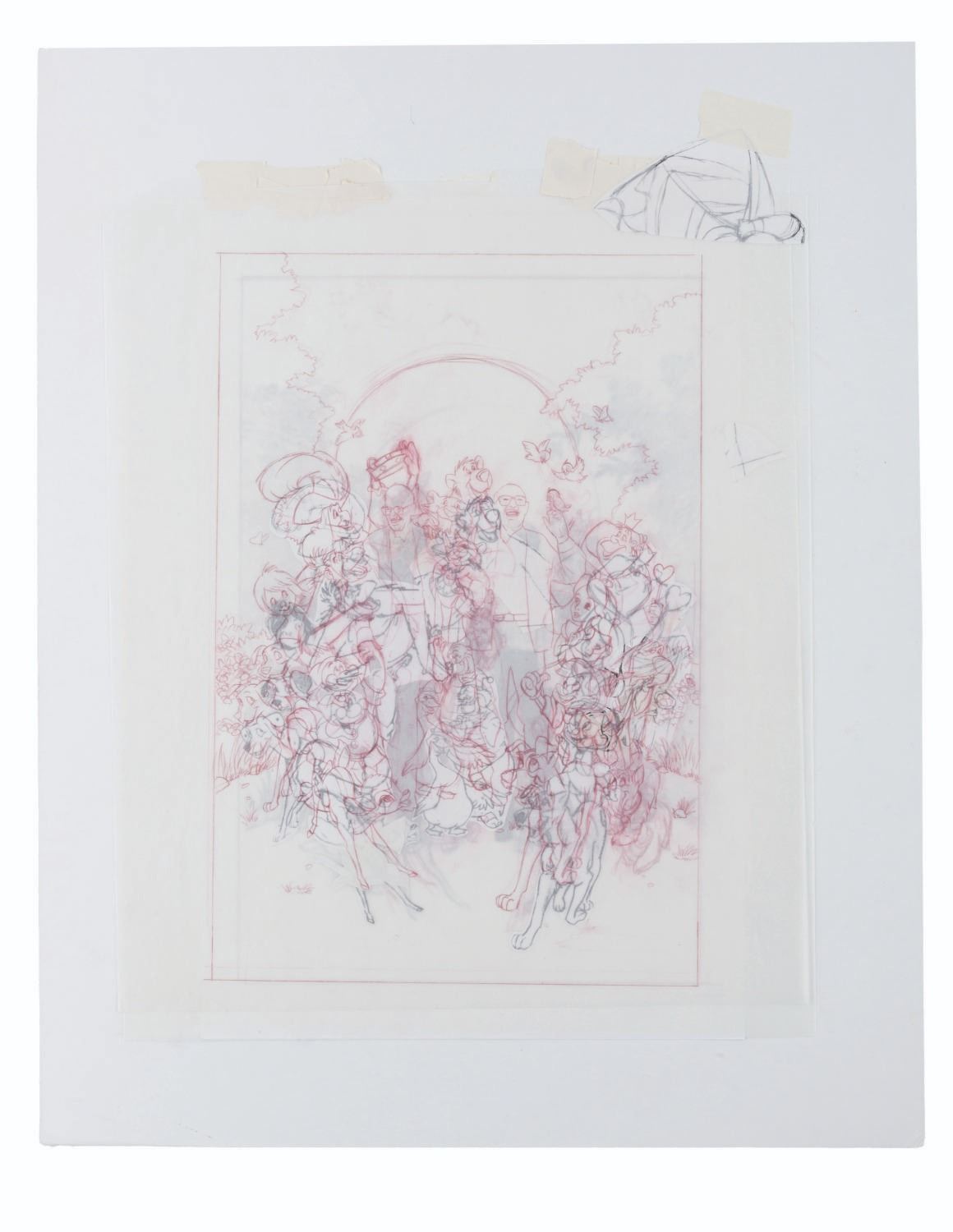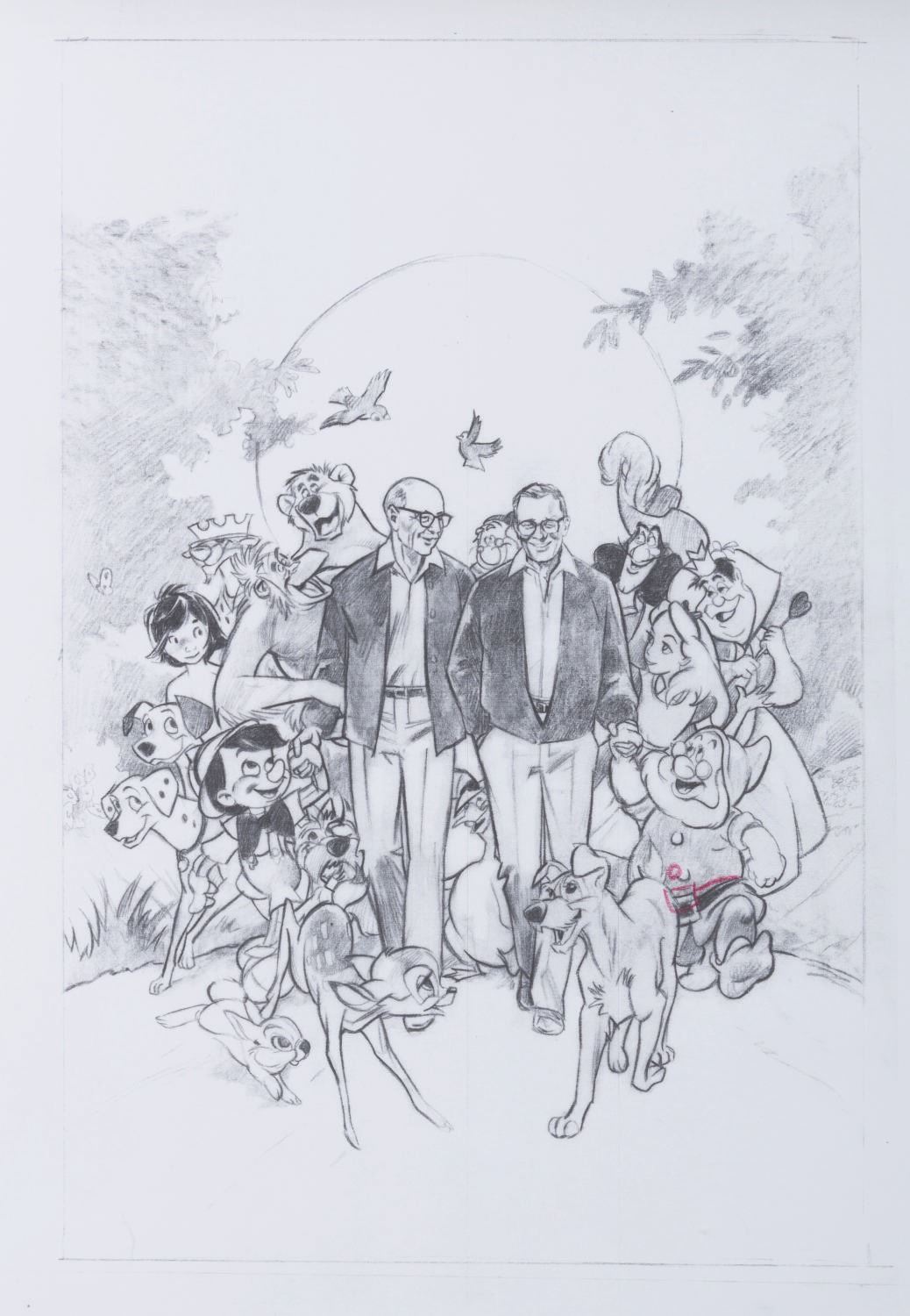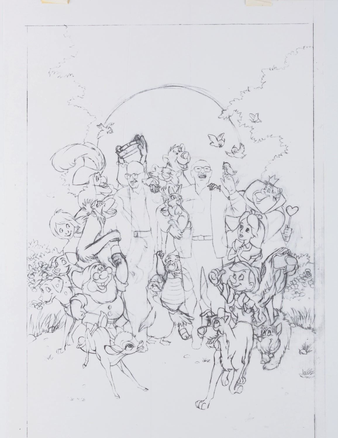 (Disney, 1995) Three printed poster development concepts for the documentary "Frank and Ollie" on the life and careers of Disney Legends Frank Thomas and Ollie Johnston, directed by Frank's son Theodore. The concepts feature hand-drawn Disney characters surrounding their animators, accomplished in red colored pencil on four layers of vellum. With image sizes ranging from 9.5" x 11.5" to 15" x 19" adhered to boards from 18" x 22" to 19" x 26", the drawings and printed concepts are in good condition with tears up to 3" long in the vellum and edge wear from production use.