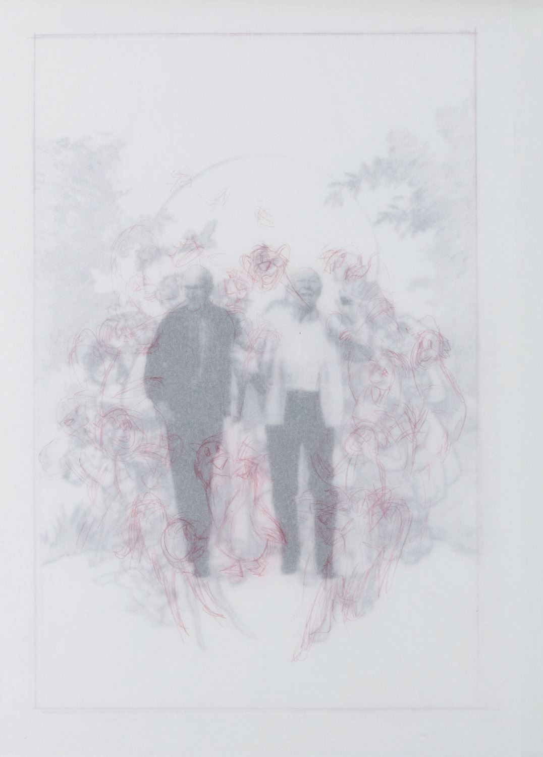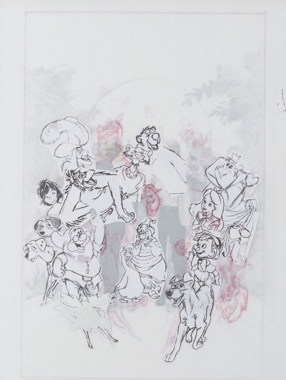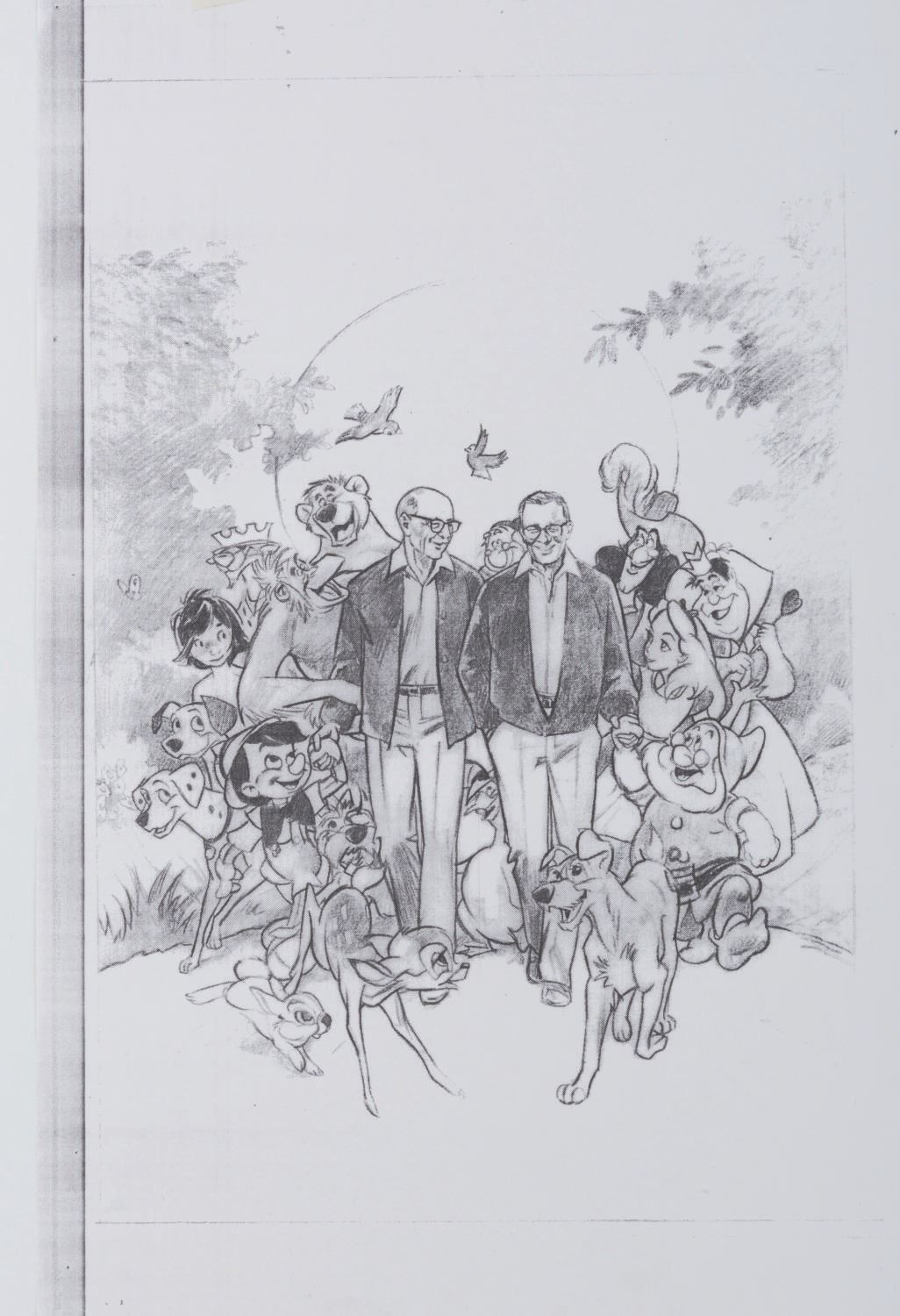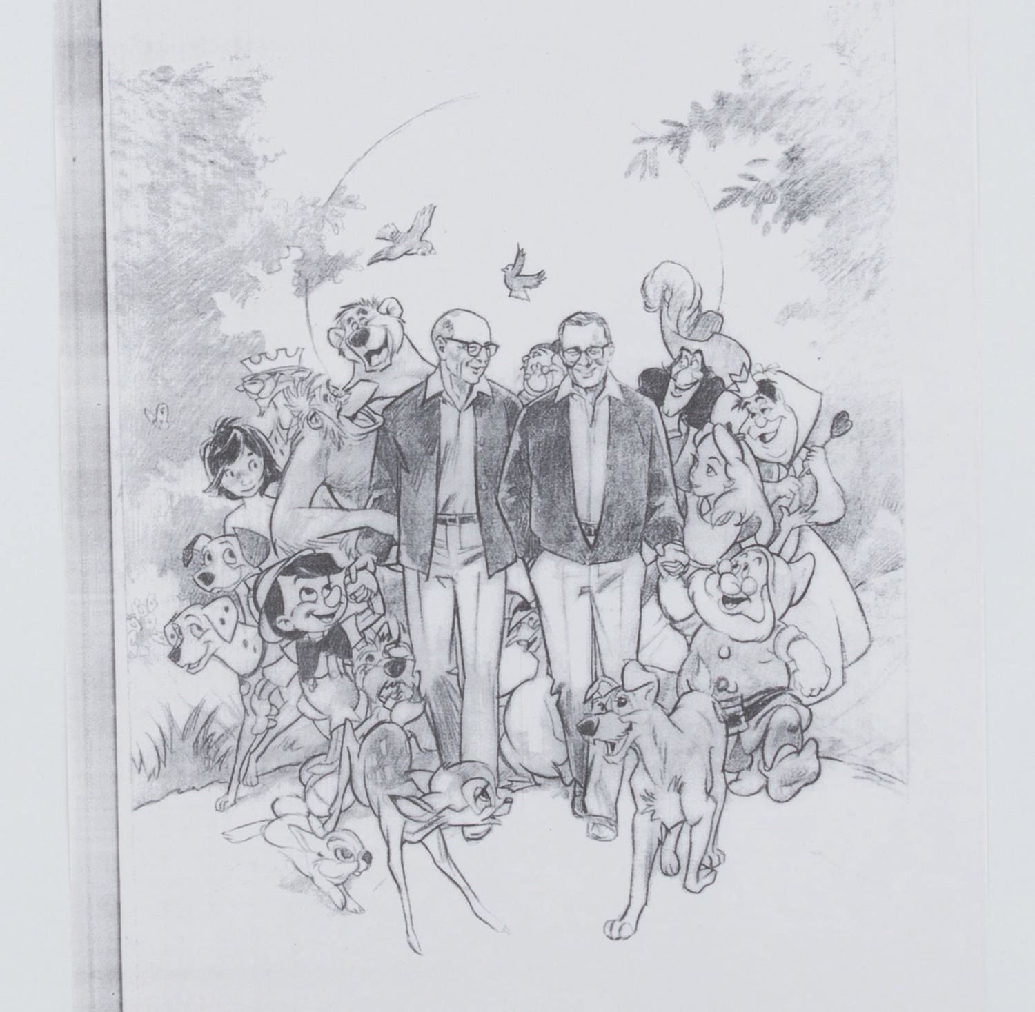(Disney, 1995) Three printed poster development concepts for the documentary "Frank and Ollie" on the life and careers of Disney Legends Frank Thomas and Ollie Johnston, directed by Frank's son Theodore. The concepts feature hand-drawn Disney characters surrounding their animators, accomplished in red colored pencil on four layers of vellum. With image sizes ranging from 9.5" x 11.5" to 15" x 19" adhered to boards from 18" x 22" to 19" x 26", the drawings and printed concepts are in good condition with tears up to 3" long in the vellum and edge wear from production use.