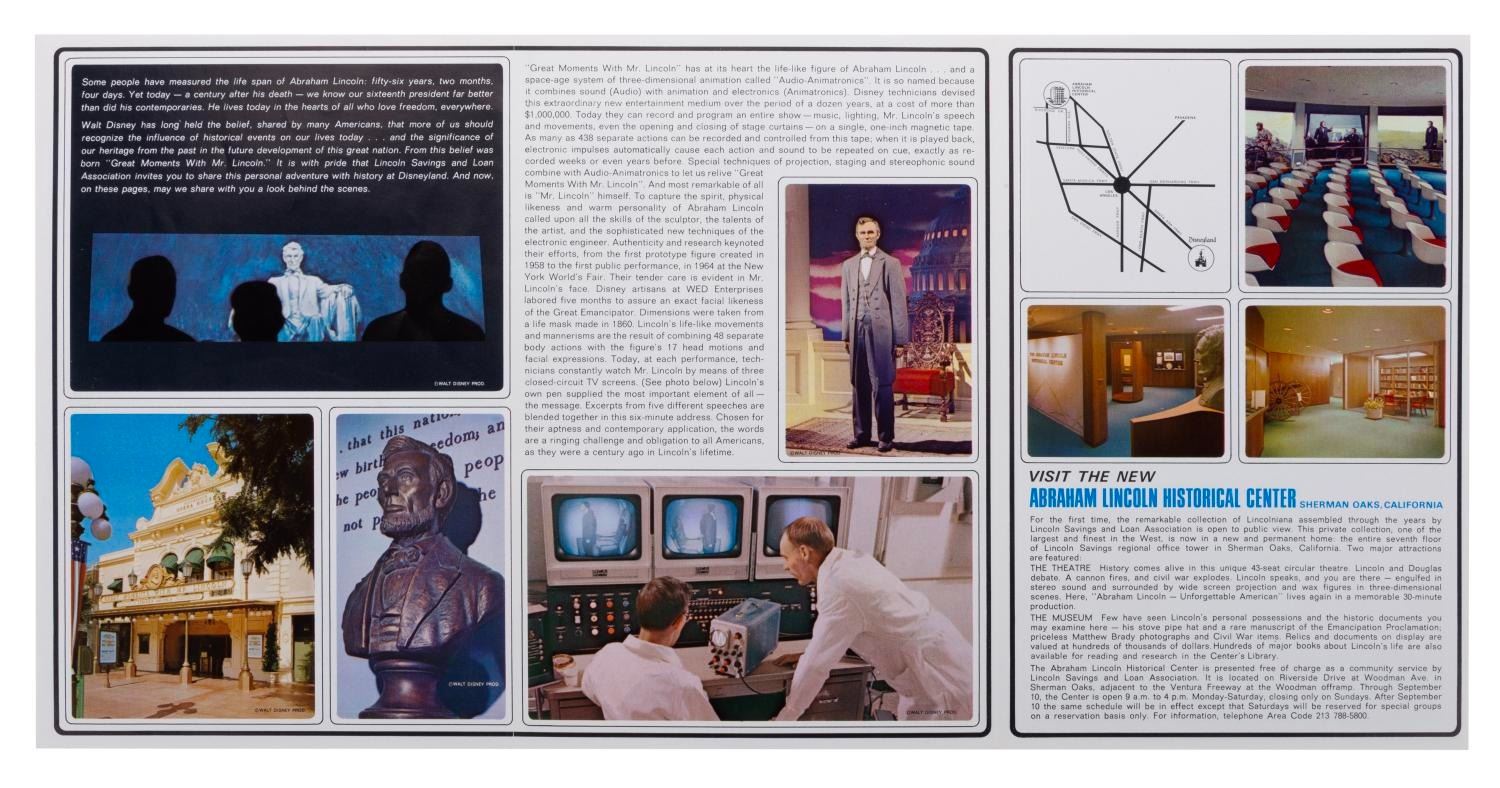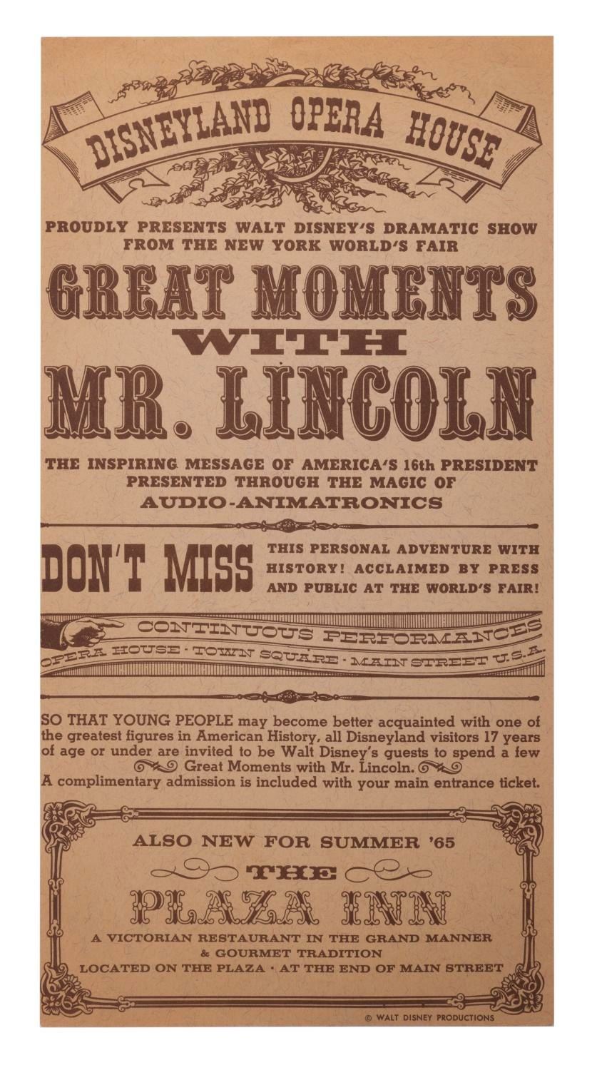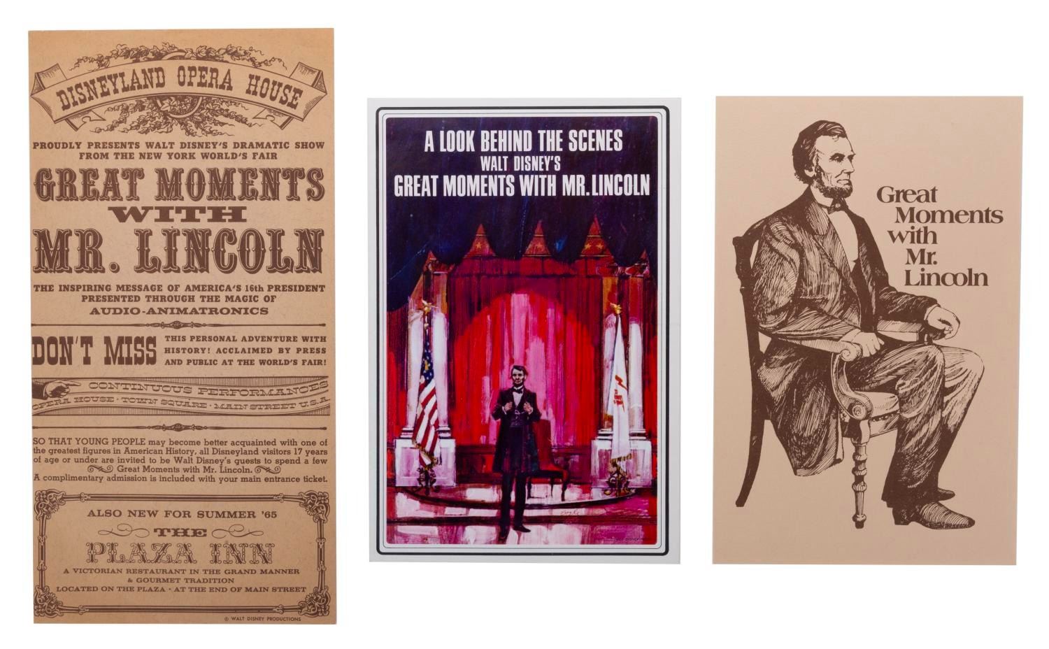 (Disneyland, 1965-1990s) Four souvenirs of Great Moments with Mr. Lincoln. Included are a very rare opening-year handbill, "A Look Behind The Scenes of Great Moments with Mr. Lincoln" booklet, and two 1990s brochures. Measuring 5.5"x8.5" to 5.75"x11", the pieces are in very good condition, exhibiting edge wear to the handbill.