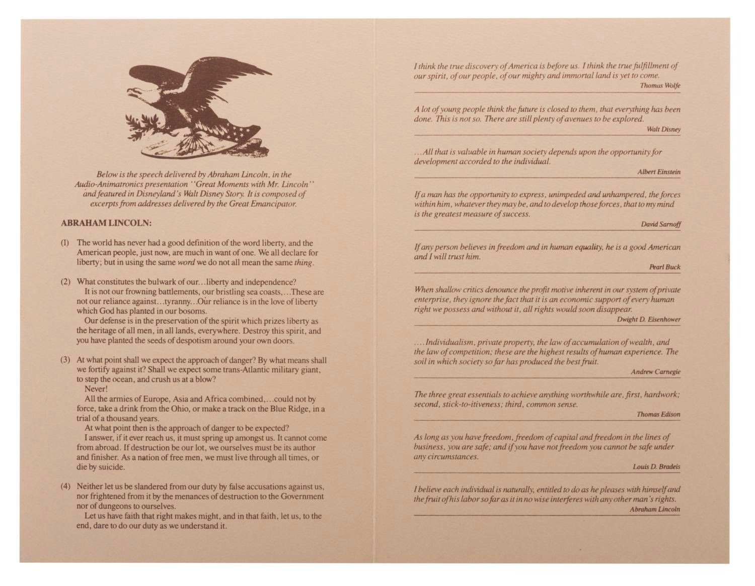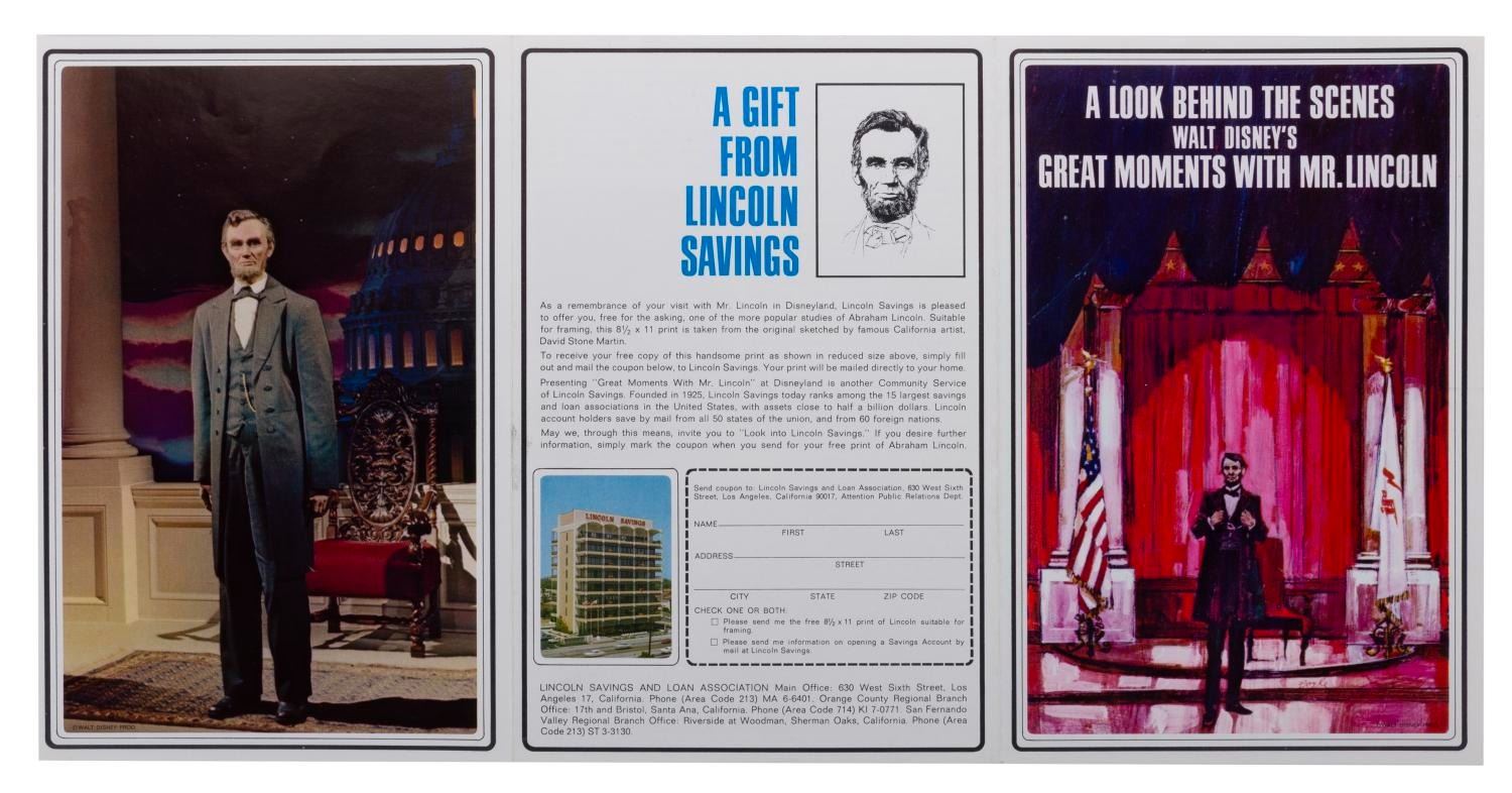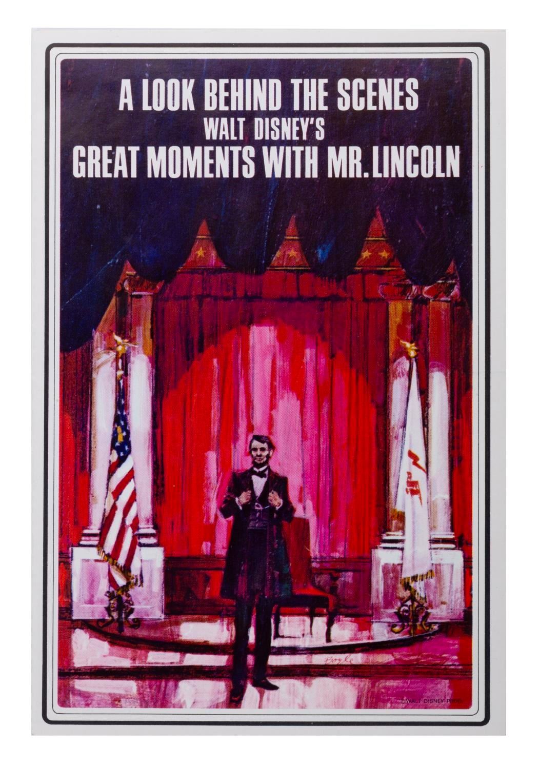 (Disneyland, 1965-1990s) Four souvenirs of Great Moments with Mr. Lincoln. Included are a very rare opening-year handbill, "A Look Behind The Scenes of Great Moments with Mr. Lincoln" booklet, and two 1990s brochures. Measuring 5.5"x8.5" to 5.75"x11", the pieces are in very good condition, exhibiting edge wear to the handbill.