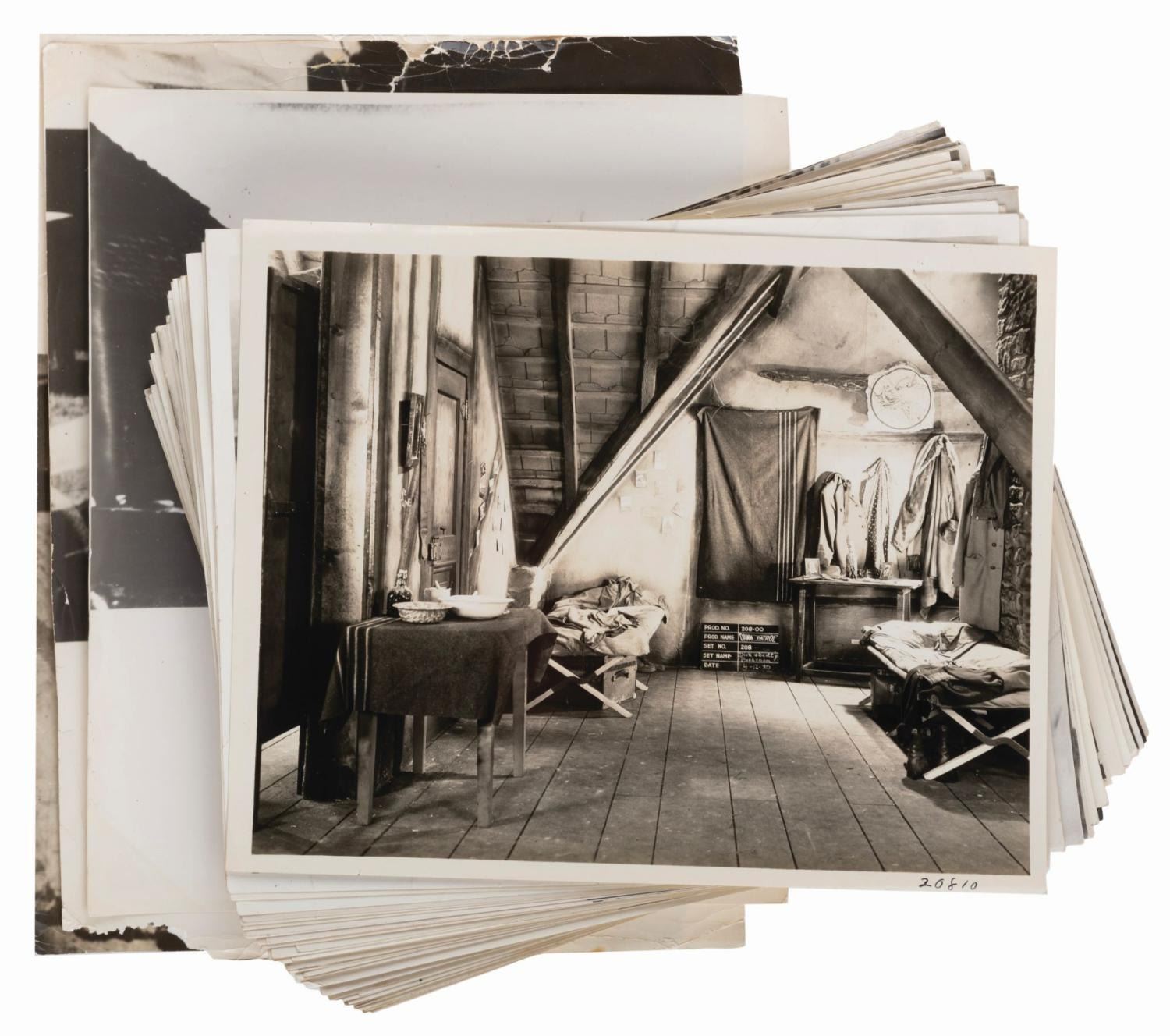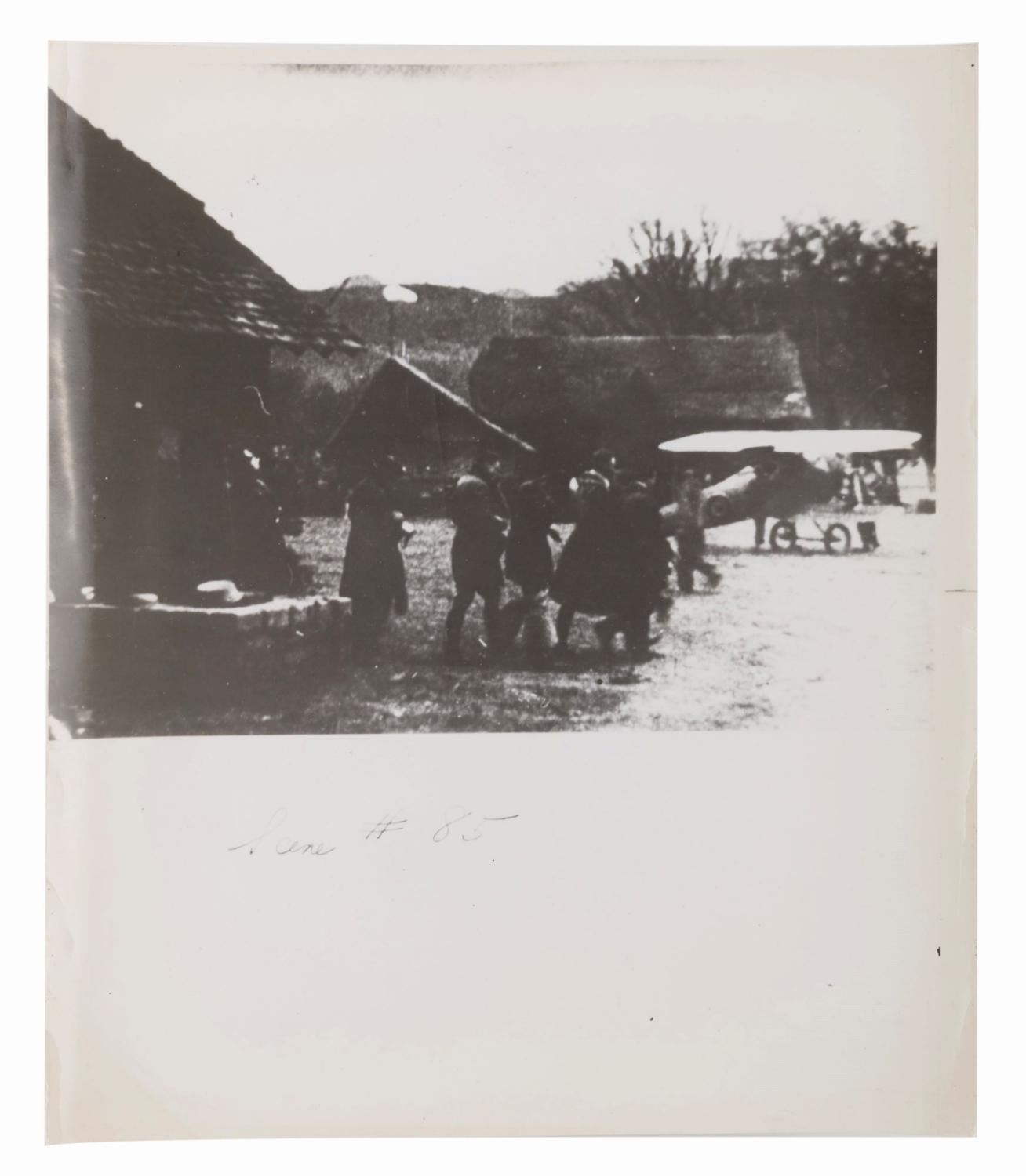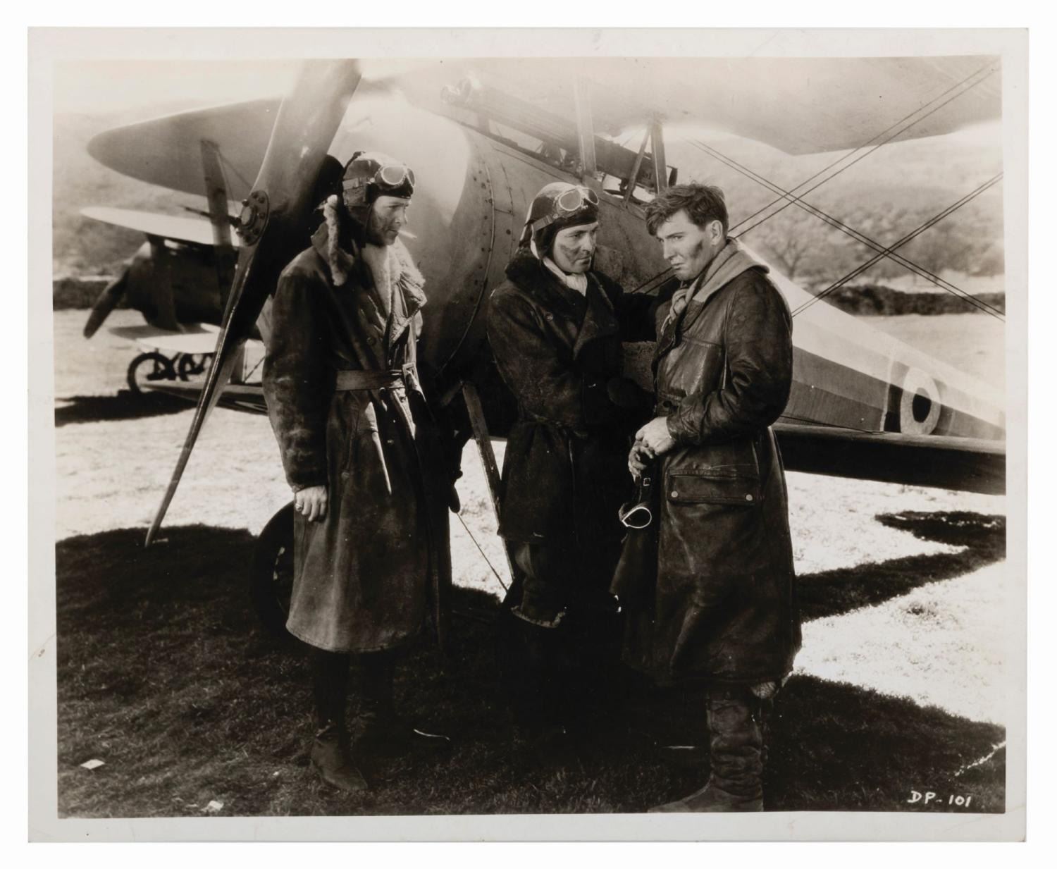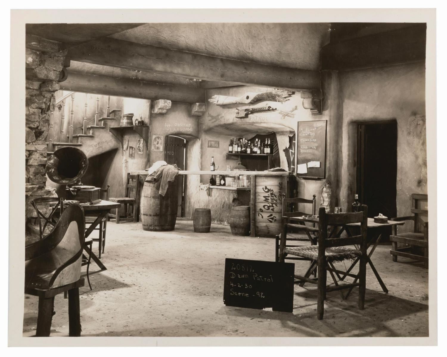 (First National Pictures, 1930) A collection of 60 photographs taken during the production of the war film "The Dawn Patrol." From the collection of Harper Goff, the photos capture empty sets, scenes from the film, and character stills. Early in his career, Goff worked as a set designer for a wide variety of films and studios, often uncredited for his work. Measuring 5" x 7" to 8.5" x 11.5", the photos are in good condition with some edge wear, spots of surface wear, and a couple of photos are torn. The two largest images have the most wear, with some small tears and creasing around the edges.