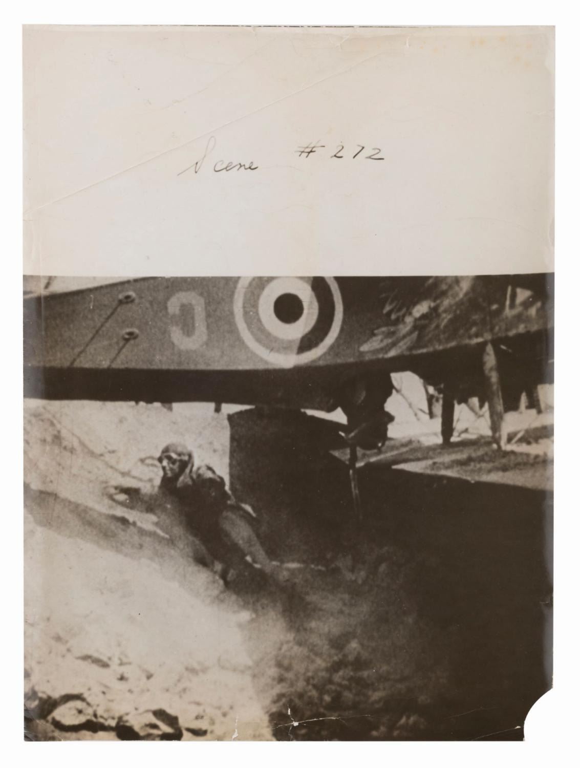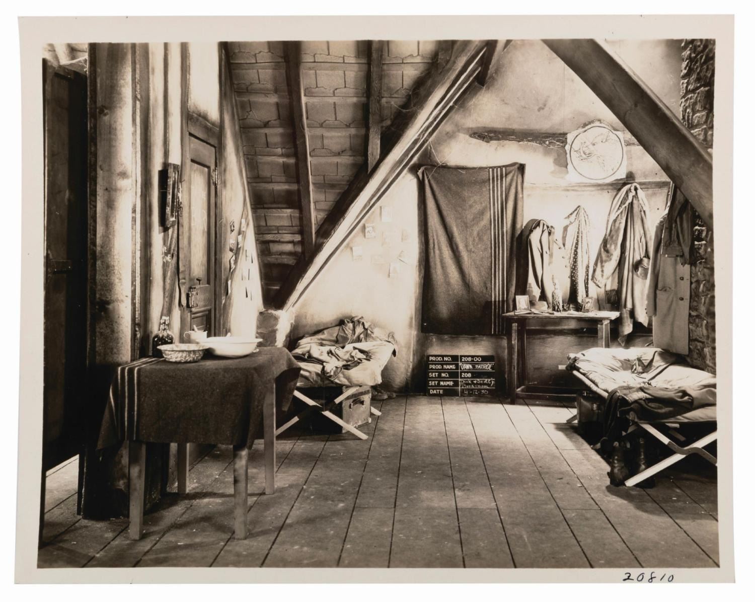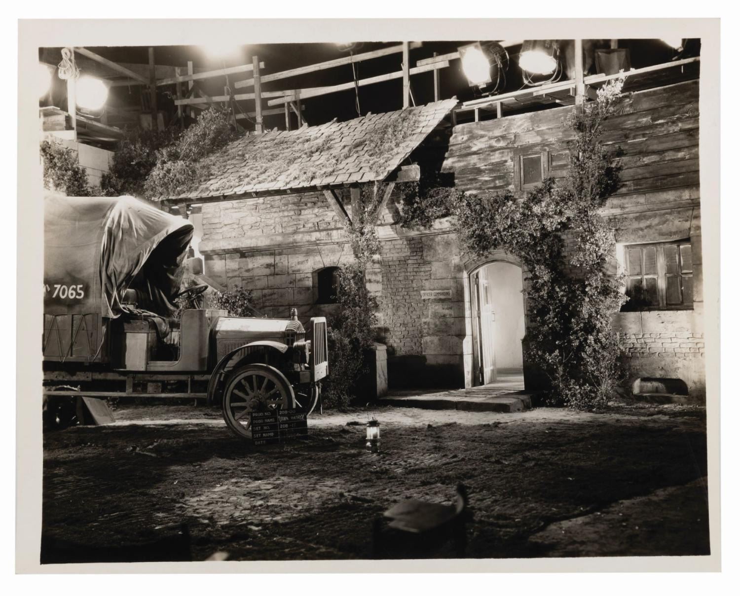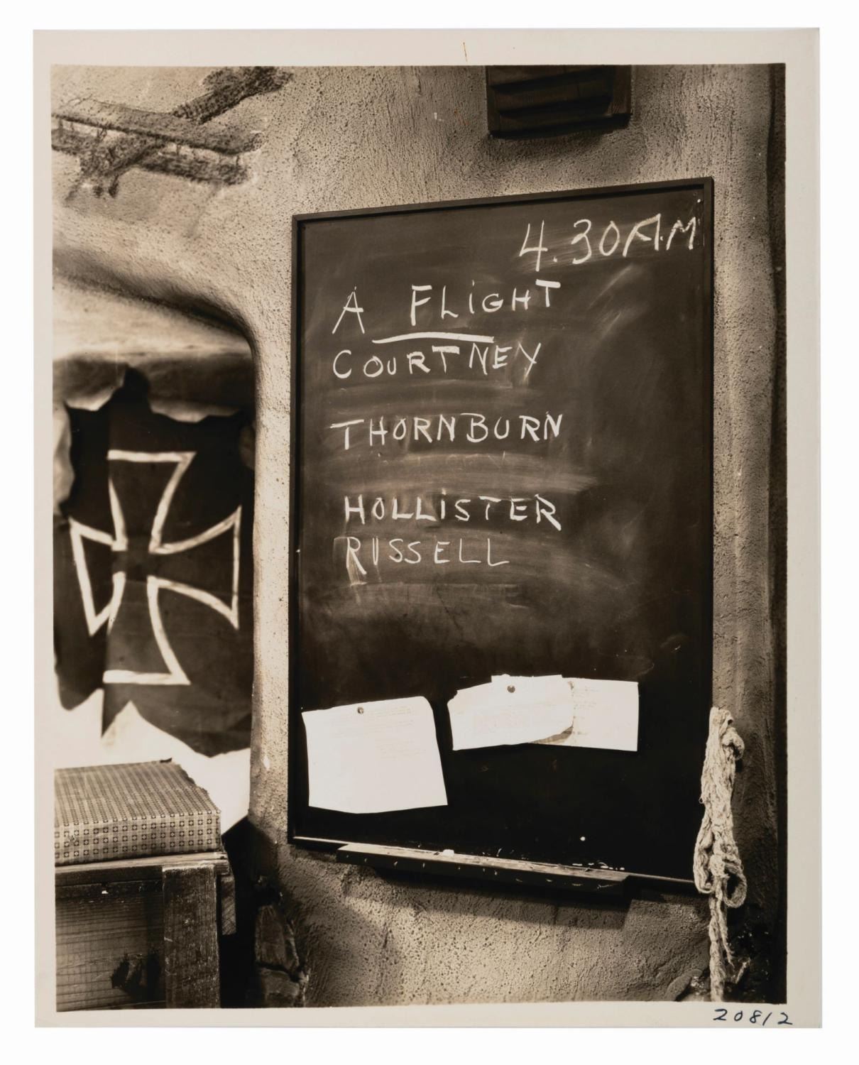 (First National Pictures, 1930) A collection of 60 photographs taken during the production of the war film "The Dawn Patrol." From the collection of Harper Goff, the photos capture empty sets, scenes from the film, and character stills. Early in his career, Goff worked as a set designer for a wide variety of films and studios, often uncredited for his work. Measuring 5" x 7" to 8.5" x 11.5", the photos are in good condition with some edge wear, spots of surface wear, and a couple of photos are torn. The two largest images have the most wear, with some small tears and creasing around the edges.