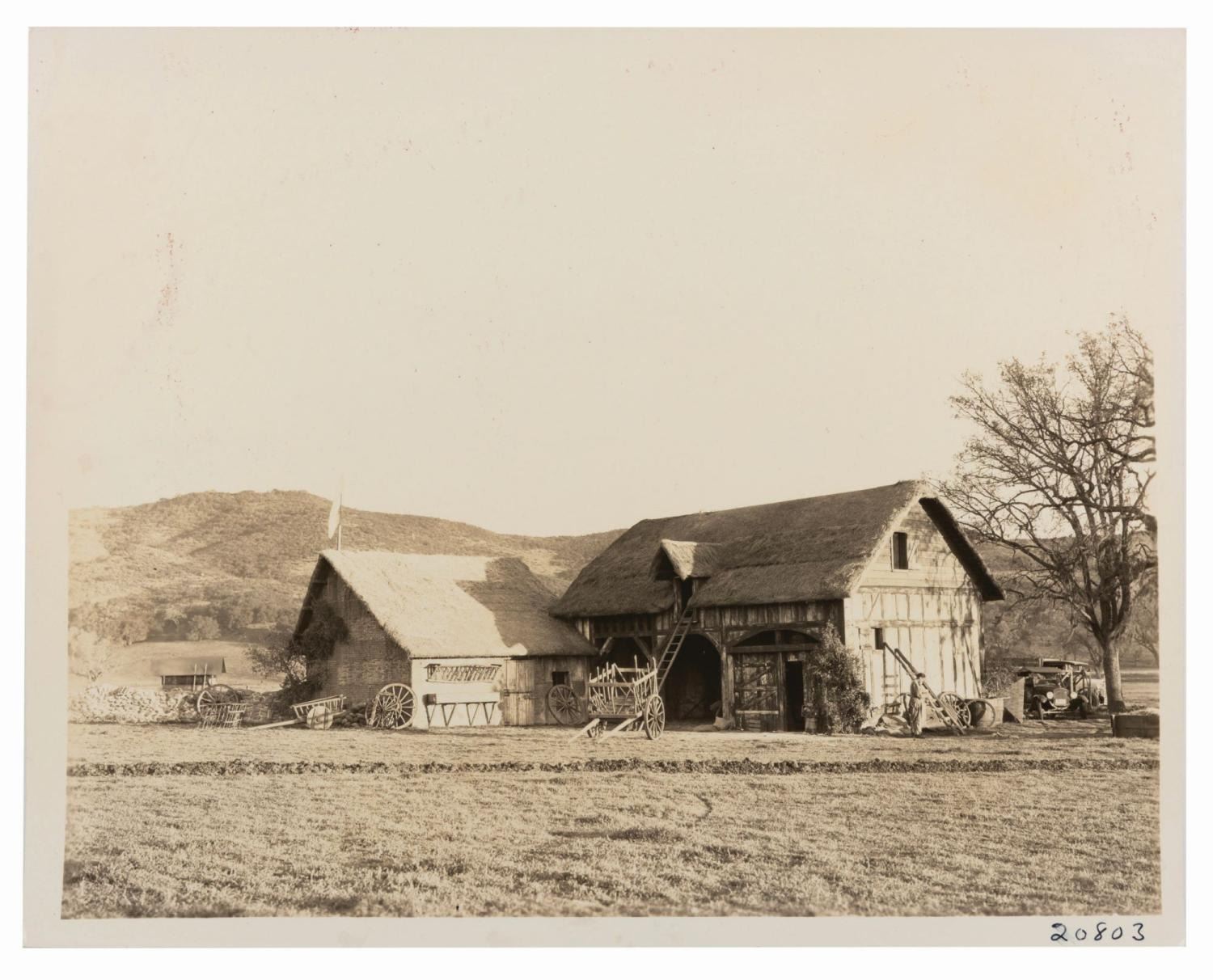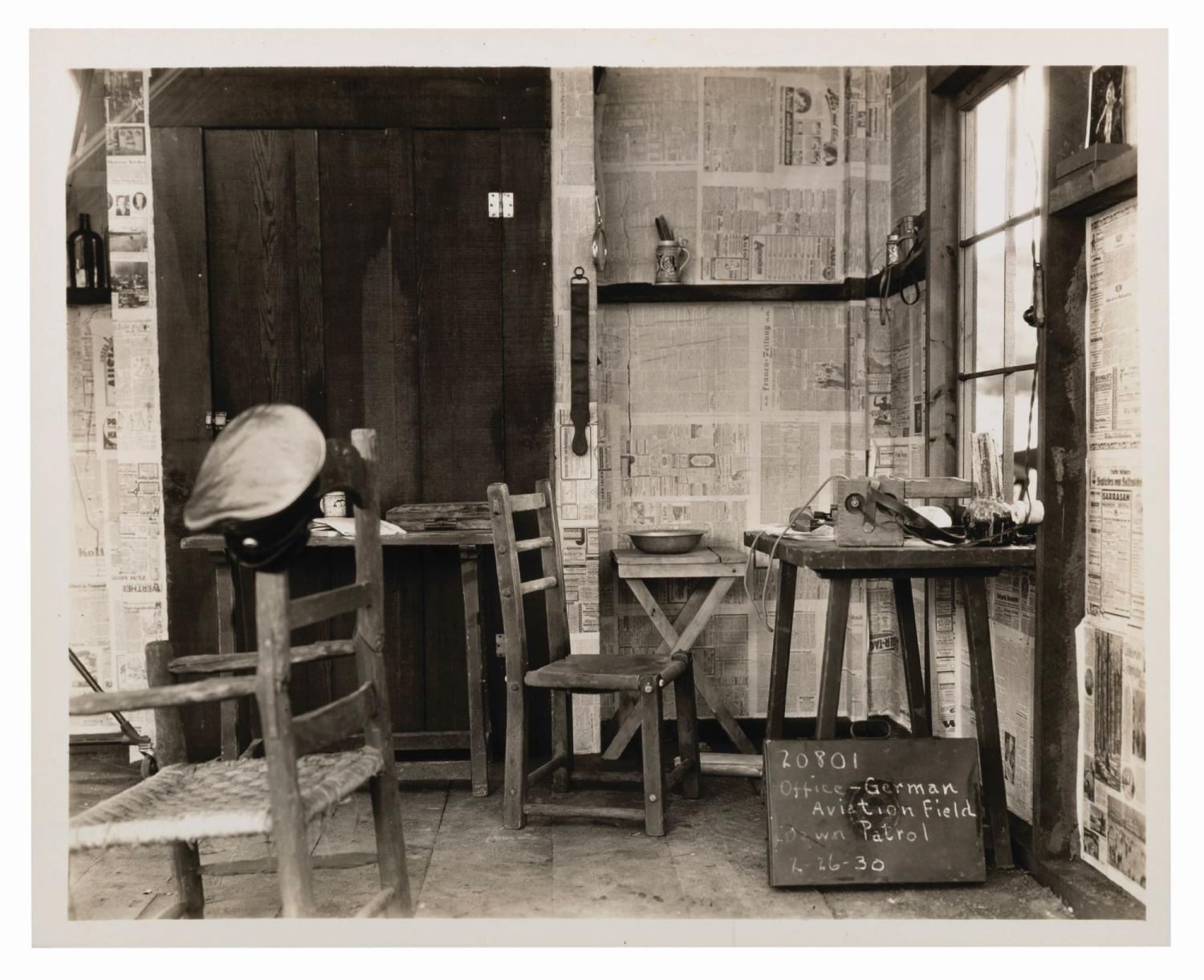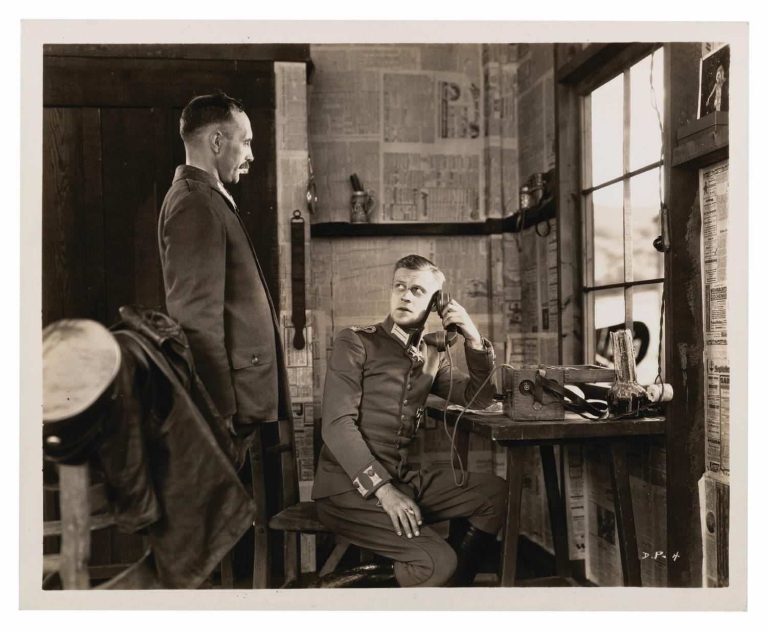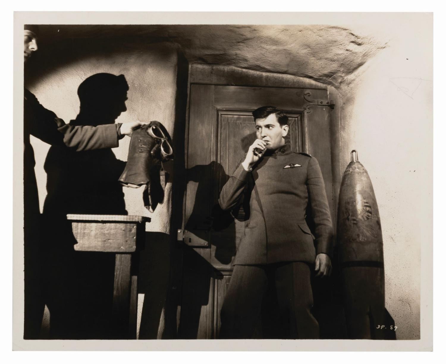 (First National Pictures, 1930) A collection of 60 photographs taken during the production of the war film "The Dawn Patrol." From the collection of Harper Goff, the photos capture empty sets, scenes from the film, and character stills. Early in his career, Goff worked as a set designer for a wide variety of films and studios, often uncredited for his work. Measuring 5" x 7" to 8.5" x 11.5", the photos are in good condition with some edge wear, spots of surface wear, and a couple of photos are torn. The two largest images have the most wear, with some small tears and creasing around the edges.
